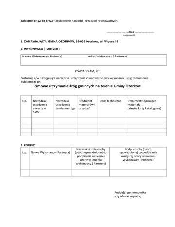 Załącznik nr 12 do SIWZ – Zestawienie narzędzi i urządzeń równoważnych. ............................, dnia ........................... miejscowość 1. ZAMAWIAJĄCY: GMINA OZORKÓW, 95-035 Ozorków, ul. Wigury 14 2. WYKONAWCA ( PARTNER ) Nazwa Wykonawcy ( Partnera) Adres Wykonawcy ( Partnera) OŚWIADCZAM, ŻE: Zastosuję n/w następujące narzędzia i urządzenia równoważne przy wykonaniu usług zamówienia publicznego pn: Zimowe utrzymanie dróg gminnych na terenie Gminy Ozorków L p. Narzędzia i urządzenia zawarte w SIWZ Narzędzia i urządzenia zamienne - typ Producent materiałów i urządzeń Dane techniczne Dokumenty opisujące materiały (atesty, karty katalogowe) 3. PODPISY L p. Nazwa Wykonawcy (Partnera) Nazwisko i imię osoby (osób) upoważnionej do podpisania niniejszej oferty w imieniu Wykonawcy ( Partnera) Podpis osoby (osób) upoważnionej do podpisania niniejszej oferty w imieniu Wykonawcy ( Partnera) Podpis(y) pełnomocnika przy ofercie wspólnej