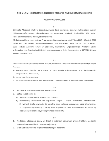 R E G U L A M I N KORZYSTANIA ZE ZBIORÓW MEDIATEKI AKADEMII SZTUKI W SZCZECINIE I. POSTANOWIENIA OGÓLNE §1 Biblioteka Akademii Sztuki w Szczecinie, zwana dalej Mediateką, stanowi multimedialny system biblioteczno-informacyjny ukierunkowany na wspieranie edukacji akademickiej XXI wieku. Pełni zadania naukowe, dydaktyczne i usługowe. Mediateka działa na mocy Ustawy Praw o szkolnictwie wyższym z dnia 27 lipca 2005 r. (Dz. Ust. 2005 nr 164, poz. 1365, art.88), Ustawy o bibliotekach z dnia 27 czerwca 1997 r. (Dz. Ust. 1997, nr 85 poz. 539), Statutu Akademii Sztuki w Szczecinie, Regulaminu Organizacyjnego Akademii Sztuki w Szczecinie oraz Regulaminu Biblioteki wprowadzonego w życie Zarządzeniem nr 12/2011 Rektora z dnia 4 kwietnia 2011 r. §2 Postanowienia niniejszego Regulaminu dotyczą działalności usługowej, realizowanej w następujących formach: 1. udostępnianie zbiorów na miejscu, w tym: zasady udostępniania prac dyplomowych, magisterskich i doktorskich, 2. wypożyczanie na zewnątrz, 3. sporządzanie dokumentów wtórnych zgodnie z obowiązującymi przepisami prawa autorskiego. §3 1. Korzystanie ze zbiorów Mediateki jest bezpłatne. 2. Opłaty są pobierane za: a) wydanie duplikatu karty bibliotecznej (5,00 zł), b) uszkodzenie, zniszczenie lub zagubienie książek i innych materiałów bibliotecznych. Za wartość dzieła przyjmuje się aktualną cenę rynkową oszacowaną przez bibliotekarza. W przypadku najcenniejszych pozycji (niedostępnych na rynku wydawniczym) dopuszcza się możliwość pobierania trzykrotnej wartości dokumentu. §4 1. Mediateka udostępnia zbiory w dniach i godzinach ustalonych przez dyrektora Mediateki z zastrzeżeniem możliwości ich czasowej zmiany. 2. W dni ustawowo wolne od pracy Mediateka jest nieczynna. 1 §5 Czytelnicy zobowiązani są do zapoznania się z treścią Regulaminu i przestrzegania jego postanowień. Osoby naruszające zasady niniejszego Regulaminu mogą być czasowo lub na stałe pozbawione prawa do korzystania z usług Mediateki. II. UDOSTĘPNIANIE ZBIORÓW NA MIEJSCU §6 Prawo do korzystania z materiałów bibliotecznych Mediateki w budynku Pałacu pod Globusem oraz w komputerowych punktach dostępowych w budynkach przy ul. Grodzkiej i przy ul. Kolumba mają: 1. studenci i pracownicy AS, 2. osoby posiadające Kartę Międzybiblioteczną, 3. wszyscy zainteresowani (osoby z zewnątrz winny złożyć na czas korzystania z materiałów bibliotecznych u dyżurującego bibliotekarza kartę biblioteczną lub ważny dokument tożsamości. §7 Czytelników korzystających ze zbiorów na miejscu obowiązuje: 1. zgłoszenie dyżurującemu bibliotekarzowi wnoszonych wydawnictw niebędących własnością Mediateki oraz okazywanie ich przy wychodzeniu, 2. zwrot materiałów bibliotecznych w stanie nieuszkodzonym oraz zgłaszanie zauważonych braków dyżurnemu bibliotekarzowi, 3. zakaz palenia tytoniu oraz spożywania posiłków i napojów w pomieszczeniach Mediateki, 4. zakaz wnoszenia włączonych telefonów komórkowych zakłócających ciszę w bibliotece 5. zakaz kopiowania fragmentów książek i czasopism wydanych przed 1945 rokiem 6. zakaz wynoszenia wydawnictw na zewnątrz; każda próba wyniesienia wydawnictwa będącego własnością Mediateki zostanie potraktowana jako kradzież i wyciągnięte będą odpowiednie konsekwencje; w przypadku studentów - włącznie z wydaleniem danej osoby ze studiów, 7. zachowanie ciszy. §8 Do zbiorów znajdujących się w regałach przesuwanych w Mediatece czytelnicy nie mają dostępu. Po znalezieniu poszukiwanej pozycji w katalogach i spisaniu sygnatury czytelnik zobowiązany jest podejść do dyżurującego bibliotekarza, który znajdzie i przekaże zamówioną pozycję. 2 Czasopisma udostępnia się w Mediatece na miejscu. Po skorzystaniu z czasopisma należy je odłożyć do odpowiedniego segregatora lub zwrócić dyżurującemu bibliotekarzowi. §9 Z licencjonowanych baz danych zakupionych przez Mediatekę można korzystać na stanowiskach komputerowych w Pałacu pod Globusem oraz w budynkach przy ul. Grodzkiej, przy ul. Kolumba i w Sztukaterii przy ul. Śląskiej. § 10 1. Ze zbiorów audiowizualnych i multimedialnych mogą korzystać wszyscy posiadający aktualną kartę biblioteczną. 2. Zbiory audiowizualne i multimedialne wypożycza się na okres 7 dni jednorazowo do 5 jednostek inwentarzowych z możliwością przedłużenia na kolejne 7 dni. 3. Stanowiska komputerowe są dostępne dla wszystkich czytelników Biblioteki. 4. Korzystanie w celach edukacyjnych ze stanowisk komputerowych oraz urządzeń mobilnych w godzinach pracy Mediateki jest bezpłatne. 5. Oprogramowanie dostępne w Mediatece podlega prawu autorskiemu i ograniczeniom licencyjnym. Zabrania się kopiowania, bądź używania do innych celów niż określone w niniejszym Regulaminie. 6. Sprzęt komputerowy należy użytkować zgodnie z wymogami BHP i jego przeznaczeniem. 7. Użytkownik, zgodnie z ustawą o prawach autorskich ma prawo do: a) przeszukiwania księgozbioru Mediateki, b) korzystania z zasobów Internetu, c) korzystania z wydawnictw multimedialnych znajdujących się w Mediatece, d) kopiowania informacji ze skanera dostępnego w Bibliotece do własnej pamięci przenośnej, zgodnie z zasadami prawa autorskiego, e) powielania treści publikacji z użyciem urządzeń mobilnych pod warunkiem ich usunięcia z pamięci po zakończeniu użytkowania. f) zgłaszać dyżurnemu nauczycielowi bibliotekarzowi uszkodzenia lub nieprawidłowości w pracy komputerów oraz urządzeń mobilnych. 1. Zabrania się: a) zapisywania informacji i zakładania własnych katalogów na dysku, b) instalowania na komputerze własnych aplikacji 3 § 11 1. Prawo do korzystania z prac licencjackich, magisterskich i doktorskich mają: a) samodzielni pracownicy naukowi AS, b) pracownicy innych uczelni i instytucji naukowych na podstawie pisma przewodniego zatwierdzonego przez dyrektora Mediateki, c) 2. osoby piszące prace licencjackie 