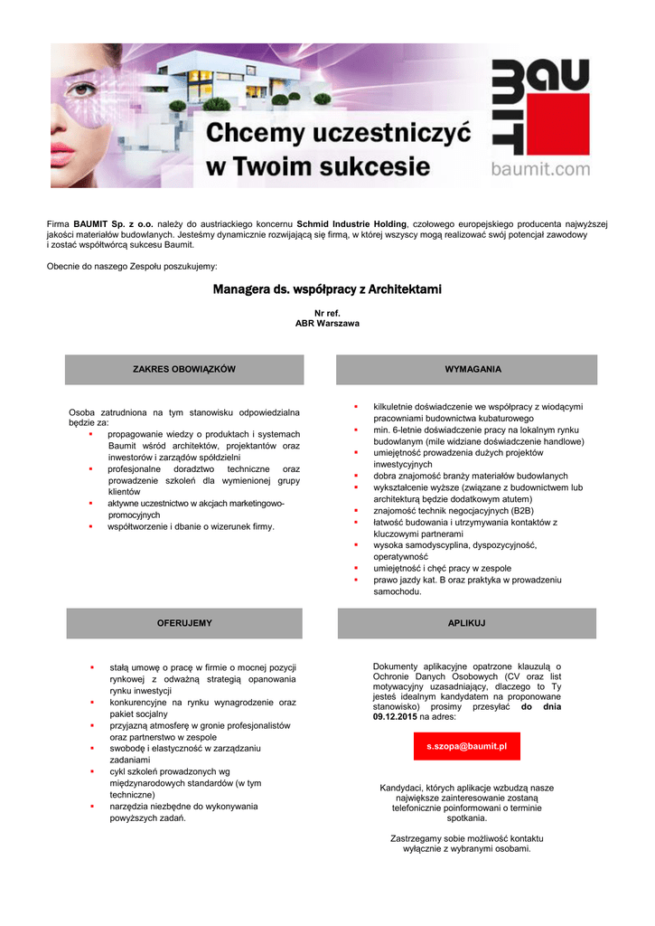 Firma BAUMIT Sp. z o.o. należy do austriackiego koncernu Schmid Industrie Holding, czołowego europejskiego producenta najwyższej jakości materiałów budowlanych. Jesteśmy dynamicznie rozwijającą się firmą, w której wszyscy mogą realizować swój potencjał zawodowy i zostać współtwórcą sukcesu Baumit. Obecnie do naszego Zespołu poszukujemy: Managera ds. współpracy z Architektami Nr ref. ABR Warszawa ZAKRES OBOWIĄZKÓW Osoba zatrudniona na tym stanowisku odpowiedzialna będzie za: propagowanie wiedzy o produktach i systemach Baumit wśród architektów, projektantów oraz inwestorów i zarządów spółdzielni profesjonalne doradztwo techniczne oraz prowadzenie szkoleń dla wymienionej grupy klientów aktywne uczestnictwo w akcjach marketingowopromocyjnych współtworzenie i dbanie o wizerunek firmy. WYMAGANIA OFERUJEMY stałą umowę o pracę w firmie o mocnej pozycji rynkowej z odważną strategią opanowania rynku inwestycji konkurencyjne na rynku wynagrodzenie oraz pakiet socjalny przyjazną atmosferę w gronie profesjonalistów oraz partnerstwo w zespole swobodę i elastyczność w zarządzaniu zadaniami cykl szkoleń prowadzonych wg międzynarodowych standardów (w tym techniczne) narzędzia niezbędne do wykonywania powyższych zadań. kilkuletnie doświadczenie we współpracy z wiodącymi pracowniami budownictwa kubaturowego min. 6-letnie doświadczenie pracy na lokalnym rynku budowlanym (mile widziane doświadczenie handlowe) umiejętność prowadzenia dużych projektów inwestycyjnych dobra znajomość branży materiałów budowlanych wykształcenie wyższe (związane z budownictwem lub architekturą będzie dodatkowym atutem) znajomość technik negocjacyjnych (B2B) łatwość budowania i utrzymywania kontaktów z kluczowymi partnerami wysoka samodyscyplina, dyspozycyjność, operatywność umiejętność i chęć pracy w zespole prawo jazdy kat. B oraz praktyka w prowadzeniu samochodu. APLIKUJ Dokumenty aplikacyjne opatrzone klauzulą o Ochronie Danych Osobowych (CV oraz list motywacyjny uzasadniający, dlaczego to Ty jesteś idealnym kandydatem na proponowane stanowisko) prosimy przesyłać do dnia 09.12.2015 na adres: [email protected] Kandydaci, których aplikacje wzbudzą nasze największe zainteresowanie zostaną telefonicznie poinformowani o terminie spotkania. Zastrzegamy sobie możliwość kontaktu wyłącznie z wybranymi osobami.