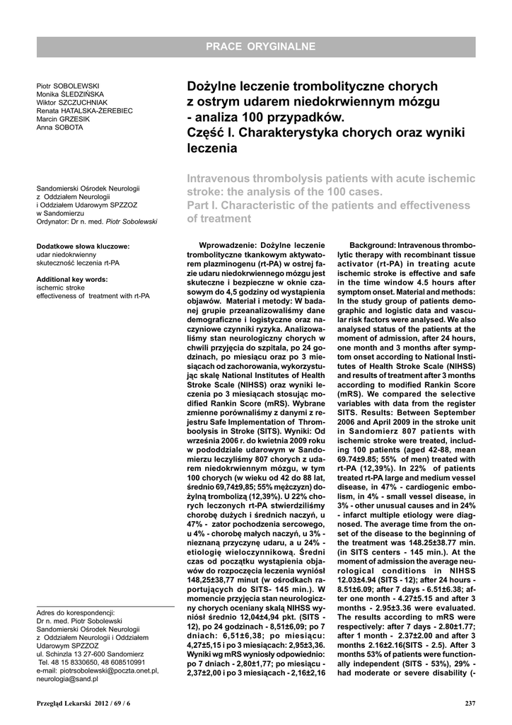 PRACE ORYGINALNE Piotr SOBOLEWSKI Monika LEDZIÑSKA Wiktor SZCZUCHNIAK Renata HATALSKA-¯EREBIEC Marcin GRZESIK Anna SOBOTA Sandomierski Orodek Neurologii z Oddzia³em Neurologii i Oddzia³em Udarowym SPZZOZ w Sandomierzu Ordynator: Dr n. med. Piotr Sobolewski Dodatkowe s³owa kluczowe: udar niedokrwienny skutecznoæ leczenia rt-PA Additional key words: ischemic stroke effectiveness of treatment with rt-PA Adres do korespondencji: Dr n. med. Piotr Sobolewski Sandomierski Orodek Neurologii z Oddzia³em Neurologii i Oddzia³em Udarowym SPZZOZ ul. Schinzla 13 27-600 Sandomierz Tel. 48 15 8330650, 48 608510991 e-mail: [email protected], [email protected] Przegl¹d Lekarski 2012 / 69 / 6 Do¿ylne leczenie trombolityczne chorych z ostrym udarem niedokrwiennym mózgu - analiza 100 przypadków. Czêæ I. Charakterystyka chorych oraz wyniki leczenia Intravenous thrombolysis patients with acute ischemic stroke: the analysis of the 100 cases. Part I. Characteristic of the patients and effectiveness of treatment Wprowadzenie: Do¿ylne leczenie trombolityczne tkankowym aktywatorem plazminogenu (rt-PA) w ostrej fazie udaru niedokrwiennego mózgu jest skuteczne i bezpieczne w oknie czasowym do 4,5 godziny od wyst¹pienia objawów. Materia³ i metody: W badanej grupie przeanalizowalimy dane demograficzne i logistyczne oraz naczyniowe czynniki ryzyka. Analizowalimy stan neurologiczny chorych w chwili przyjêcia do szpitala, po 24 godzinach, po miesi¹cu oraz po 3 miesi¹cach od zachorowania, wykorzystuj¹c skalê National Institutes of Health Stroke Scale (NIHSS) oraz wyniki leczenia po 3 miesi¹cach stosuj¹c modified Rankin Score (mRS). Wybrane zmienne porównalimy z danymi z rejestru Safe Implementation of Thromboolysis in Stroke (SITS). Wyniki: Od wrzenia 2006 r. do kwietnia 2009 roku w pododdziale udarowym w Sandomierzu leczylimy 807 chorych z udarem niedokrwiennym mózgu, w tym 100 chorych (w wieku od 42 do 88 lat, rednio 69,74±9,85; 55% mê¿czyzn) do¿yln¹ tromboliz¹ (12,39%). U 22% chorych leczonych rt-PA stwierdzilimy chorobê du¿ych i rednich naczyñ, u 47% - zator pochodzenia sercowego, u 4% - chorobê ma³ych naczyñ, u 3% nieznan¹ przyczynê udaru, a u 24% etiologiê wieloczynnikow¹. redni czas od pocz¹tku wyst¹pienia objawów do rozpoczêcia leczenia wyniós³ 148,25±38,77 minut (w orodkach raportuj¹cych do SITS- 145 min.). W momencie przyjêcia stan neurologiczny chorych oceniany skal¹ NIHSS wyniós³ rednio 12,04±4,94 pkt. (SITS 12), po 24 godzinach - 8,51±6,09; po 7 dniach: 6,51±6,38; po miesi¹cu: 4,27±5,15 i po 3 miesi¹cach: 2,95±3,36. Wyniki wg mRS wynios³y odpowiednio: po 7 dniach - 2,80±1,77; po miesi¹cu 2,37±2,00 i po 3 miesi¹cach - 2,16±2,16 Background: Intravenous thrombolytic therapy with recombinant tissue activator (rt-PA) in treating acute ischemic stroke is effective and safe in the time window 4.5 hours after symptom onset. Material and methods: In the study group of patients demographic and logistic data and vascular risk factors were analysed. We also analysed status of the patients at the moment of admission, after 24 hours, one month and 3 months after symptom onset according to National Institutes of Health Stroke Scale (NIHSS) and results of treatment after 3 months according to modified Rankin Score (mRS). We compared the selective variables with data from the register SITS. Results: Between September 2006 and April 2009 in the stroke unit in Sandomierz 807 patients with ischemic stroke were treated, including 100 patients (aged 42-88, mean 69.74±9.85; 55% of men) treated with rt-PA (12,39%). In 22% of patients treated rt-PA large and medium vessel disease, in 47% - cardiogenic embolism, in 4% - small vessel disease, in 3% - other unusual causes and in 24% - infarct multiple etiology were diagnosed. The average time from the onset of the disease to the beginning of the treatment was 148.25±38.77 min. (in SITS centers - 145 min.). At the moment of admission the average neurological conditions in NIHSS 12.03±4.94 (SITS - 12); after 24 hours 8.51±6.09; after 7 days - 6.51±6.38; after one month - 4.27±5.15 and after 3 months - 2.95±3.36 were evaluated. The results according to mRS were respectively: after 7 days - 2.80±1.77; after 1 month - 2.37±2.00 and after 3 months 2.16±2.16(SITS - 2.5). After 3 months 53% of patients were functionally independent (SITS - 53%), 29% had moderate or severe disability (- 237 (SITS - 2,5). Po 3 miesi¹cach 53% chorych by³o niezale¿nych (SITS - 53%), 29% - wymaga³o opieki (- 32%) i 18% chorych zmar³o (- 15%). Wnioski: W analizowanym okresie w pododdziale udarowym w Sandomierzu odsetek chorych z udarem niedokrwiennym leczonych rt-PA by³ wysoki. Prezentacja wyników do¿ylnego leczenia trombolitycznego chorych z ostrym udarem niedokrwiennym mózgu prowadzonego w ró¿nych orodkach, stanowi wa¿ny aspekt oceny skutecznoci i bezpieczeñstwa tej terapii. Wstêp i cel pracy Choroby naczyniowe mózgu s¹ jedn¹ z najczêstszych przyczyn zgonu i inwalidztwa w wielu krajach na ca³ym wiecie i ich liczba stale wzrasta [4,18]. Udary mózgowe stanowi¹ trzeci¹ co do czêstoci przyczynê zgonów, po chorobach serca i nowotworach [19]. Wprowadzenie nowoczesnych i kompleksowych systemów opieki nad chorymi z udarem znacznie polepszy³o wyniki leczenia w tej grupie chorych [7]. Podejmowano wiele prób klinicznych z zastosowaniem leków trombolitycznych, jednak¿e ich dzia³ania uboczne przewy¿sza³y korzyci z ich zastosowania[5,15]. Prze³omem w leczeniu ostrej fazy udaru niedokrwiennego sta³o siê wprowadzenie do leczenia rekombinowanego tkankowego aktywatora plazminogenu (rt-PA) podawanego do¿ylnie w ci¹gu pierwszych 3 godzin od momentu wyst¹pienia objawów, którego zadaniem jest rekanalizacja zamkniêtego przez zakrzep b¹d zator naczynia [22,26]. W 1996 r. w Stanach Zjednoczonych leczenie Alteplaz¹ uzyska³o akceptacjê FDA (Food and Drug Administration) w oparciu o rezultaty badania NINDS (National Inst