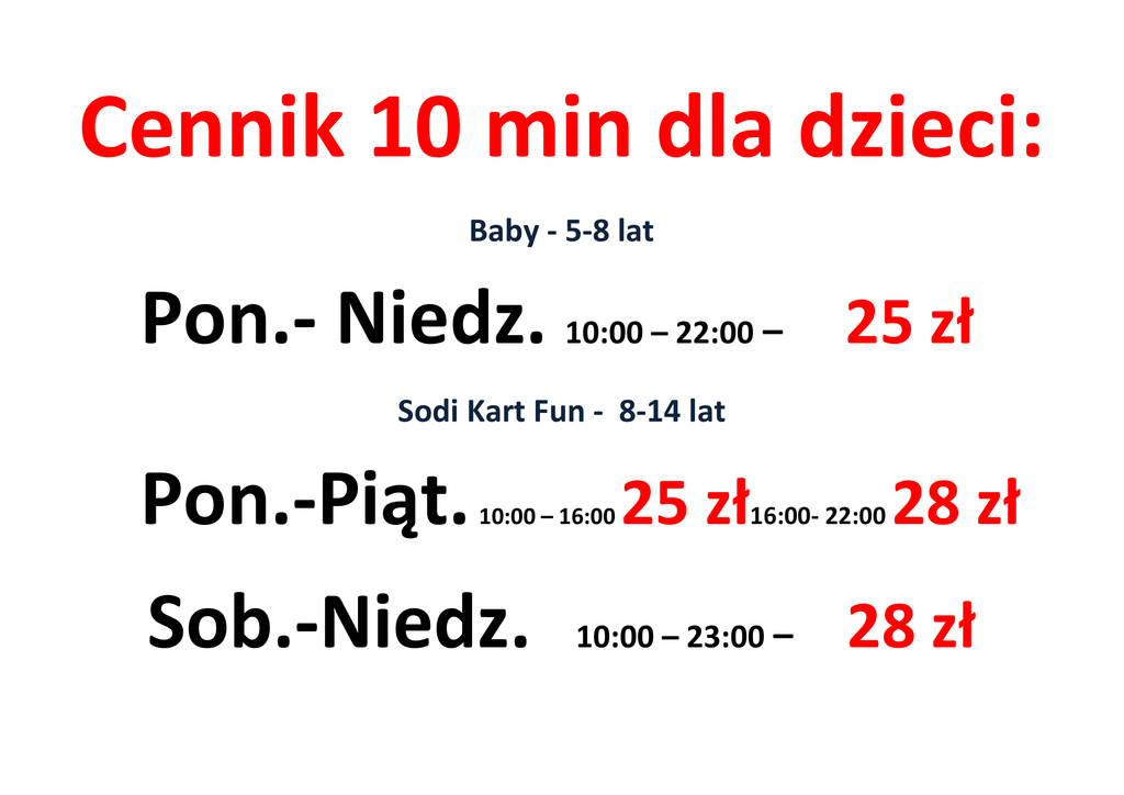 Cennik 10 min dla dzieci: Baby - 5-8 lat Pon.- Niedz. 10:00 – 22:00 – 25 zł Sodi Kart Fun - 8-14 lat Pon.-Piąt. 10:00 – 16:00 Sob.-Niedz. 25 zł 16:00- 22:00 10:00 – 23:00 – 28 zł 28 zł