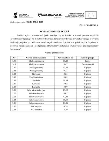 Znak postępowania: FSiSR. 271.2. 2015 ZAŁĄCZNIK NR 6 WYKAZ POMIESZCZEŃ Poniżej wykaz pomieszczeń jakie znajduje się w Zamku w części przeznaczonej dla operatora zewnętrznego na II piętrze w budynku Zamku w Szydłowcu zrewitalizowanego w wyniku realizacji projektu pt. „Odnowa zabytkowych obiektów i przestrzeni publicznej w Szydłowcu, poprawa funkcjonalności i dostępności infrastruktury kulturalnej i turystycznej dla mieszkańców Mazowsza”: Wykaz pomieszczeń Nr Nazwa pomieszczenia Powierzchnia m² Kondygnacja 1.30 Klatka schodowa 10,14 Parter 1a.1 Klatka schodowa 9,47 Parter wysoki 3.12 Pokój gościnny 13,95 II piętro 3.13 Pokój gościnny 9,31 II piętro 3.14 Korytarz 2,23 II piętro 3.15 Pokój gościnny 8,02 II piętro 3.16 Kuchnia 11,18 II piętro 3.17 Korytarz 7,02 II piętro 3.18 Łazienka 3,89 II piętro 3.20 Sala wielofunkcyjna 27,03 II piętro 3.22 Sala kominkowa 105,11 II piętro 3.23 Sala wystawowa 47,86 II piętro 3.24 Sala wystawowa 38,97 II piętro 3.26 Sala wystawowa 29,21 II piętro 3.30 WC męskie 4,79 II piętro 3.31 WC damskie 3,29 II piętro