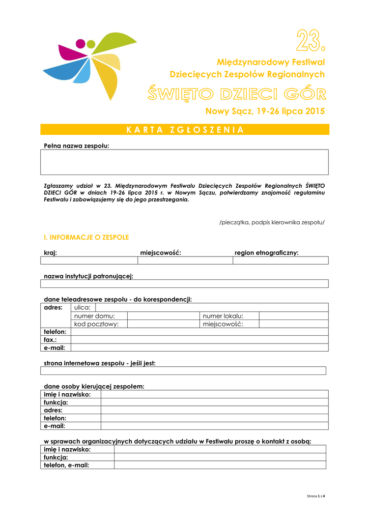 Międzynarodowy Festiwal Dziecięcych Zespołów Regionalnych Nowy Sącz, 19-26 lipca 2015 KARTA ZGŁOSZENIA Pełna nazwa zespołu: Zgłaszamy udział w 23. Międzynarodowym Festiwalu Dziecięcych Zespołów Regionalnych ŚWIĘTO DZIECI GÓR w dniach 19-26 lipca 2015 r. w Nowym Sączu, potwierdzamy znajomość regulaminu Festiwalu i zobowiązujemy się do jego przestrzegania. /pieczątka, podpis kierownika zespołu/ I. INFORMACJE O ZESPOLE kraj: miejscowość: region etnograficzny: nazwa instytucji patronującej: dane teleadresowe zespołu - do korespondencji: adres: ulica: numer domu: kod pocztowy: telefon: fax.: e-mail: numer lokalu: miejscowość: strona internetowa zespołu - jeśli jest: dane osoby kierującej zespołem: imię i nazwisko: funkcja: adres: telefon: e-mail: w sprawach organizacyjnych dotyczących udziału w Festiwalu proszę o kontakt z osobą: imię i nazwisko: funkcja: telefon, e-mail: Strona 1 z 4 LICZBA CZŁONKÓW ZESPOŁU: (dzieci, kapela, kierownictwo, opieka, kierowcy - wszyscy uczestnicy): dzieci: muzycy: dorośli: dziewczynki: chłopcy: kobiety: mężczyźni: kobiety: mężczyźni: przedział wieku (od-do): przedział wieku (od-do): ogólna liczba członków zespołu suma: !!! Ogólna liczba członków grupy (wraz z osobami towarzyszącymi i kierowcami autokaru) nie może przekraczać 40 osób !!! II. PRZYJAZD ZESPOŁU Przyjazd zespołu do Nowego Sącza przewidziany jest na 18 lipca (sobota) w godzinach popołudniowych - około godziny 16.00: Miejsce przyjazdu: Nowy Sącz - ul. Nadbrzeżna 34 Hala Widowiskowo-Sportowa BIURO ORGANIZACYJNE FESTIWALU !!! Jeśli z jakichś powodów zespół nie może przyjechać w określonym wyżej terminie, prosimy o powiadomienie o tym najpóźniej 48 godzin wcześniej !!! Kontaktowy numer telefonu w czasie podróży zespołu ze swojej miejscowości do Nowego Sącza: dot. zespołów zagranicznych: Rodzaj transportu: Przewidywany termin / czas wyjazdu z kraju: Miejsce przekraczania granicy / docelowy port lotniczy: Przewidywany czas przyjazdu do Polski / Nowego Sącza: Przewidywany czas wyjazdu z Polski / Nowego Sącza - powrót do domu: Uwagi organizacyjne: Strona 2 z 4 III. INFORMACJE O REPERTUARZE Tytuł i opis programu: - wyszczególnienie tańców, pieśni, gier i zabaw oraz ich krótka charakterystyka Imię i nazwisko choreografa zespołu: IV. SKŁAD KAPELI (ZESPOŁU INSTRUMENTALNEGO AKOMPANIUJĄCEGO): Proszę wymienić i opisać poszczególne instrumenty: Potrzeby techniczne: Imię i nazwisko kierownika kapeli: Strona 3 z 4 V. DZIEŃ NARODOWY (Regulamin: pkt. I/9) a) propozycja zespołu dotycząca programu dodatkowego w czasie swojego dnia narodowego. Dotyczy prezentacji kultury swojego regionu w formach pozascenicznych: b) jakiej pomocy w realizacji dnia narodowego zespół oczekuje od organizatora? VI. WYŻYWIENIE Proszę wymienić oczekiwania dotyczące posiłków, np. kuchnia wegetariańska, diety, napoje: ! Zgodnie z Ustawą z dnia 29.08.1997 roku o ochronie danych osobowych Dz. U. Nr. 133/97 poz. 883 wyrażam zgodę na umieszczenie moich danych osobowych w bazie danych MCK SOKÓŁ oraz ich przetwarzanie zgodnie z zasadami organizacyjnymi wynikającymi z działalności Małopolskiego Centrum Kultury SOKÓŁ w Nowy Sączu. ________________________ /podpis kierownika zespołu/ Biuro Organizacyjne Festiwalu ŚWIĘTO DZIECI GÓR Małopolskie Centrum Kultury SOKÓŁ ul. Długosza 3, 33-300 Nowy Sącz tel. +48 18 4482610, fax. +48 18 4482611 e-mail: [email protected] www.swietodziecigor.pl Strona 4 z 4