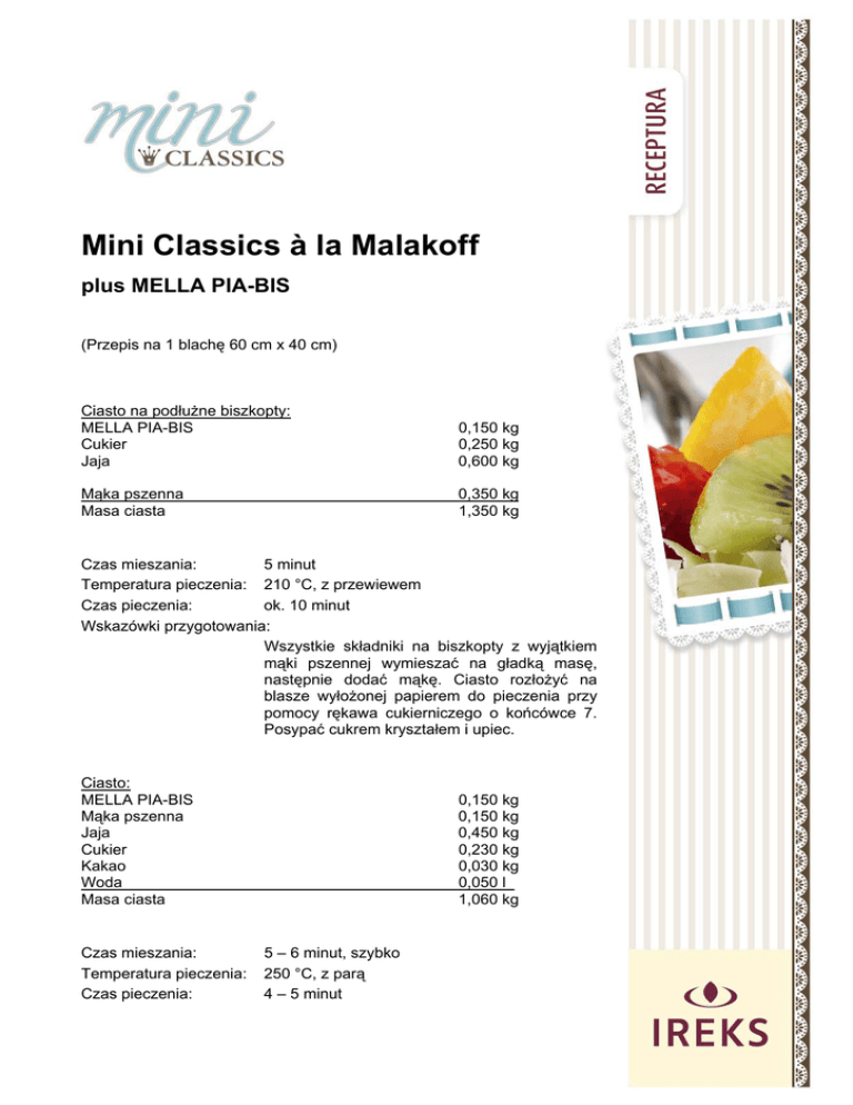 Mini Classics à la Malakoff plus MELLA PIA-BIS (Przepis na 1 blachę 60 cm x 40 cm) Ciasto na podłużne biszkopty: MELLA PIA-BIS Cukier Jaja 0,150 kg 0,250 kg 0,600 kg Mąka pszenna Masa ciasta 0,350 kg 1,350 kg Czas mieszania: 5 minut Temperatura pieczenia: 210 °C, z przewiewem Czas pieczenia: ok. 10 minut Wskazówki przygotowania: Wszystkie składniki na biszkopty z wyjątkiem mąki pszennej wymieszać na gładką masę, następnie dodać mąkę. Ciasto rozłożyć na blasze wyłożonej papierem do pieczenia przy pomocy rękawa cukierniczego o końcówce 7. Posypać cukrem kryształem i upiec. Ciasto: MELLA PIA-BIS Mąka pszenna Jaja Cukier Kakao Woda Masa ciasta Czas mieszania: Temperatura pieczenia: Czas pieczenia: 0,150 kg 0,150 kg 0,450 kg 0,230 kg 0,030 kg 0,050 l 1,060 kg 5 – 6 minut, szybko 250 °C, z parą 4 – 5 minut Krem: MELLA WHIP Cukier Aromat rumu w paście Masa kremu 1,500 kg 0,150 kg 0,025 kg 1,675 kg Rumowy poncz: Woda Cukier Aromat rumowy w paście Masa ponczu: 0,200 l 0,200 kg 0,005 kg 0,405 kg Wskazówki przygotowania: Wszystkie składniki na ciasto wymieszać na gładką masę, rozłożyć na 2 blachach (0,500 kg na blachę o wymiarach 60 cm x 40 cm) i upiec. MELLĘ WHIP ubić z cukrem i aromatem rumowym w paście. Ostudzone warstwy ciasta i namoczone w ponczu biszkopty połączyć kremem (ok. 1,000 kg na warstwę). Odstawić w chłodne miejsce (+5 °C) na ok. godzinę. Pokroić ciasto na pasy o szerkości 5 cm a następnie w kostki o wymiarach 5 cm x 5 cm. Wierzch oraz boki posmarować pozostałym kremem i obłożyć biszkoptami. Udekorować wedle uznania.