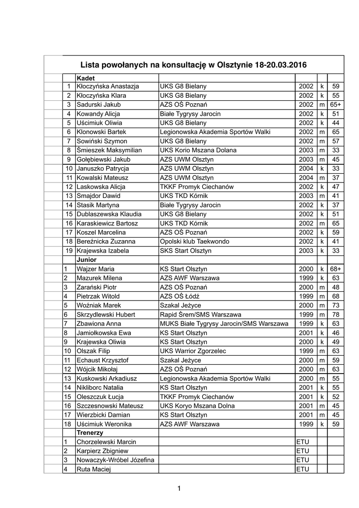 Lista powołanych na konsultację w Olsztynie 18-20.03.2016 1 2 3 4 5 6 7 8 9 10 11 12 13 14 15 16 17 18 19 1 2 3 4 5 6 7 8 9 10 11 12 13 14 15 16 17 18 1 2 3 4 Kadet Kłoczyńska Anastazja Kłoczyńska Klara Sadurski Jakub Kowandy Alicja Uścimiuk Oliwia Klonowski Bartek Sowiński Szymon Śmieszek Maksymilian Gołębiewski Jakub Januszko Patrycja Kowalski Mateusz Laskowska Alicja Smajdor Dawid Stasik Martyna Dublaszewska Klaudia Karaskiewicz Bartosz Koszel Marcelina Bereźnicka Zuzanna Krajewska Izabela Junior Wajzer Maria Mazurek Milena Zarański Piotr Pietrzak Witold Woźniak Marek Skrzydlewski Hubert Zbawiona Anna Jamiołkowska Ewa Krajewska Oliwia Olszak Filip Echaust Krzysztof Wójcik Mikołaj Kuskowski Arkadiusz Nikliborc Natalia Oleszczuk Łucja Szczesnowski Mateusz Wierzbicki Damian Uścimiuk Weronika Trenerzy Chorzelewski Marcin Karpierz Zbigniew Nowaczyk-Wróbel Józefina Ruta Maciej UKS G8 Bielany UKS G8 Bielany AZS OŚ Poznań Białe Tygrysy Jarocin UKS G8 Bielany Legionowska Akademia Sportów Walki UKS G8 Bielany UKS Korio Mszana Dolana AZS UWM Olsztyn AZS UWM Olsztyn AZS UWM Olsztyn TKKF Promyk Ciechanów UKS TKD Kórnik Białe Tygrysy Jarocin UKS G8 Bielany UKS TKD Kórnik AZS OŚ Poznań Opolski klub Taekwondo SKS Start Olsztyn 2002 2002 2002 2002 2002 2002 2002 2003 2003 2004 2004 2002 2003 2002 2002 2002 2002 2002 2003 k 59 k 55 m 65+ k 51 k 44 m 65 m 57 m 33 m 45 k 33 m 37 k 47 m 41 k 37 k 51 m 65 k 59 k 41 k 33 KS Start Olsztyn AZS AWF Warszawa AZS OŚ Poznań AZS OŚ Łódź Szakal Jeżyce Rapid Śrem/SMS Warszawa MUKS Białe Tygrysy Jarocin/SMS Warszawa KS Start Olsztyn KS Start Olsztyn UKS Warrior Zgorzelec Szakal Jeżyce AZS OŚ Poznań Legionowska Akademia Sportów Walki KS Start Olsztyn TKKF Promyk Ciechanów UKS Koryo Mszana Dolna KS Start Olsztyn AZS AWF Warszawa 2000 1999 2000 1999 2000 1999 1999 2001 2000 1999 2000 2000 2000 2001 2001 2001 2001 1999 k 68+ k 63 m 48 m 68 m 73 m 78 k 63 k 46 k 49 m 63 m 59 m 63 m 55 k 55 k 52 m 45 m 45 k 59 ETU ETU ETU ETU 1 5 6 7 Scheffler Łukasz Tomasz Pielak Bartosiewicz Andrzej ETU ETU ETU 2