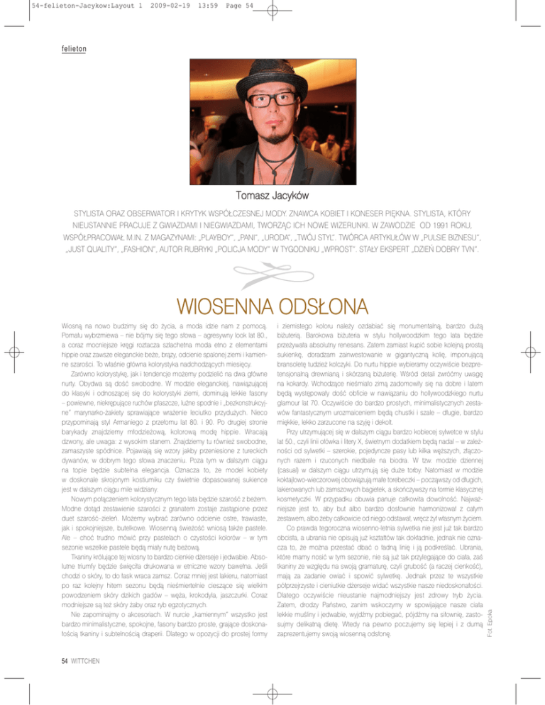 54-felieton-Jacykow:Layout 1 2009-02-19 13:59 Page 54 felieton Tomasz Jacyków STYLISTA ORAZ OBSERWATOR I KRYTYK WSPÓŁCZESNEJ MODY. ZNAWCA KOBIET I KONESER PIĘKNA. STYLISTA, KTÓRY NIEUSTANNIE PRACUJE Z GWIAZDAMI I NIEGWIAZDAMI, TWORZĄC ICH NOWE WIZERUNKI. W ZAWODZIE OD 1991 ROKU, WSPÓŁPRACOWAŁ M.IN. Z MAGAZYNAMI: „PLAYBOY”, „PANI”, „URODA”, „TWÓJ STYL”. TWÓRCA ARTYKUŁÓW W „PULSIE BIZNESU”, „JUST QUALITY”, „FASHION”, AUTOR RUBRYKI „POLICJA MODY” W TYGODNIKU „WPROST”. STAŁY EKSPERT „DZIEŃ DOBRY TVN”. Wiosną na nowo budzimy się do życia, a moda idzie nam z pomocą. Pomału wybrzmiewa – nie bójmy się tego słowa – agresywny look lat 80., a coraz mocniejsze kręgi roztacza szlachetna moda etno z elementami hippie oraz zawsze eleganckie beże, brązy, odcienie spalonej ziemi i kamienne szarości. To właśnie główna kolorystyka nadchodzących miesięcy. Zarówno kolorystykę, jak i tendencje możemy podzielić na dwa główne nurty. Obydwa są dość swobodne. W modzie eleganckiej, nawiązującej do klasyki i odnoszącej się do kolorystyki ziemi, dominują lekkie fasony – powiewne, niekrępujące ruchów płaszcze, luźne spodnie i „bezkonstrukcyjne” marynarko-żakiety sprawiające wrażenie leciutko przydużych. Nieco przypominają styl Armaniego z przełomu lat 80. i 90. Po drugiej stronie barykady znajdziemy młodzieżową, kolorową modę hippie. Wracają dzwony, ale uwaga: z wysokim stanem. Znajdziemy tu również swobodne, zamaszyste spódnice. Pojawiają się wzory jakby przeniesione z tureckich dywanów, w dobrym tego słowa znaczeniu. Poza tym w dalszym ciągu na topie będzie subtelna elegancja. Oznacza to, że model kobiety w doskonale skrojonym kostiumiku czy świetnie dopasowanej sukience jest w dalszym ciągu mile widziany. Nowym połączeniem kolorystycznym tego lata będzie szarość z beżem. Modne dotąd zestawienie szarości z granatem zostaje zastąpione przez duet szarość–zieleń. Możemy wybrać zarówno odcienie ostre, trawiaste, jak i spokojniejsze, butelkowe. Wiosenną świeżość wniosą także pastele. Ale – choć trudno mówić przy pastelach o czystości kolorów – w tym sezonie wszelkie pastele będą miały nutę beżową. Tkaniny królujące tej wiosny to bardzo cienkie dżerseje i jedwabie. Absolutne triumfy będzie święciła drukowana w etniczne wzory bawełna. Jeśli chodzi o skóry, to do łask wraca zamsz. Coraz mniej jest lakieru, natomiast po raz kolejny hitem sezonu będą nieśmiertelnie cieszące się wielkim powodzeniem skóry dzikich gadów – węża, krokodyla, jaszczurki. Coraz modniejsze są też skóry żaby oraz ryb egzotycznych. Nie zapominajmy o akcesoriach. W nurcie „kamiennym” wszystko jest bardzo minimalistyczne, spokojne, fasony bardzo proste, grające doskonałością tkaniny i subtelnością draperii. Dlatego w opozycji do prostej formy 54 WITTCHEN i ziemistego koloru należy ozdabiać się monumentalną, bardzo dużą biżuterią. Barokowa biżuteria w stylu hollywoodzkim tego lata będzie przeżywała absolutny renesans. Zatem zamiast kupić sobie kolejną prostą sukienkę, doradzam zainwestowanie w gigantyczną kolię, imponującą bransoletę tudzież kolczyki. Do nurtu hippie wybieramy oczywiście bezpretensjonalną drewnianą i skórzaną biżuterię. Wśród detali zwróćmy uwagę na kokardy. Wchodzące nieśmiało zimą zadomowiły się na dobre i latem będą występowały dość obficie w nawiązaniu do hollywoodzkiego nurtu glamour lat 70. Oczywiście do bardzo prostych, minimalistycznych zestawów fantastycznym urozmaiceniem będą chustki i szale – długie, bardzo miękkie, lekko zarzucone na szyję i dekolt. Przy utrzymującej się w dalszym ciągu bardzo kobiecej sylwetce w stylu lat 50., czyli linii ołówka i litery X, świetnym dodatkiem będą nadal – w zależności od sylwetki – szerokie, pojedyncze pasy lub kilka węższych, złączonych razem i rzuconych niedbale na biodra. W tzw. modzie dziennej (casual) w dalszym ciągu utrzymują się duże torby. Natomiast w modzie koktajlowo-wieczorowej obowiązują małe torebeczki – począwszy od długich, lakierowanych lub zamszowych bagietek, a skończywszy na formie klasycznej kosmetyczki. W przypadku obuwia panuje całkowita dowolność. Najważniejsze jest to, aby but albo bardzo dosłownie harmonizował z całym zestawem, albo żeby całkowicie od niego odstawał, wręcz żył własnym życiem. Co prawda tegoroczna wiosenno-letnia sylwetka nie jest już tak bardzo obcisła, a ubrania nie opisują już kształtów tak dokładnie, jednak nie oznacza to, że można przestać dbać o ładną linię i ją podkreślać. Ubrania, które mamy nosić w tym sezonie, nie są już tak przylegające do ciała, zaś tkaniny ze względu na swoją gramaturę, czyli grubość (a raczej cienkość), mają za zadanie owiać i spowić sylwetkę. Jednak przez te wszystkie półprzejrzyste i cieniutkie dżerseje widać wszystkie nasze niedoskonałości. Dlatego oczywiście nieustanie najmodniejszy jest zdrowy tryb życia. Zatem, drodzy Państwo, zanim wskoczymy w spowijające nasze ciała lekkie muśliny i jedwabie, wyjdźmy pobiegać, pójdźmy na siłownię, zastosujmy delikatną dietę. Wtedy na pewno poczujemy się lepiej i z dumą zaprezentujemy swoją wiosenną odsłonę. Fot. Epoka WIOSENNA ODSŁONA
