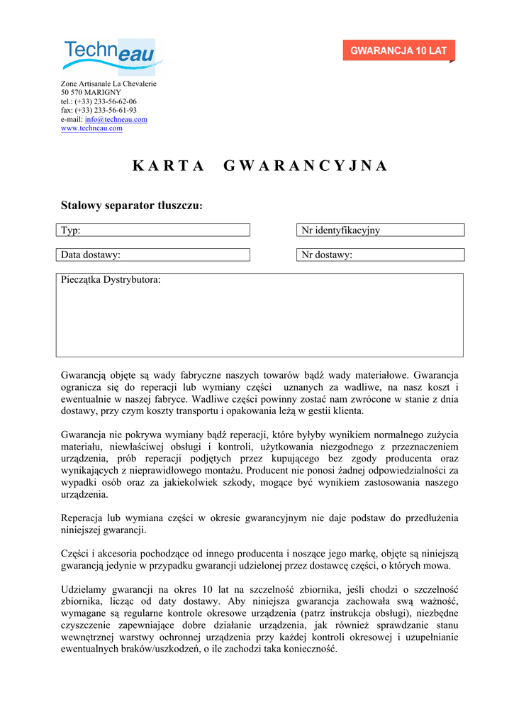 Zone Artisanale La Chevalerie 50 570 MARIGNY tel.: (+33) 233-56-62-06 fax: (+33) 233-56-61-93 e-mail: [email protected] www.techneau.com KARTA GWARANCYJNA Stalowy separator tłuszczu: Typ: Nr identyfikacyjny Data dostawy: Nr dostawy: Pieczątka Dystrybutora: Gwarancją objęte są wady fabryczne naszych towarów bądź wady materiałowe. Gwarancja ogranicza się do reperacji lub wymiany części uznanych za wadliwe, na nasz koszt i ewentualnie w naszej fabryce. Wadliwe części powinny zostać nam zwrócone w stanie z dnia dostawy, przy czym koszty transportu i opakowania leżą w gestii klienta. Gwarancja nie pokrywa wymiany bądź reperacji, które byłyby wynikiem normalnego zużycia materiału, niewłaściwej obsługi i kontroli, użytkowania niezgodnego z przeznaczeniem urządzenia, prób reperacji podjętych przez kupującego bez zgody producenta oraz wynikających z nieprawidłowego montażu. Producent nie ponosi żadnej odpowiedzialności za wypadki osób oraz za jakiekolwiek szkody, mogące być wynikiem zastosowania naszego urządzenia. Reperacja lub wymiana części w okresie gwarancyjnym nie daje podstaw do przedłużenia niniejszej gwarancji. Części i akcesoria pochodzące od innego producenta i noszące jego markę, objęte są niniejszą gwarancją jedynie w przypadku gwarancji udzielonej przez dostawcę części, o których mowa. Udzielamy gwarancji na okres 10 lat na szczelność zbiornika, jeśli chodzi o szczelność zbiornika, licząc od daty dostawy. Aby niniejsza gwarancja zachowała swą ważność, wymagane są regularne kontrole okresowe urządzenia (patrz instrukcja obsługi), niezbędne czyszczenie zapewniające dobre działanie urządzenia, jak również sprawdzanie stanu wewnętrznej warstwy ochronnej urządzenia przy każdej kontroli okresowej i uzupełnianie ewentualnych braków/uszkodzeń, o ile zachodzi taka konieczność. Kupon gwarancyjny (należy go nam odesłać, aby gwarancja nabrała ważności): Typ urządzenia: ............................................................................. Numer indentyfikacyjny: ................................................................ Data dostawy: ........................................................................... Numer dostawy: ........................................................................... Pieczątka dystrybutora: ............................................................... ul. Długa 61, Jedlicze A 95-073 Grotniki tel. (0-42) 717- 93 93 fax: (0-42) 717 -93 -94 e-mail: [email protected] www.techneau.com.pl
