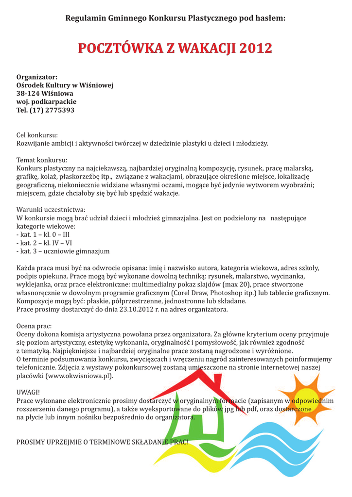 Regulamin Gminnego Konkursu Plastycznego pod hasłem: POCZTÓWKA Z WAKACJI 2012 Organizator: Ośrodek Kultury w Wiśniowej 38-124 Wiśniowa woj. podkarpackie Tel. (17) 2775393 Cel konkursu: Rozwijanie ambicji i aktywności twórczej w dziedzinie plastyki u dzieci i młodzieży. Temat konkursu: Konkurs plastyczny na najciekawszą, najbardziej oryginalną kompozycję, rysunek, pracę malarską, grafikę, kolaż, płaskorzeźbę itp., związane z wakacjami, obrazujące określone miejsce, lokalizację geograficzną, niekoniecznie widziane własnymi oczami, mogące być jedynie wytworem wyobraźni; miejscem, gdzie chciałoby się być lub spędzić wakacje. Warunki uczestnictwa: W konkursie mogą brać udział dzieci i młodzież gimnazjalna. Jest on podzielony na następujące kategorie wiekowe: - kat. 1 – kl. 0 – III - kat. 2 – kl. IV – VI - kat. 3 – uczniowie gimnazjum Każda praca musi być na odwrocie opisana: imię i nazwisko autora, kategoria wiekowa, adres szkoły, podpis opiekuna. Prace mogą być wykonane dowolną techniką: rysunek, malarstwo, wycinanka, wyklejanka, oraz prace elektroniczne: multimedialny pokaz slajdów (max 20), prace stworzone własnoręcznie w dowolnym programie graficznym (Corel Draw, Photoshop itp.) lub tablecie graficznym. Kompozycje mogą być: płaskie, półprzestrzenne, jednostronne lub składane. Prace prosimy dostarczyć do dnia 23.10.2012 r. na adres organizatora. Ocena prac: Oceny dokona komisja artystyczna powołana przez organizatora. Za główne kryterium oceny przyjmuje się poziom artystyczny, estetykę wykonania, oryginalność i pomysłowość, jak również zgodność z tematyką. Najpiękniejsze i najbardziej oryginalne prace zostaną nagrodzone i wyróżnione. O terminie podsumowania konkursu, zwycięzcach i wręczeniu nagród zainteresowanych poinformujemy telefonicznie. Zdjęcia z wystawy pokonkursowej zostaną umieszczone na stronie internetowej naszej placówki (www.okwisniowa.pl). UWAGI! Prace wykonane elektronicznie prosimy dostarczyć w oryginalnym formacie (zapisanym w odpowiednim rozszerzeniu danego programu), a także wyeksportowane do plików jpg lub pdf, oraz dostarczone na płycie lub innym nośniku bezpośrednio do organizatora. PROSIMY UPRZEJMIE O TERMINOWE SKŁADANIE PRAC!