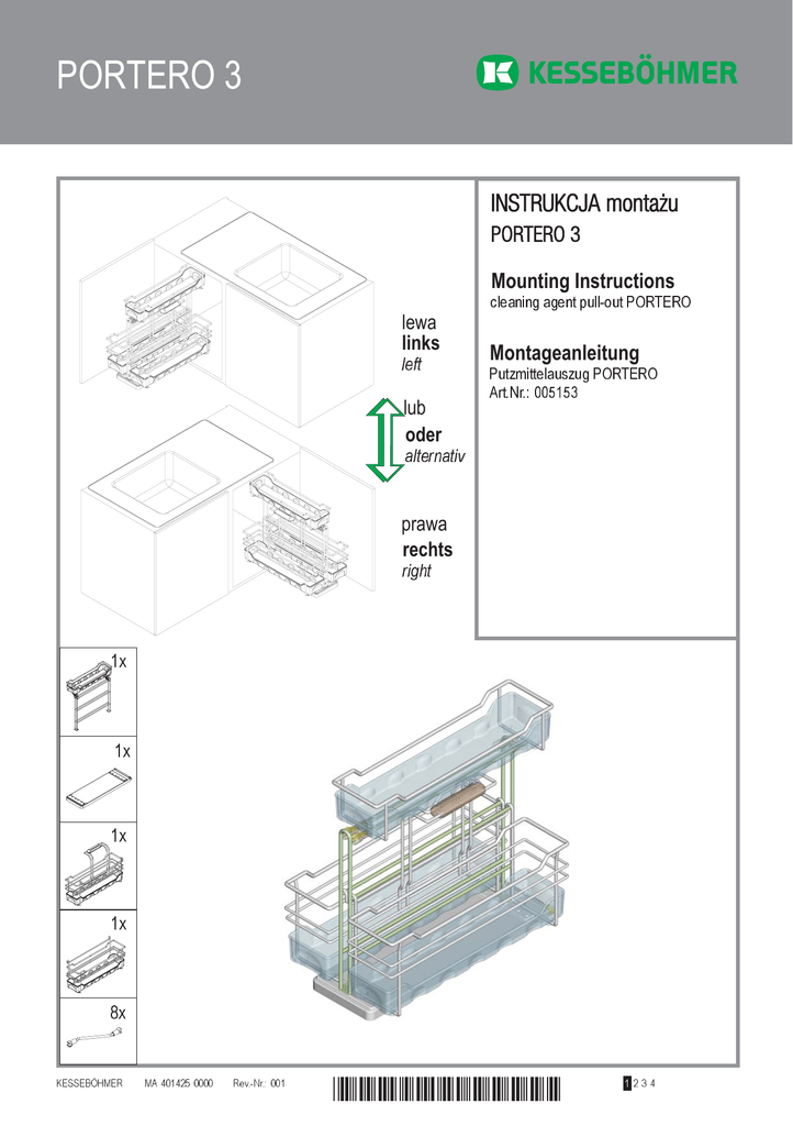 PORTERO 3 INSTRUKCJA montażu PORTERO 3 Mounting Instructions lewa links left lub oder cleaning agent pull-out PORTERO Montageanleitung Putzmittelauszug PORTERO Art.Nr.: 005153 alternativ prawa rechts right N N N N &N KESSEBÖHMER MA 401425 0000 Rev.-Nr.: 001 *4014250000* 1 2 3 4 5 6 7 8 9 10 11 12 PORTERO 3 SYMBOLE SYMBOLS SYMBOLES SYMBOLI SIMBOLOS SIMBOLOS MERKIT SYMBOLER SYMBOLY SYMBOLE Warnung! Warning! Avertissement! Avvertenza! ¡Advertencia! Aviso! Varoitus! Advarsel! Výstraha! Ostrzezenie! Nicht korrekt! Incorrect! Incorrect! Non corretto! ¡Incorrecto! Incorrecto! Väärin! Ikke korrekt! Nesprávnê! Nieprawidlowo! Korrekt! Correct! Correct! corretto! ¡Correcto! Correcto! Oikein! Korrekt! Správnê! Prawidlowo!! Fixieren/fixiert! Secure/Secured! Fixer/fixé Fissare/fissato! ¡Fijar/fijado! Fixar/fixo! Kiinnitä/kiinnitetty! Spænde/sændt Lösen/gelöst! Relese/Relesed! Détacher/détaché Allentare/allentato! ¡Soltar/suelto! Soltar/solto! Irroita/irroitettu! Løsne/løsnet Povolit/povolento! Zwolnic/zwolnione! Keinen Akkuschrauber verwenden! Do not use a cordless screwdriver! Ne pas utiliser de tournevis à piles Non utilizzare un avviatore a batteria! ¡No itlizar tladro atornillador! Não usar aparafusadora sem fio! ÄlÄ käytä akkurruuvinväännintä! Brug ikke batteriskukruetrækker! Nepouzivejte akuroubovák! Nie uzywac wkrtarki akumultorowej! PZ-2 PZ2-Schraubendreher verwenden! Use a PZ2 screwdriver! Utiliser un tournevis Pz2 Usare il cacciavite Pz2! ¡Utilizar un destornialldor Pz2! Usar chave de parafusos Pz2! Käytä PZ2-ruuviatalttaa! Brug PZ2-skruetrækker! Pouzijte krizový roubovák Pz2! Uzyc wkretaka Pz2! Optionales Element! Optional element! Élément optionnel! Elemento opzionale! ¡Elemento opcional! Elemento opcional! Valinnainen elementti! Valgfrit element! Voltitelný prvek! Element opcjonalny! C Klick-Geräusch beim Einrasten! Audible click on engagement! <<Clic>> lors de l`encliquetage Quando si innesta si sente un clic! ¡Ciaondo encaja se oye un clic! Ruído de clique ao engatar! Lukittuessa kuuluu klik-ääni! Klikyd ved monterging! Slysitelné zacvaknutí! Trzask przy zaskakiwaniu! Alle Maße in mm! All dimensions in mm! Toutes les dimensions en mm! Tutte le dimensioni in mm! ¡Todas las medidas son en mm! Todas as medidas em mm! Kaikki mitat mm! Alle mal er mm! Vsechny rozmery v mm! Wszystkie wymiary w mm! Die technische Darstellung und Maßangaben -auch bei Abbildungen und Zeichnungen - sind unverbindlich. Konstruktionsverbesserungen sind vorbehalten! Technical information and stated dimensions (including in illustrations and drawings) must not be regarded as binding. Design subject to change without notice (in interest of improvement)! Les illustrations technique et les cotes y compris sur les schémas et les dessins sont non contractuelles. Sous réserve d'améliorations de la construction! Le rappresentazioni tecniche e le indicazioni delle dimensioni anche nelle figure e nei disegni non sono vincolanti. Con riserva di miglioramenti di progettazione! Las descripciones técnicas y los datos dimensionales, inclusive los incluidos en fotos y figuras, son meramente orientativos y no vinculantes. ¡Reservado el derecho a mejoras constructivas! As descrições técnicas e as indicações de medidas também em ilustrações e desenhos não são de natureza imperativa. Salvo melhoramentos de construção! Tekniset piirrokset ja mitat myös kuvissa ja piirroksissa olevat ovat sitoumuksetta. Oikeus teknisiin parannuksiin pidätetään! De tekniske fremstillinger og måleangivelser også i figurer og tegninger er vejledende. Forbehold for konstruktionsforbedringer! Technické znázornìní a rozmìry i na obrázcích a výkresech jsou nezávazné. Konstrukèní zmìny vyhrazeny! Prezentacje techniczne i dane wymiarowe takze na rysunkach sa niewiazace. Zmiany konstrukcyjne zastrzezone! KESSEBÖHMER MA 401425 0000 Rev.-Nr.: 001 1 2 3 4 5 6 7 8 9 10 11 12 PORTERO 3 1. 1 N Wymiary montażowe przy montażu po lewej stronie szafki min. Z N "N SPAX Senkkopf 4x16 8 28 SPAX Countersunk X 96 X 95 (+S) min.Y 285 (+S) min.Z 32 n. mi 0 48 mi n.Y 510 2 N N "N "N KESSEBÖHMER MA 401425 0000 Rev.-Nr.: 001 1 2 3 4 5 6 7 8 9 10 11 12 PORTERO 3 3. 3 Set 3 N 4 Wymiary montażowe przy montażu po lewej stronie szafki 4a 4b KESSEBÖHMER MA 401425 0000 Rev.-Nr.: 001 1 2 3 4 5 6 7 8 9 10 11 12