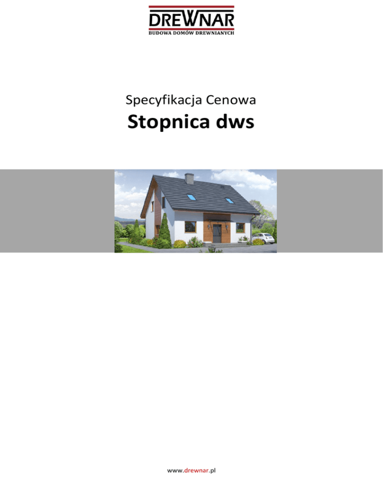 Specyfikacja Cenowa Stopnica dws www.drewnar.pl STAN DEWELOPERSKI DEWELOPERSKI ROZSZERZONY ROZSZERZONY STAN Poniższe prace prace ii rozwiązania rozwiązania opisują opisują strukturę strukturę budowy budowy domu domu całorocznego całorocznego w w zakresie zakresie standardu standardu Poniższe wykończenia: „STAN „STAN DEWELOPERSKI DEWELOPERSKI ROZSZERZONY“. ROZSZERZONY“. Niniejsze Niniejsze rozwiązania rozwiązania należy należy traktować, traktować, jako jako wykończenia: przykładowe, które które po po dostarczeniu dostarczeniu projektu projektu architektoniczno-konstrukcyjnego architektoniczno-konstrukcyjnego zostaną zostaną zaktualizowane. zaktualizowane. przykładowe, 1. Ściany zewnętrzne 6. Konstrukcja dachu 9. Przeszklenia okien i drzwi balkonowych Budowa ścian z izolacją zewnętrzną w przekroju od środka na zewnątrz: Budowa płaszczyzny dachu budynku z wykończonym poddaszem, w przekroju z góry na dół: Wszystkie okna i drzwi balkonowe (tarasowe) przeszklone są markowymi, cieplnie izolacyjnymi, potrójnymi szybami z izolacyjną ramką dystansową. Współczynnik Uw dla okien ≤1,0. płyta gipsowo-kartonowa ogniochronna na stelażu + szpachlowanie połączeń folia polietylenowa masywna, nośna konstrukcja drewniana 12,5 mm 150,0x45,0 mm w rozstawie 625mm 150,0 mm pianka poliuretanowa tworząca rdzeń izolacji cieplnej i akustycznej płyta wiórowa OSB/MFP membrana wysokoparoprzepuszczalna Wełna elewacyjna FRONTROCK MAX E 10cm podkład pod tynk zbrojony siatką tynk sylikatowy/sylikonowy cienkowarstwowy barwiony w masie w kolorze wg. wzornika. Elewacja w systemie ECOROCK FF 12,0 mm 100,0 mm - 2. Ściany wewnętrzne Budowa ścian: 12,5 mm 120,0 mm 100,0 mm 12,5 mm płyta gipsowo-kartonowa ogniochronna + szpachlowanie połączeń folia polietylenowa masywna, nośna konstrukcja drewniana (w przypadku ścian zawierających instalacje grubość może wynosić 140 mm) wełna mineralna tworząca rdzeń izolacji cieplnej i akustycznej folia polietylenowa płyta gipsowo-kartonowa ogniochronna + szpachlowanie połączeń 3. Połączenie paneli ściennych Wszystkie ściany zakotwione są do dolnej części budynku (konstrukcji fundamentowej lub konstrukcji stropowej piwnicy) w mocny i trwały sposób za pomocą odpowiednich elementów kotwiących (kotew). Elementy kotwiące wykonuje na swój koszt zamawiający. Rozwiązanie z blachodachówką/płytą falistą: 40,0 mm 20,0 mm 10,0 mm 150,0 mm 200,0 mm blachodachówka/płyta falista łaty drewniane kontrłaty drewniane membrana wysokoparoprzepuszczalna płyta wiórowa OSB/MFP masywna, nośna konstrukcja drewniana pianka poliuretanowa/wełna mineralna tworząca rdzeń izolacji cieplnej i akustycznej 50,0 mm łaty podsufitowe 50,0 mm pianka poliuretanowa tworząca rdzeń izolacji cieplnej i akustycznej folia polietylenowa 12,5 mm płyta gipsowo-kartonowa ogniochronna na stelażu + szpachlowanie połączeń Rozwiązanie z gontem bitumicznym: 12,0 mm 20,0 mm 150,0 mm 200,0 mm gont bitumiczny papa podkładowa płyta wiórowa OSB/MFP przerwa wentylacyjna membrana wysokoparoprzepuszczalna masywna, nośna konstrukcja drewniana pianka poliuretanowa/wełna mineralna tworząca rdzeń izolacji cieplnej i akustycznej 50,0 mm łaty podsufitowe 50,0 mm pianka poliuretanowa tworząca rdzeń izolacji cieplnej i akustycznej folia polietylenowa 12,5 mm płyta gipsowo-kartonowa ogniochronna na stelażu + szpachlowanie połączeń Wysunięcia dachu (okapy) obłożone są deskami świerkowymi/sosnowymi. Zewnętrzne widoczne krokwie posiadają wykończoną powierzchnię. Na życzenie zamawiającego i za dodatkową opłatą poszycie dachu może zostać wykonane z dachówki ceramicznej/betonowej lub gontu drewnianego. 4. Izolacja przeciwwilgociowa 7. Odwodnienie dachu Ściany zewnętrzne oraz wewnętrzne na parterze w miejscu styku z dolną częścią budynku (konstrukcją fundamentową lub konstrukcją stropową piwnicy) są starannie zabezpieczone przed wilgocią za pomocą warstwy papy bitumicznej. Rynny okapowe i rury spustowe wykonane są z wysokiej jakości tworzywa PVC z barwną powłoką ochronną. Pionowe rury prowadzone są do wierzchu dolnej części budynku (konstrukcji fundamentowej lub konstrukcji stropu piwnicy). 10. Główne drzwi wejściowe Drzwi wejściowe stalowe. Pełne wypełnienie bądź częściowe przeszklenie, w kolorze według wzornika, z bezpiecznymi trzypunktowymi okuciem i klamką oraz z osłoną zamka wykonaną z powierzchniowo obrobionego aluminium. 11. Drzwi wewnętrzne Drzwi wewnętrzne pełne bądź z przeszkleniem, w kolorze według wzornika. Zakup szyldu i klamki leży po stronie inwestora. 12. Prace malarskie Zewnętrzne części drewniane pokryte są dwiema warstwami odpornej powłoki zewnętrznej w kolorze wg wzornika. Ściany wewnętrzne gipsowe pokryte są odpornymi farbami podkładowymi. Na życzenie zamawiającego i za dodatkową opłatą ściany gipsowe mogą zostać pokryte ostateczną warstwą farby wykończeniowej. 13. Drewno konstrukcyjne Drewno konstrukcyjne suszone komorowo, czterostronnie strugane, impregnowane środkami przeciwgrzybicznymi. 14. Instalacja CO Instalacja systemu centralnego ogrzewania wykonana jest z tworzywa sztucznego (wyposażonego w odpowiednią termoizolację) w oparciu o dostarczony projekt instalacyjny. Instalacja nie zawiera rozdzielaczy oraz oprzyrządowania. Na życzenie zamawiającego i za dodatkową opłatą rodzaj, zakres i wykonanie systemu centralnego ogrzewania mogą być zmodyfikowane (np. przez dostarczenie kotła elektrycznego/gazowego, zbiornika na ciepłą wodę c.w.u., systemu ogrzewania ściennego, systemu ogrzewania podłogowego, systemu pompy cieplnej, systemu kolektorów słonecznych, systemu rekuperacji powietrza, itp.). 5. Konstrukcja stropowa 8. Okna i drzwi balkonowe Budowa konstrukcji stropowej nad parterem w przekroju od góry w dół (wykończenie płyta GK), budynek z poddaszem użytkowym: 22,0 mm 12,0/25,0 mm 200,0 mm 150,0 mm 1