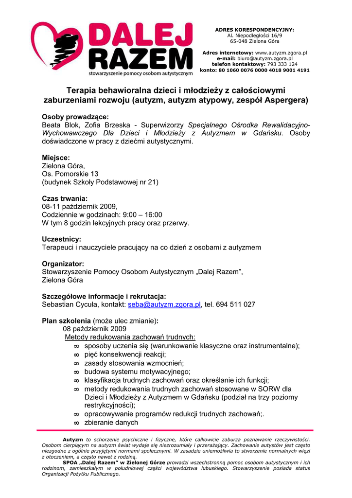 ADRES KORESPONDENCYJNY: Al. Niepodległości 16/9 65-048 Zielona Góra Adres internetowy: www.autyzm.zgora.pl e-mail: [email protected] telefon kontaktowy: 793 333 124 konto: 80 1060 0076 0000 4018 9001 4191 Terapia behawioralna dzieci i młodzieży z całościowymi zaburzeniami rozwoju (autyzm, autyzm atypowy, zespół Aspergera) Osoby prowadzące: Beata Blok, Zofia Brzeska - Superwizorzy Specjalnego Ośrodka RewalidacyjnoWychowawczego Dla Dzieci i Młodzieży z Autyzmem w Gdańsku. Osoby doświadczone w pracy z dziećmi autystycznymi. Miejsce: Zielona Góra, Os. Pomorskie 13 (budynek Szkoły Podstawowej nr 21) Czas trwania: 08-11 październik 2009, Codziennie w godzinach: 9:00 – 16:00 W tym 8 godzin lekcyjnych pracy oraz przerwy. Uczestnicy: Terapeuci i nauczyciele pracujący na co dzień z osobami z autyzmem Organizator: Stowarzyszenie Pomocy Osobom Autystycznym „Dalej Razem”, Zielona Góra Szczegółowe informacje i rekrutacja: Sebastian Cycuła, kontakt: [email protected], tel. 694 511 027 Plan szkolenia (może ulec zmianie): 08 październik 2009 Metody redukowania zachowań trudnych: • sposoby uczenia się (warunkowanie klasyczne oraz instrumentalne); • pięć konsekwencji reakcji; • zasady stosowania wzmocnień; • budowa systemu motywacyjnego; • klasyfikacja trudnych zachowań oraz określanie ich funkcji; • metody redukowania trudnych zachowań stosowane w SORW dla Dzieci i Młodzieży z Autyzmem w Gdańsku (podział na trzy poziomy restrykcyjności); • opracowywanie programów redukcji trudnych zachowań;. • zbieranie danych Autyzm to schorzenie psychiczne i fizyczne, które całkowicie zaburza poznawanie rzeczywistości. Osobom cierpiącym na autyzm świat wydaje się niezrozumiały i przeraŜający. Zachowanie autystów jest często niezgodne z ogólnie przyjętymi normami społecznymi. W zasadzie uniemoŜliwia to stworzenie normalnych więzi z otoczeniem, a często nawet z rodziną. SPOA „Dalej Razem” w Zielonej Górze prowadzi wszechstronną pomoc osobom autystycznym i ich rodzinom, zamieszkałym w południowej części województwa lubuskiego. Stowarzyszenie posiada status Organizacji PoŜytku Publicznego. ADRES KORESPONDENCYJNY: Al. Niepodległości 16/9 65-048 Zielona Góra Adres internetowy: www.autyzm.zgora.pl e-mail: [email protected] telefon kontaktowy: 793 333 124 konto: 80 1060 0076 0000 4018 9001 4191 09 październik 2009 Teoria umysłu: • wyjaśnienie pojęcia • deficyty wynikające z braku prawidłowo rozwiniętej teorii umysłu u osób ze spektrum autyzmu • metody sprawdzające etapy rozwoju teorii umysłu • programy dotyczące budowania umiejętności dotyczących rozwoju teorii umysłu 10 październik 2009 Metody pracy z osobami z autyzmem: • kształtowanie; • metoda wyodrębnionych prób; • uczenie incydentalne; • plany aktywności; • videomodelowanie; • uczenie inicjowania i podtrzymywania konwersacji metodą skryptów i ich wycofywania • zasady budowania programów edukacyjnych; • tworzenie programów edukacyjnych; • zbieranie danych 11 październik 2009 Integrowanie dzieci z autyzmem z dziećmi typowo rozwijającymi się: • przygotowanie dzieci z autyzmem do procesu integracji; • rola wychowawcy grupy, rola nauczyciela wspomagającego, rola nauczyciela – cienia; • budowanie programów społecznych; • trzy płaszczyzny pracy: indywidualna, w małej grupie rówieśniczej oraz w całej grupie. Szkolenia realizowane w ramach projektu: „Specjalistyczne Wsparcie Drogą do Upodmiotowienia Osób z Autyzmem z Południowej Części Województwa Lubuskiego” współfinansowanego ze środków Ministerstwa Pracy i Polityki Społecznej. Autyzm to schorzenie psychiczne i fizyczne, które całkowicie zaburza poznawanie rzeczywistości. Osobom cierpiącym na autyzm świat wydaje się niezrozumiały i przeraŜający. Zachowanie autystów jest często niezgodne z ogólnie przyjętymi normami społecznymi. W zasadzie uniemoŜliwia to stworzenie normalnych więzi z otoczeniem, a często nawet z rodziną. SPOA „Dalej Razem” w Zielonej Górze prowadzi wszechstronną pomoc osobom autystycznym i ich rodzinom, zamieszkałym w południowej części województwa lubuskiego. Stowarzyszenie posiada status Organizacji PoŜytku Publicznego.