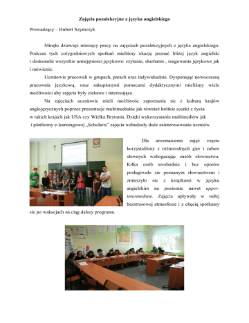 Zajęcia pozalekcyjne z języka angielskiego Prowadzący – Hubert Szymczyk Minęło dziewięć miesięcy pracy na zajęciach pozalekcyjnych z języka angielskiego. Podczas tych cotygodniowych spotkań mieliśmy okazję poznać bliżej język angielski i doskonalić wszystkie umiejętności językowe: czytanie, słuchanie , reagowanie językowe jak i mówienie. Uczniowie pracowali w grupach, parach oraz indywidualnie. Dysponując nowoczesną pracownia językową, oraz zakupionymi pomocami dydaktycznymi mieliśmy wiele możliwości aby zajęcia były ciekawe i interesujące. Na zajęciach uczniowie mieli możliwośc zapoznania sie z kulturą krajów anglojęzycznych poprzez prezentacje multimedialne jak również krótkie scenki z życia w takich krajach jak USA czy Wielka Brytania. Dzięki wykorzystaniu multimediów jak i platformy e-learningowej „Scholaris” zajęcia wzbudzały duże zainteresowanie uczniów Dla urozmaicenia zajęć często korzystaliśmy z różnorodnych gier i zabaw słownych wzbogacając zasób słownictwa. Kilka osób swobodnie i bez oporów posługiwało sie poznanym słownictwem i zmierzyło angielskim sie na z książkami poziomie w języku nawet upper- intermediate. Zajęcia upływały w miłej bezstresowej atmosferze i z chęcią spotkamy sie po wakacjach na ciąg dalszy programu.