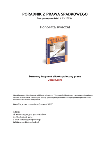 PORADNIK Z PRAWA SPADKOWEGO Stan prawny na dzień 1.03.2005 r. Honorata Kwiczal Darmowy fragment eBooka polecony przez Jelcyn.com EBook bezpłatny. Handlowanie publikacją zabronione. Tekst może być kopiowany i powielany w istniejącym układzie strukturalnym i graficznym. Na inny sposób wykorzystania eBooka wymagana jest pisemna zgoda administratora serwisu Dobry eBook. Wszelkie prawa zastrzeżone © 2005 ARDEO ARDEO ul. Konecznego 6/58, 31-216 Kraków tel./fax (12) 416 31 74 e-mail: [email protected] WWW: www.DobryeBook.pl Stan prawny na dzień 1.03.2005 r. Honorata Kwiczal eBook PORADNIK Z PRAWA SPADKOWEGO Spis treści pełnej wersji eBooka Kolorem czerwonym wyróżnione są dostępne darmowe fragmenty 1 Wykaz skrótów i słowniczek 5 2 Wstęp 6 3 Kiedy i w jaki sposób należy dokonać stwierdzenia nabycia spadku? I. Wniosek o stwierdzenie nabycia spadku II. W jakiej formie i w jakim czasie można spadek przyjąć lub 7-10 10-14 odrzucić? III. Kiedy warto pomyśleć o odrzuceniu spadku? 14-15 IV. Co zrobić, gdy dłużnik — spadkobierca spadek odrzucił? 15-16 V. Zabezpieczenie przedmiotów wchodzących w skład spadku 16-17 VI. Czy można zmienić postanowienie o stwierdzeniu nabycia 17-18 spadku? 4 Kto dziedziczy, a kto może być uznany za niegodnego dziedziczenia? Dziedziczenie z ustawy 19-21 II. Dziedziczenie z testamentu 21-22 I. III. Dziedziczenie między małżonkami IV. Dziedziczenie przy rozwodzie V. Dziedziczenie przy separacji VI. Dziedziczenie między konkubentami 22 23-24 24 24-25 VII. Dziedziczenie przy adopcji dziecka VIII. Dziedziczenie po zmarłym pracowniku IX. Dziedziczenie środków zgromadzonych na rachunkach 25-26 27 27-28 bankowych X. Kiedy spadkobierca może być uznany za niegodnego 28-29 dziedziczenia? 5 Testament I. 6 W jaki sposób sporządzić testament? 30-32 II. W jaki sposób odwołać testament? 33-34 III. Kiedy można testament unieważnić? 34-36 Zachowek I. Kto i w jakiej formie może otrzymać zachowek? 37 II. Kto zachowku nie otrzyma? 37-38 III. Jak obliczyć zachowek? 38-39 IV. Czy darowizna dokonana przez zmarłego ma wpływ na 39-41 wysokość zachowku? V. Od kogo można żądać wypłaty zachowku? VI. W jaki sposób i w jakim terminie można dochodzić zachowku? 7 42 Wydziedziczenie I. Jak można wydziedziczyć? II. Co zrobić, gdy zostaliśmy wydziedziczeni? 8 41-42 43-44 44 Dział spadku I. Jak dokonać podziału majątku pozostawionego przez 45-46 spadkodawcę? II. Czy darowizny dokonane przez zmarłego wpływają na 46-47 zmniejszenie schedy spadkowej? III. Kiedy można sprzedać odziedziczoną rzecz? 9 48 Spadek z długami I. W jakim zakresie spadkobierca odpowiada za długi 49-52 pozostawione przez spadkodawcę? II. Co zrobić, by nie płacić długów spadkodawcy? III. Odpowiedzialność za długi spadkowe po ogłoszeniu upadłości 10 53-54 54 Umowy spadkowe I. Czy można zrzec się spadku na rzecz innej osoby? 55 II. Czy i kiedy można zbyć spadek w drodze umowy? 55-56 III. Kiedy spadkobierca może zostać wpisany do księgi wieczystej 57-58 w miejsce spadkodawcy? 11 Podatek od spadków 12 Wzory pism procesowych i opłaty I. 59-62 63 Wzór I — Wniosek o stwierdzenie nabycia spadku na podstawie ustawy II. Wzór II — Wniosek o otwarcie i ogłoszenie testamentu 64 III. Wzór III — Wniosek o stwierdzenie nabycia spadku na 65 podstawie testamentu IV. Wzór IV — Wniosek o zobowiązanie do złożenia testamentu 66 V. Wzór V — Wniosek o przesłuchanie świadka testamentu 67 ustnego 68 VI. Wzór VI — Wniosek o zatwierdzenie oświadczenia o uchyleniu się od skutków prawnych oświadczenia o przyjęciu/odrzuceniu spadku VII. Wzór VII — Wniosek o zabezpieczenie spadku 69 VIII. Wzór VIII — Wniosek o zmianę postanowienie o stwierdzeniu 70 nabycia spadku 71 IX. Wzór IX — Pozew o uznanie spadkobiercy za niegodnego dziedziczenia 13 X. Wzór X — Testament własnoręczny wraz z wydziedziczeniem 72 XI. Wzór XI — Pozew o zachowek 73 XII. Wzór XII — Wniosek o dział spadku 74 Podstawowe przepisy z prawa spadkowego I. Kodeks cywilny, księga IV — spadki II. Ustawa o podatku od spadków i darowizn 14 Bibliografia 75-94 95-106 107 www.DobryeBook.pl Poradnik z prawa spadkowego Wstęp 2 5 Wstęp Przeprowadzenie spadku po zmarłym członku rodziny to jedna z czynności prawnych, której każdy musi dokonać przynajmniej raz w życiu. Czynność ta jest ważna z tej przyczyny, że porządkuje stosunki własnościowe między spadkobiercami pozostawionymi przez spadkodawcę. Przykład Jan i Barbara odziedziczyli nieruchomość po swoim ojcu Adamie, który uprzednio odziedziczył tę nieruchomość po swoim ojcu Jerzym. Jednak Adam nie przeprowadził spadku po swoim ojcu Jerzym wskutek czego w księdze wieczystej prowadzonej dla nieruchomości nadal figuruje Jerzy zamiast Adama. W takiej sytuacji Jan i Barbara muszą przeprowadzić dwa postępowania spadkowe: jedno w którym sąd stwierdzi, że spadek po Jerzym nabył Adam i drugie, w którym sąd stwierdzi, iż spadek po Adamie nabyli: Barbara i Jan. Gdyby Adam nie zaniedbał przeprowadzenia spadku stosunki własnościowe dotyczące nieruchomości byłyby bardziej przejrzyste, a jego dzieci nie musiałyby przeprowadzać aż dwóch postępowań spadkowych, gdyż wystarczyłoby stwierdzenie nabycia spadku po ojcu. Wówczas Jan i Barbara szybciej uzyskaliby, np. wpis prawa własności do księgi wieczystej nieruchomości, co byłoby szczególnie ważne, gdyby mieli zamiar szybkiego sprzedania odziedziczonej nieruchomości. Przytoczony przykład obrazuje jak istotne dla spadkobierców jest uporządkowanie prawa własności przedmiotów wchodzących w skład spadku po zmarłym spadkodawcy. Niniejszy poradnik zawiera kompleksowy zbiór zasad postępowania ze spadkiem i ma na celu ułatwienie spadkobiercom uporządkowania stosunków własnościowych po zmarłym członku rodziny. Napisany został językiem przystępnym dla osób nie posiadających wykształcenia prawniczego, by m