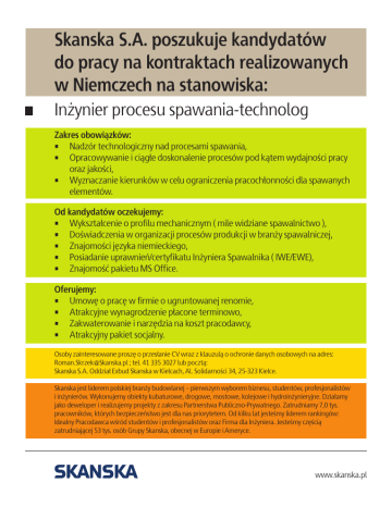 Skanska S.A. poszukuje kandydatów do pracy na kontraktach realizowanych w Niemczech na stanowiska: Inżynier procesu spawania-technolog Zakres obowiązków: • Nadzór technologiczny nad procesami spawania, • Opracowywanie i ciągłe doskonalenie procesów pod kątem wydajności pracy oraz jakości, • Wyznaczanie kierunków w celu ograniczenia pracochłonności dla spawanych elementów. Od kandydatów oczekujemy: • Wykształcenie o profilu mechanicznym ( mile widziane spawalnictwo ), • Doświadczenia w organizacji procesów produkcji w branży spawalniczej, • Znajomości języka niemieckiego, • Posiadanie uprawnień/certyfikatu Inżyniera Spawalnika ( IWE/EWE), • Znajomość pakietu MS Office. Oferujemy: • Umowę o pracę w firmie o ugruntowanej renomie, • Atrakcyjne wynagrodzenie płacone terminowo, • Zakwaterowanie i narzędzia na koszt pracodawcy, • Atrakcyjny pakiet socjalny. Osoby zainteresowane proszę o przesłanie CV wraz z klauzulą o ochronie danych osobowych na adres: [email protected] ; tel. 41 335 3027 lub pocztą: Skanska S.A. Oddział Exbud Skanska w Kielcach, Al. Solidarności 34, 25-323 Kielce. Skanska jest liderem polskiej branży budowlanej – pierwszym wyborem biznesu, studentów, profesjonalistów i inżynierów. Wykonujemy obiekty kubaturowe, drogowe, mostowe, kolejowe i hydroinżynieryjne. Działamy jako deweloper i realizujemy projekty z zakresu Partnerstwa Publiczno-Prywatnego. Zatrudniamy 7,0 tys. pracowników, których bezpieczeństwo jest dla nas priorytetem. Od kilku lat jesteśmy liderem rankingów: Idealny Pracodawca wśród studentów i profesjonalistów oraz Firma dla Inżyniera. Jesteśmy częścią zatrudniającej 53 tys. osób Grupy Skanska, obecnej w Europie i Ameryce. www.skanska.pl