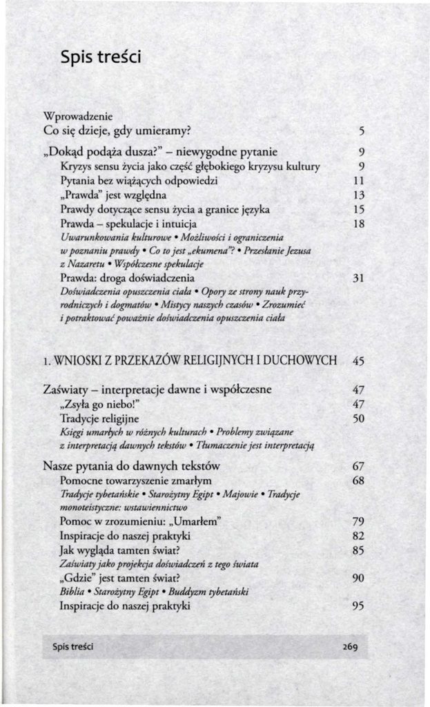 Spis tresci Wprowadzenie Co sicr dzieje, gdy umieramy? 5 , Dolqd poda,Za dusza?" - niewygodne pytanie 9 K.ryzys ensu zycia jako ~c gh;bokiego kryzysu kulrury Pytania bez wia,iqcych odpowiedzi , Prawda" jesr wzglcrdna Prawdy dorycz:!,ce sensu iycia a gran ice jcrzyka Prawda - spekulacje i inruicja Uwarunkowania kulturowe • Moiliwofci i ogranicunia w poznaniu prawdy • Co to jest ,ekumena"? • Pruslanie jezusa z NIZZilretu • WspO/czesne spekulacje Prawda: droga doswiadczenia Dofwiadczenia opuszczenia cia/a • Opory u strony nauk przyrodniczych i dogmatcw • Mistycy naszych czasow • Zrozumid i potraktowai powai.nie dofwiadcunia opuszczenia cia/a 1. WNIOSKI Z PRZEKAZ6W RELIGIJNYCH I DUCHOWYCH Za5wiary- inrerpretacje dawne i wsp&czesne , Zsyta go niebo!" Tradycje religijne !Uirgi umarl:ych w roinych kulturach • Problemy zwiqzane z inurpretacj4 dawnych ukstow • Tlumacunie jest inurpretacj4 Nasze pytania do dawnych tekst6w Pomocne cowarzyszenie zmar!ym Tradycje tybetafzskie • Staroiytny Egipt • Majowie • Tradycje monoteistyczne: wstawiennictwo Po moe w zrozumieniu: , Umarlem" lnspiracje do naszej prakryki Jak wygl'lda ramren swiac? Zaiwiaty jako projekcja dofwiadcun z tego fwiata , Gdzie" jesr ramcen 5wiat? Biblia • Staroiytny Egipt • Buddyzm tybetanski Inspiracje do naszej prakcyki Spis tresci 9 11 13 15 18 31 45 47 47 50 67 68 79 82 85 90 95 269 P6j 'C. w kierunku 5wiat!a 98 'ld Ostareczny Archeryp taroiytny Egipt • Biblia i Koran Pochodzenie moryw6w I 03 104 111 Tradycj~ monouistyczn~ Wyrok 116 Tradycj~ monottistyczn~ • Buddyzm tyb~tanski • Majowi~ In piracje do naszej prakryki Za.radni= doiwiadc:uni~: krucho!C czlowi~ka • Wina, wolnofc i pruba=ni~ • Dzisicjsza tmdmcja do bagaulizowania winy • Nasz wziJr: ]nus wobu winy • Uczyc sir na podstawi~ doiwiadcunia winy Pieklo, jego wladcy i mieszkancy Por6wnania kulrurowe taroiytny Egipt • Biblia • Tradycj~ poznicjsu od Biblii • Koran • Buddyzm tyb~tanski • Majowi~ lnspiracje do naszej prakryki Odpokutowae win( • Przywrocic mirdzyludzkq harmonir • Pokuta musi odpowiadac wini~ • Przyklad j a.usa: wziqc win( na powaini~ - i prubaczyc 122 134 135 151 Niebo Wyobraienia o z.aSwiarach Tradycj~ monouistyczn~ • Buddyzm • taroiytny Egipt In piracje do naszej prakryki 160 160 C zysciec Duchowy wzrost Dygmja: kilka uwag o "inkarnacji rnspiracje do naszej prakryki Pami<;taj o smierci i kochaj i.ycie 17 1 173 176 177 WNIO KI Z DOSWIADCZE , 183 Oo5wiadczenia opuszczenia ciab Wizje , miejsc" Zmieniona 5wiadomo 'c Poszerzanie si<; 5wiadomosci 185 185 186 187 2. 270 168 Dokijd podijia dusza? Wszechogarniaj~ca wi~ 189 191 Daleko i~ne kon ekwencje Milofc • Odpowi~dzia/nofC • Trwak zwiqzki Do5wiadczenia z gt~boko si~gaj~cymi nas r~psrwarni 196 Prurai:Ajqu dofwiadcunia b(Zpofr~dnifj b/iskofci fmi~rci • Rozwoj w i:ycitt duchowym • Fizyczn~ i psychiczn~ uzdrowi~nie a ile , prawdziwe" ~ rakie do5wiadczenia? Postrugani~ pozazmyslow~ podczas dofwiadczmia 201 opu.szczmia ciala • Mistyka i fmim • Czy to jest ,ruczywisu"? porkania podczas doswiadczen opuszczenia data 212 Dofwiadcunia zwiqzan~ u fwiatkm • >jJOtkani~ z wlasnym i:yci~m • Spotkania z istotami • >jJotkani~ z wyroki~m skazujqcym • >jJOtkani~ z pi~klem potkania wstf74Saj'lce i zmuszaj'lce do stawiania pytan Isrory duchowe w rradycj i ryberanskiej 225 226 Ksirga umarlych • Ki/kudniowe podrou po zafwiatach Konfronracja z wewn~trznymi obrazami Kulrurowe zdeterminowanie kai.dego doswiadczenia za5wiar6w Granice por6wnan mi~dzykulrurowych In piracje do naszej prakryki Konkluzje W drodze do arnego siebie Nad~dne znaczenie 5wiado 'ci Powotanie cztowieka do rranscendencji Ruszac w drog~ z ufno'ci~ Podsumowanie: czego si~ nauczylismy? Ja sam pono~ odpowiedzialno'c za swoje umieranie In piracje do naszej prakryki zczerosc w ro unku do sarnego iebie: nadzieja i ufnosc bja5nienia kr6r6w dory~cych cytar6w z Pisma 5w. 234 238 242 244 248 248 250 251 252 255 256 258 260 263 tary ustament • Nowy ustammt Bibliografia cyrowana Bibliografia polska Spis tresci 265 267 271