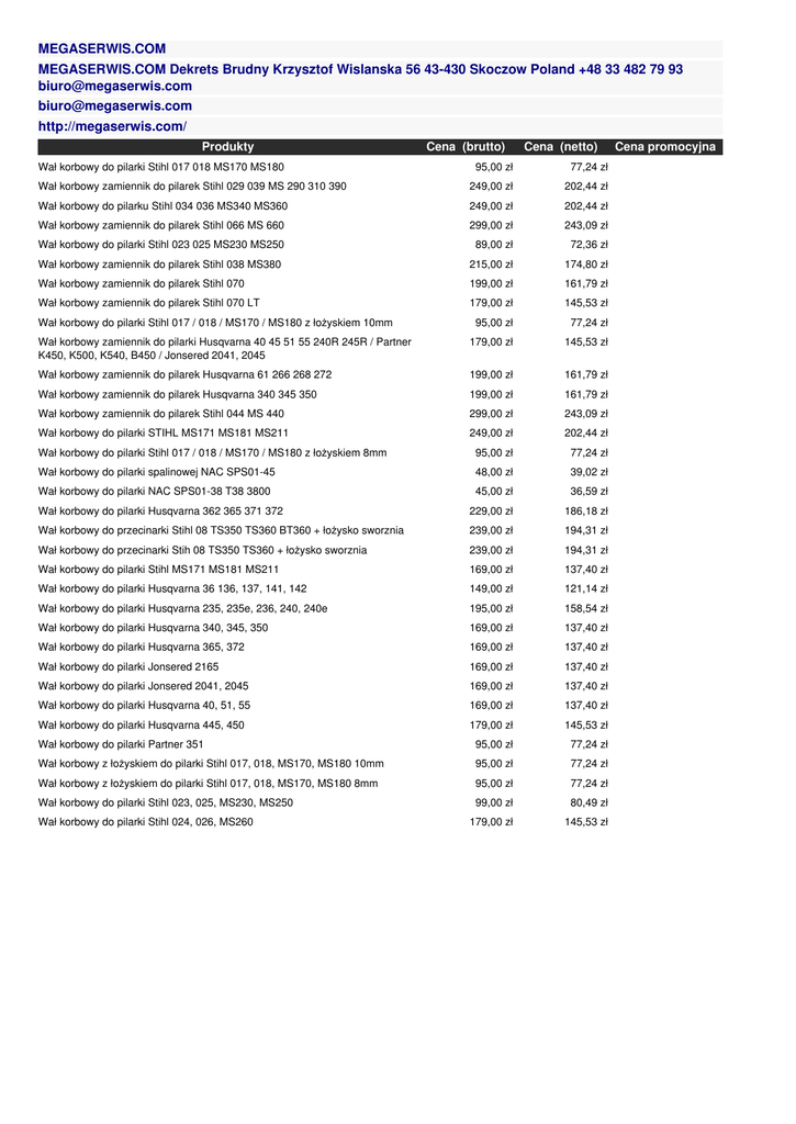 MEGASERWIS.COM MEGASERWIS.COM Dekrets Brudny Krzysztof Wislanska 56 43-430 Skoczow Poland +48 33 482 79 93 [email protected] [email protected] http://megaserwis.com/ Produkty Wał korbowy do pilarki Stihl 017 018 MS170 MS180 Cena (brutto) Cena (netto) Cena promocyjna 95,00 zł 77,24 zł Wał korbowy zamiennik do pilarek Stihl 029 039 MS 290 310 390 249,00 zł 202,44 zł Wał korbowy do pilarku Stihl 034 036 MS340 MS360 249,00 zł 202,44 zł Wał korbowy zamiennik do pilarek Stihl 066 MS 660 299,00 zł 243,09 zł Wał korbowy do pilarki Stihl 023 025 MS230 MS250 89,00 zł 72,36 zł Wał korbowy zamiennik do pilarek Stihl 038 MS380 215,00 zł 174,80 zł Wał korbowy zamiennik do pilarek Stihl 070 199,00 zł 161,79 zł Wał korbowy zamiennik do pilarek Stihl 070 LT 179,00 zł 145,53 zł Wał korbowy do pilarki Stihl 017 / 018 / MS170 / MS180 z łożyskiem 10mm 95,00 zł 77,24 zł Wał korbowy zamiennik do pilarki Husqvarna 40 45 51 55 240R 245R / Partner K450, K500, K540, B450 / Jonsered 2041, 2045 179,00 zł 145,53 zł Wał korbowy zamiennik do pilarek Husqvarna 61 266 268 272 199,00 zł 161,79 zł Wał korbowy zamiennik do pilarek Husqvarna 340 345 350 199,00 zł 161,79 zł Wał korbowy zamiennik do pilarek Stihl 044 MS 440 299,00 zł 243,09 zł Wał korbowy do pilarki STIHL MS171 MS181 MS211 249,00 zł 202,44 zł Wał korbowy do pilarki Stihl 017 / 018 / MS170 / MS180 z łożyskiem 8mm 95,00 zł 77,24 zł Wał korbowy do pilarki spalinowej NAC SPS01-45 48,00 zł 39,02 zł Wał korbowy do pilarki NAC SPS01-38 T38 3800 45,00 zł 36,59 zł Wał korbowy do pilarki Husqvarna 362 365 371 372 229,00 zł 186,18 zł Wał korbowy do przecinarki Stihl 08 TS350 TS360 BT360 + łożysko sworznia 239,00 zł 194,31 zł Wał korbowy do przecinarki Stih 08 TS350 TS360 + łożysko sworznia 239,00 zł 194,31 zł Wał korbowy do pilarki Stihl MS171 MS181 MS211 169,00 zł 137,40 zł Wał korbowy do pilarki Husqvarna 36 136, 137, 141, 142 149,00 zł 121,14 zł Wał korbowy do pilarki Husqvarna 235, 235e, 236, 240, 240e 195,00 zł 158,54 zł Wał korbowy do pilarki Husqvarna 340, 345, 350 169,00 zł 137,40 zł Wał korbowy do pilarki Husqvarna 365, 372 169,00 zł 137,40 zł Wał korbowy do pilarki Jonsered 2165 169,00 zł 137,40 zł Wał korbowy do pilarki Jonsered 2041, 2045 169,00 zł 137,40 zł Wał korbowy do pilarki Husqvarna 40, 51, 55 169,00 zł 137,40 zł Wał korbowy do pilarki Husqvarna 445, 450 179,00 zł 145,53 zł Wał korbowy do pilarki Partner 351 95,00 zł 77,24 zł Wał korbowy z łożyskiem do pilarki Stihl 017, 018, MS170, MS180 10mm 95,00 zł 77,24 zł Wał korbowy z łożyskiem do pilarki Stihl 017, 018, MS170, MS180 8mm 95,00 zł 77,24 zł 99,00 zł 80,49 zł 179,00 zł 145,53 zł Wał korbowy do pilarki Stihl 023, 025, MS230, MS250 Wał korbowy do pilarki Stihl 024, 026, MS260