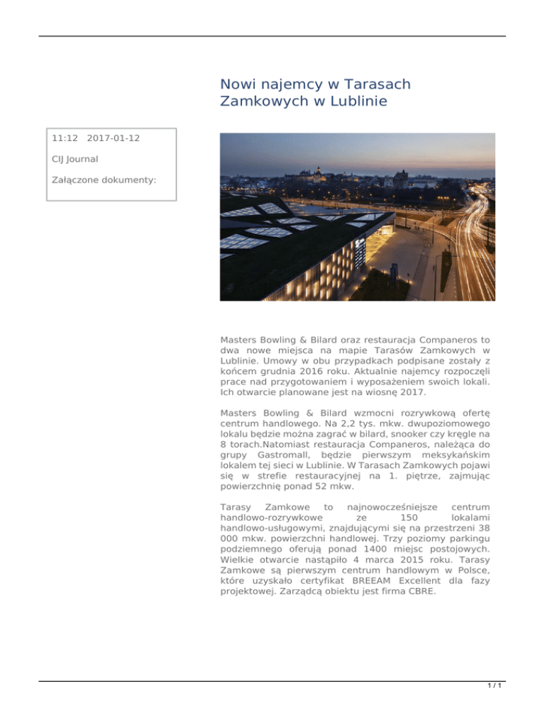 Nowi najemcy w Tarasach Zamkowych w Lublinie 11:12 2017-01-12 CIJ Journal Załączone dokumenty: Masters Bowling & Bilard oraz restauracja Companeros to dwa nowe miejsca na mapie Tarasów Zamkowych w Lublinie. Umowy w obu przypadkach podpisane zostały z końcem grudnia 2016 roku. Aktualnie najemcy rozpoczęli prace nad przygotowaniem i wyposażeniem swoich lokali. Ich otwarcie planowane jest na wiosnę 2017. Masters Bowling & Bilard wzmocni rozrywkową ofertę centrum handlowego. Na 2,2 tys. mkw. dwupoziomowego lokalu będzie można zagrać w bilard, snooker czy kręgle na 8 torach.Natomiast restauracja Companeros, należąca do grupy Gastromall, będzie pierwszym meksykańskim lokalem tej sieci w Lublinie. W Tarasach Zamkowych pojawi się w strefie restauracyjnej na 1. piętrze, zajmując powierzchnię ponad 52 mkw. Tarasy Zamkowe to najnowocześniejsze centrum handlowo-rozrywkowe ze 150 lokalami handlowo-usługowymi, znajdującymi się na przestrzeni 38 000 mkw. powierzchni handlowej. Trzy poziomy parkingu podziemnego oferują ponad 1400 miejsc postojowych. Wielkie otwarcie nastąpiło 4 marca 2015 roku. Tarasy Zamkowe są pierwszym centrum handlowym w Polsce, które uzyskało certyfikat BREEAM Excellent dla fazy projektowej. Zarządcą obiektu jest firma CBRE. 1/1