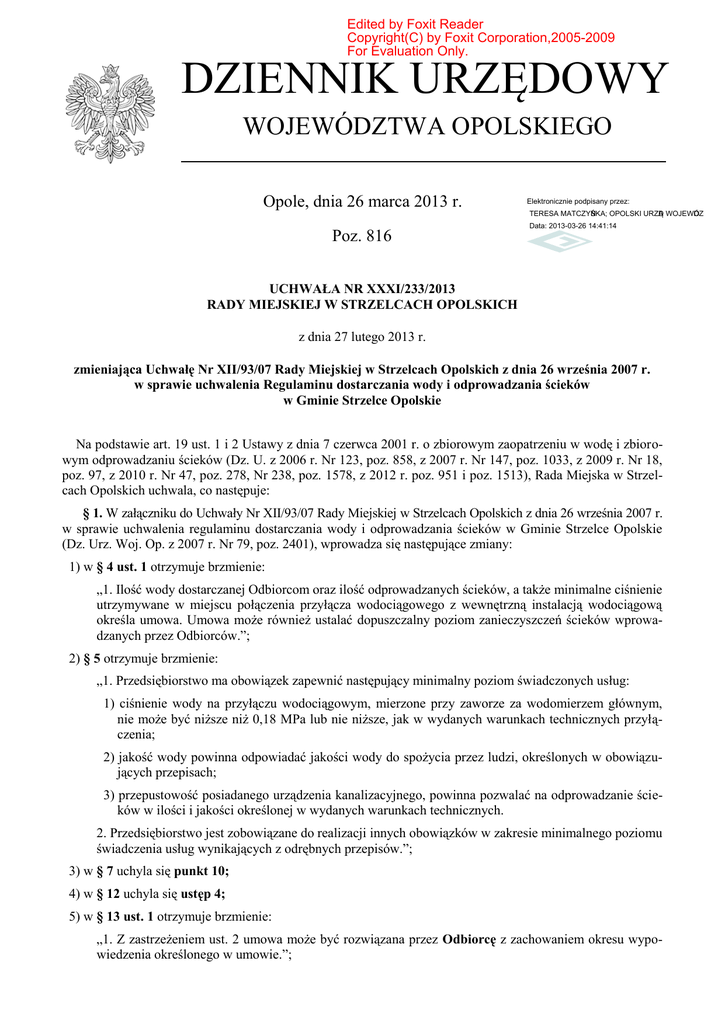Edited by Foxit Reader Copyright(C) by Foxit Corporation,2005-2009 For Evaluation Only. DZIENNIK URZĘDOWY WOJEWÓDZTWA OPOLSKIEGO Opole, dnia 26 marca 2013 r. Elektronicznie podpisany przez: TERESA MATCZYŃSKA; OPOLSKI URZĄD WOJEWÓDZKI Poz. 816 Data: 2013-03-26 14:41:14 UCHWAŁA NR XXXI/233/2013 RADY MIEJSKIEJ W STRZELCACH OPOLSKICH z dnia 27 lutego 2013 r. zmieniająca Uchwałę Nr XII/93/07 Rady Miejskiej w Strzelcach Opolskich z dnia 26 września 2007 r. w sprawie uchwalenia Regulaminu dostarczania wody i odprowadzania ścieków w Gminie Strzelce Opolskie Na podstawie art. 19 ust. 1 i 2 Ustawy z dnia 7 czerwca 2001 r. o zbiorowym zaopatrzeniu w wodę i zbiorowym odprowadzaniu ścieków (Dz. U. z 2006 r. Nr 123, poz. 858, z 2007 r. Nr 147, poz. 1033, z 2009 r. Nr 18, poz. 97, z 2010 r. Nr 47, poz. 278, Nr 238, poz. 1578, z 2012 r. poz. 951 i poz. 1513), Rada Miejska w Strzelcach Opolskich uchwala, co następuje: § 1. W załączniku do Uchwały Nr XII/93/07 Rady Miejskiej w Strzelcach Opolskich z dnia 26 września 2007 r. w sprawie uchwalenia regulaminu dostarczania wody i odprowadzania ścieków w Gminie Strzelce Opolskie (Dz. Urz. Woj. Op. z 2007 r. Nr 79, poz. 2401), wprowadza się następujące zmiany: 1) w § 4 ust. 1 otrzymuje brzmienie: „1. Ilość wody dostarczanej Odbiorcom oraz ilość odprowadzanych ścieków, a także minimalne ciśnienie utrzymywane w miejscu połączenia przyłącza wodociągowego z wewnętrzną instalacją wodociągową określa umowa. Umowa może również ustalać dopuszczalny poziom zanieczyszczeń ścieków wprowadzanych przez Odbiorców.”; 2) § 5 otrzymuje brzmienie: „1. Przedsiębiorstwo ma obowiązek zapewnić następujący minimalny poziom świadczonych usług: 1) ciśnienie wody na przyłączu wodociągowym, mierzone przy zaworze za wodomierzem głównym, nie może być niższe niż 0,18 MPa lub nie niższe, jak w wydanych warunkach technicznych przyłączenia; 2) jakość wody powinna odpowiadać jakości wody do spożycia przez ludzi, określonych w obowiązujących przepisach; 3) przepustowość posiadanego urządzenia kanalizacyjnego, powinna pozwalać na odprowadzanie ścieków w ilości i jakości określonej w wydanych warunkach technicznych. 2. Przedsiębiorstwo jest zobowiązane do realizacji innych obowiązków w zakresie minimalnego poziomu świadczenia usług wynikających z odrębnych przepisów.”; 3) w § 7 uchyla się punkt 10; 4) w § 12 uchyla się ustęp 4; 5) w § 13 ust. 1 otrzymuje brzmienie: „1. Z zastrzeżeniem ust. 2 umowa może być rozwiązana przez Odbiorcę z zachowaniem okresu wypowiedzenia określonego w umowie.”; Dziennik Urzędowy Województwa Opolskiego –2– Poz. 816 6) w § 13 uchyla się ustępy 3, 4 i 5; 7) w § 15 ust. 1 uchyla się lit. a; 8) w § 17 pkt 3 uchyla się lit. b; 9) w § 19 ust. 3 otrzymuje brzmienie: „3. Odbiorca otrzymuje fakturę nie później niż w 21 dni: 1) od daty dokonania odczytu; 2) od końca okresu obrachunkowego w sytuacji, kiedy ilość świadczonych usług jest ustalana na innej podstawie niż wskazania wodomierza lub urządzenia pomiarowego.”; 10) w § 20 ust. 1 pkt 2 uchyla się słowa „oraz tytułu prawnego”; 11) w § 22 ust. 1 otrzymuje brzmienie: „1. Jeżeli istnieją techniczne możliwości świadczenia usług, Przedsiębiorstwo w terminie do 30 dni od otrzymania prawidłowo wypełnionego i kompletnego wniosku, o którym mowa w § 20 i 21, wydaje osobie ubiegającej się o przyłączenie nieruchomości dokument pod nazwą Warunki przyłączenia do sieci wodociągowej i/lub kanalizacyjnej. W razie braku możliwości przyłączenia nieruchomości do sieci, Przedsiębiorstwo w terminie do 30 dni od otrzymania wniosku, o którym mowa w § 20 i 21, informuje o tym osobę ubiegającą się o przyłączenie, wskazując powody, które uniemożliwiają przyłączenie;”; 12) w § 22 ust. 3 pkt 2 otrzymuje brzmienie: „2) miejsce zainstalowania wodomierza głównego i/lub urządzenia pomiarowego;”; 13) w § 22 ust. 3 uchyla się pkt 3; 14) w § 22 uchyla się ust. 4; 15) uchyla się § 23; 16) w § 24 uchyla się ustęp 3; 17) w § 27 ust. 1 otrzymuje brzmienie: „1. W ramach prac związanych z odbiorem przyłącza, Przedsiębiorstwo dokonuje sprawdzenia zgodności wykonanych prac z wydanymi przez Przedsiębiorstwo Warunkami przyłączenia do sieci wodociągowej i/lub kanalizacyjnej i/lub z uzgodnioną pisemnie dokumentacją przyłącza.”; 18) w § 27 ust. 5 otrzymuje brzmienie: „5. Odbiór jest wykonywany przed zasypaniem przyłącza. Wszelkie odcinki przyłącza ulegające częściowemu zakryciu (tzw. prace zanikające) należy zgłaszać do Przedsiębiorstwa celem odbioru wykonanych robót przed ich zasypaniem.”. § 2. Wykonanie Uchwały powierza się Burmistrzowi Strzelec Opolskich. § 3. Uchwała wchodzi w życie po upływie 14 dni od dnia ogłoszenia w Dzienniku Urzędowym Województwa Opolskiego. Przewodniczący Rady Miejskiej Bogusław Farion