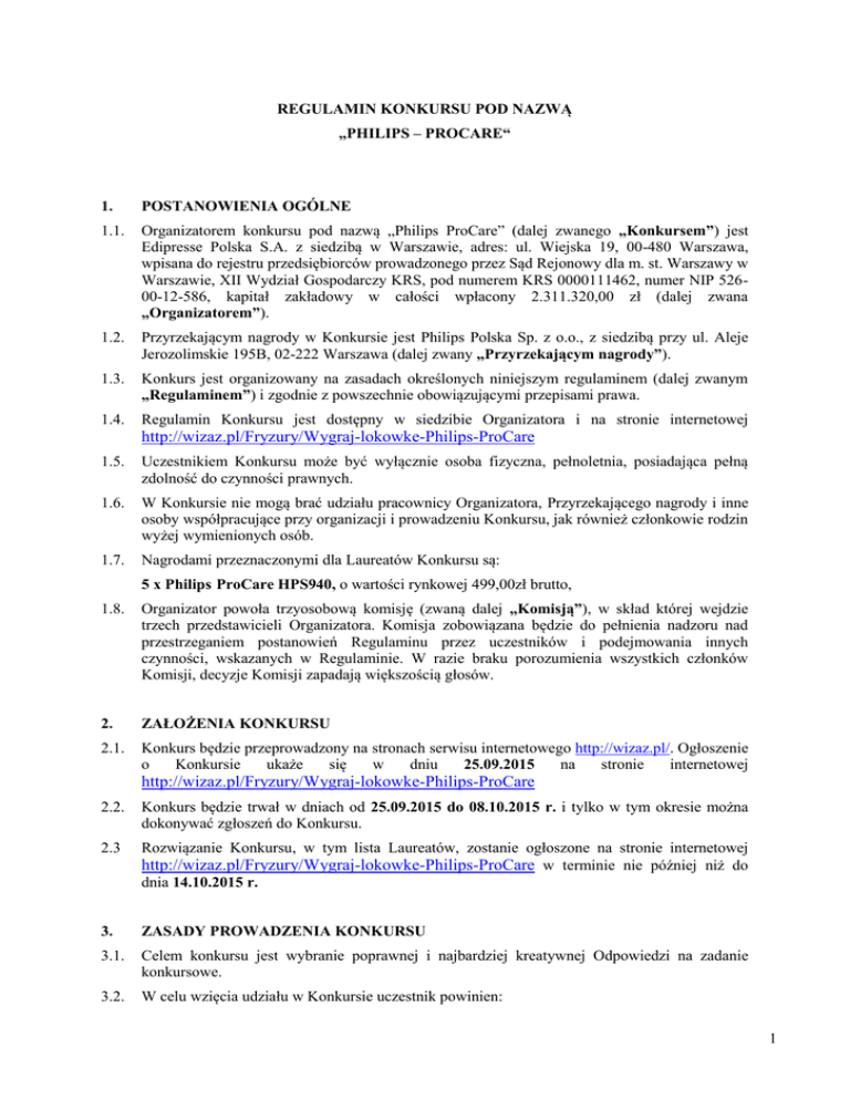 REGULAMIN KONKURSU POD NAZWĄ „PHILIPS – PROCARE“ 1. POSTANOWIENIA OGÓLNE 1.1. Organizatorem konkursu pod nazwą „Philips ProCare” (dalej zwanego „Konkursem”) jest Edipresse Polska S.A. z siedzibą w Warszawie, adres: ul. Wiejska 19, 00-480 Warszawa, wpisana do rejestru przedsiębiorców prowadzonego przez Sąd Rejonowy dla m. st. Warszawy w Warszawie, XII Wydział Gospodarczy KRS, pod numerem KRS 0000111462, numer NIP 52600-12-586, kapitał zakładowy w całości wpłacony 2.311.320,00 zł (dalej zwana „Organizatorem”). 1.2. Przyrzekającym nagrody w Konkursie jest Philips Polska Sp. z o.o., z siedzibą przy ul. Aleje Jerozolimskie 195B, 02-222 Warszawa (dalej zwany „Przyrzekającym nagrody”). 1.3. Konkurs jest organizowany na zasadach określonych niniejszym regulaminem (dalej zwanym „Regulaminem”) i zgodnie z powszechnie obowiązującymi przepisami prawa. 1.4. Regulamin Konkursu jest dostępny w siedzibie Organizatora i na stronie internetowej http://wizaz.pl/Fryzury/Wygraj-lokowke-Philips-ProCare 1.5. Uczestnikiem Konkursu może być wyłącznie osoba fizyczna, pełnoletnia, posiadająca pełną zdolność do czynności prawnych. 1.6. W Konkursie nie mogą brać udziału pracownicy Organizatora, Przyrzekającego nagrody i inne osoby współpracujące przy organizacji i prowadzeniu Konkursu, jak również członkowie rodzin wyżej wymienionych osób. 1.7. Nagrodami przeznaczonymi dla Laureatów Konkursu są: 5 x Philips ProCare HPS940, o wartości rynkowej 499,00zł brutto, 1.8. Organizator powoła trzyosobową komisję (zwaną dalej „Komisją”), w skład której wejdzie trzech przedstawicieli Organizatora. Komisja zobowiązana będzie do pełnienia nadzoru nad przestrzeganiem postanowień Regulaminu przez uczestników i podejmowania innych czynności, wskazanych w Regulaminie. W razie braku porozumienia wszystkich członków Komisji, decyzje Komisji zapadają większością głosów. 2. ZAŁOŻENIA KONKURSU 2.1. Konkurs będzie przeprowadzony na stronach serwisu internetowego http://wizaz.pl/. Ogłoszenie o Konkursie ukaże się w dniu 25.09.2015 na stronie internetowej http://wizaz.pl/Fryzury/Wygraj-lokowke-Philips-ProCare 2.2. Konkurs będzie trwał w dniach od 25.09.2015 do 08.10.2015 r. i tylko w tym okresie można dokonywać zgłoszeń do Konkursu. 2.3 Rozwiązanie Konkursu, w tym lista Laureatów, zostanie ogłoszone na stronie internetowej http://wizaz.pl/Fryzury/Wygraj-lokowke-Philips-ProCare w terminie nie później niż do dnia 14.10.2015 r. 3. ZASADY PROWADZENIA KONKURSU 3.1. Celem konkursu jest wybranie poprawnej i najbardziej kreatywnej Odpowiedzi na zadanie konkursowe. 3.2. W celu wzięcia udziału w Konkursie uczestnik powinien: 1 1) wypełnić formularz zgłoszeniowy znajdujący się na stronie internetowej http://wizaz.pl/Fryzury/Wygraj-lokowke-Philips-ProCare , w tym złożyć stosowne oświadczenia i udzielić stosownych zgód stanowiących integralną część formularza zgłoszeniowego; 2) udzielić odpowiedzi na znajdujące się w formularzu zgłoszeniowym pytanie konkursowe „Ile razy w filmiku z Anią Dereszowską pada słowo 'loki'. Napisz, dlaczego właśnie ty powinnaś wygrać lokówkę Philips ProCare.”: (dalej zwanej „Odpowiedzią”); 3) przesłać formularz zgłoszeniowy do Organizatora za pomocą znajdującego się na dole formularza przycisku „Wyślij”; 3.3. Jeden uczestnik może wziąć udział w Konkursie tylko jeden raz. 3.4. Spośród wszystkich poprawnie przesłanych Odpowiedzi na pytanie konkursowe, Komisja wybierze 5 poprawnych i uznanych za najbardziej kreatywne Odpowiedzi. Przy wyborze najlepszych Odpowiedzi Komisja będzie się kierować własnym uznaniem, biorąc pod uwagę walory artystyczne Odpowiedzi, w szczególności oryginalność i pomysłowość uczestnika – autora Odpowiedzi. Nie ma znaczenia kolejność zgłoszeń. 3.5. Laureatami Konkursu w liczbie 5 zostaną uczestnicy, których Odpowiedzi na pytanie konkursowe zostaną uznane przez Komisję za najlepsze zgodnie z pkt 3.4 powyżej, zwani dalej „Laureatami”. Nagrody zostaną przyznana po spełnieniu warunków określonych w Regulaminie. 3.6. Uczestnik oświdcza, że Odpowiedź na pytanie konkursowe jest unikalną treścią, stworzoną przez niego specjalnie w celu wzięcia udziału w Konkursie, jak również, że nie jest publikowana w innych serwisach internetowych. 3.7. Odpowiedzi na pytanie konkursowe nie spełniające wymogów Regulaminu będą wykluczane z Konkursu przez Organizatora. 3.8. Organizator oświadcza, że dane osobowe uczestnika w zakresie: imię i nazwisko, adres email, numer telefonu komórkowego i adres zamieszkania, będą przetwarzane przez Organizatora w celu realizacji umowy przystąpienia do Konkursu i jego prawidłowego przeprowadzenia lub marketingu bezpośredniego własnych produktów Organizatora. Organizator gwarantuje prawo wglądu uczestnika do jego danych osobowych i do ich poprawiania, jak również do żądania zaprzestania przetwarzania danych osobowych uczestnika. Dane osobowe nie będą udostępniane innym podmiotom. Podanie danych jest dobrowolne, jednakże konieczne do wzięcia udziału w Konkursie i odbioru nagrody. 4. PRZYZNAWANIE NAGRÓD 4.1. Laureaci zostaną wyłonieni w wyniku przeprowadzenia procedury opisanej w punkcie 3 Regulaminu w terminie najpóźniej do dnia 14.10.2015 r. 4.2. Laureaci zostaną powiadomieni o wygranej poprzez ogłoszenie listy Laureatów na stronie internetowej: http://wizaz.pl/Fryzury/Wygraj-lokowke-Philips-ProCare najpóźniej w terminie 7 dni od daty rozwiązania Konkursu. Lista zawierała będzie imię, pierwszą literę nazwiska oraz miejscowość zamieszkania Laureata. 4.3. Z uwagi na to, że wartość każdej z nagród nie przekracza kwoty 760 zł, są one objęte zwolnieniem z podatku dochodowego na podstawie art. 21 ust. 1 pkt 68 ustawy z dnia 26 lipca 1991 r. o podatku dochodowym od osób fizycznych (Dz. U z 2010 r. nr 51, poz. 307). 4.4. Nagrody do poszc