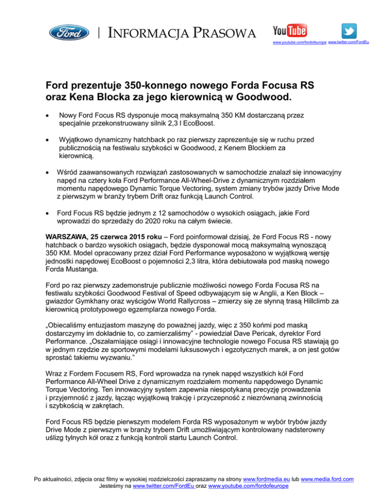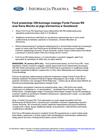 INFORMACJA PRASOWA www.youtube.com/fordofeurope www.twitter.com/FordEu Ford prezentuje 350-konnego nowego Forda Focusa RS oraz Kena Blocka za jego kierownicą w Goodwood. • Nowy Ford Focus RS dysponuje mocą maksymalną 350 KM dostarczaną przez specjalnie przekonstruowany silnik 2,3 l EcoBoost. • Wyjątkowo dynamiczny hatchback po raz pierwszy zaprezentuje się w ruchu przed publicznością na festiwalu szybkości w Goodwood, z Kenem Blockiem za kierownicą. • Wśród zaawansowanych rozwiązań zastosowanych w samochodzie znalazł się innowacyjny napęd na cztery koła Ford Performance All-Wheel-Drive z dynamicznym rozdziałem momentu napędowego Dynamic Torque Vectoring, system zmiany trybów jazdy Drive Mode z pierwszym w branży trybem Drift oraz funkcją Launch Control. • Ford Focus RS będzie jednym z 12 samochodów o wysokich osiągach, jakie Ford wprowadzi do sprzedaży do 2020 roku na całym świecie. WARSZAWA, 25 czerwca 2015 roku – Ford poinformował dzisiaj, że Ford Focus RS - nowy hatchback o bardzo wysokich osiągach, będzie dysponował mocą maksymalną wynoszącą 350 KM. Model opracowany przez dział Ford Performance wyposażono w wyjątkową wersję jednostki napędowej EcoBoost o pojemności 2,3 litra, która debiutowała pod maską nowego Forda Mustanga. Ford po raz pierwszy zademonstruje publicznie możliwości nowego Forda Focusa RS na festiwalu szybkości Goodwood Festival of Speed odbywającym się w Anglii, a Ken Block – gwiazdor Gymkhany oraz wyścigów World Rallycross – zmierzy się ze słynną trasą Hillclimb za kierownicą prototypowego egzemplarza nowego Forda. „Obiecaliśmy entuzjastom maszynę do poważnej jazdy, więc z 350 końmi pod maską dostarczymy im dokładnie to, co zamierzaliśmy” - powiedział Dave Pericak, dyrektor Ford Performance. „Oszałamiające osiągi i innowacyjne technologie nowego Focusa RS stawiają go w jednym rzędzie ze sportowymi modelami luksusowych i egzotycznych marek, a on jest gotów sprostać takiemu wyzwaniu.” Wraz z Fordem Focusem RS, Ford wprowadza na rynek napęd wszystkich kół Ford Performance All-Wheel Drive z dynamicznym rozdziałem momentu napędowego Dynamic Torque Vectoring. Ten innowacyjny system zapewnia niespotykaną precyzję prowadzenia i przyjemność z jazdy, łącząc wyjątkową trakcję i przyczepność z niezrównaną zwinnością i szybkością w zakrętach. Ford Focus RS będzie pierwszym modelem Forda RS wyposażonym w wybór trybów jazdy Drive Mode z pierwszym w branży trybem Drift umożliwiającym kontrolowany nadsterowny uślizg tylnych kół oraz z funkcją kontroli startu Launch Control. Po aktualności, zdjęcia oraz filmy w wysokiej rozdzielczości zapraszamy na strony www.fordmedia.eu lub www.media.ford.com Jesteśmy na www.twitter.com/FordEu oraz www.youtube.com/fordofeurope Jednostka napędowa EcoBoost o wyjątkowych osiągach opracowana specjalnie dla modelu RS Nowy silnik EcoBoost o pojemności skokowej 2,3 litra napędzający Forda Focusa RS dzieli podstawową strukturę z całkowicie aluminiowym czterocylindrowym silnikiem najnowszego Forda Mustanga. Silnik ten znacząco wzocniono przed włożeniem go pod maskę modelu RS, zwiększając jego moc o 10%, aż do 350 KM mocy maksymalnej. Wyższa moc to zasługa zastosowania nowej turbosprężarki typu twin-scroll o niskiej bezwładności, ale z większą turbiną dostarczającą znacznie więcej powietrza. Znacznie większy intercooler dba o dostarczanie do silnika powietrza o maksymalnie dużej gęstości. Oddychanie silnika ułatwiono także poprzez zmniejszenie oporów w układzie dolotowym oraz zastosowanie wyczynowego układu wydechowego o dużych przekrojach z elektronicznie sterowaną przepustnicą w układzie wydechowym, która pozwala znajdować równowagę pomiędzy oporami przepływu i głośnością układu wydechowego. Głowica cylindrów została wykonana z wysokowytrzymałego stopu aluminium odpornego na podwyższone temperatury, natomiast w bloku silnika użyto wytrzymalszych żeliwnych tulei cylindrowych. Najwyższy priorytet przyznano także układowi chłodzenia silnika, pozwalając inżynierom na pozostawienie z przodu większej przestrzeni na umieszczenie powiększonego modułu chłodnicy – największego montowanego kiedykolwiek pod maską Forda Focusa – co zapewniło skuteczne chłodzenie wymagane w czasie ostrej jazdy na torze wyścigowym. Dzięki odpowiedniej kalibracji, jednostka napędowa odznacza się doskonałą reakcją na otwarcie przepustnicy w dolnym zakresie obrotów, wysoką elastycznością w średnim zakresie oraz dynamiczną pracą przy wysokich obrotach, osiągając maksymalnie 6 800 obr./min. Maksymalny moment obrotowy wynoszący 440 Nm występuje pomiędzy 2000 i 4500 obr/min, z podbiciem do 470 Nm na czas do 15 sekund w czasie chwilowego bardzo intensywnego przyspieszania. Tak wyjątkowe osiągi wymagają wyjątkowej ścieżki dźwiękowej. Inżynierowie z Ford Performance zadbali o to, by Ford Focus RS generował satysfakcjonujący, sportowy dźwięk podczas dynamicznej jazdy, uzupełniany charakterystycznym dla modeli RS „bulgotaniem”, „strzelaniem” i „trzaskaniem”. „Ten bardzo wyjątkowy silnik EcoBoost 2,3 litra pozwoli kierowcom poczuć prawdziwą moc turbodoładowania, zachęcając ich do kręcenia silnika aż do czerwonej kreski na obrotomierzu – cały czas przy akompaniamencie gardłowych pomruków, które gwarantują uśmiech na twarzy kierowcy” – przekonuje Dave Pericak. Nad samochodem pracował zespół inżynierów Ford Performance z Europy i USA. Nowy Ford Focus RS jest trzecim modelem oznaczonym literami RS, jego poprzednicy pojawili się na rynku w roku 2002, a następnie w 2009. Jest to też trzydziesty Ford noszący legendarne już oznaczenie RS. Nowy Ford Focus RS będzie produkowany w zakładach Saarlouis w Niemczech. Ford Focus RS jest jednym z 12 nowych Fordów o wysokich osiągach, jakie firma zaproponuje swoim klientom na ca