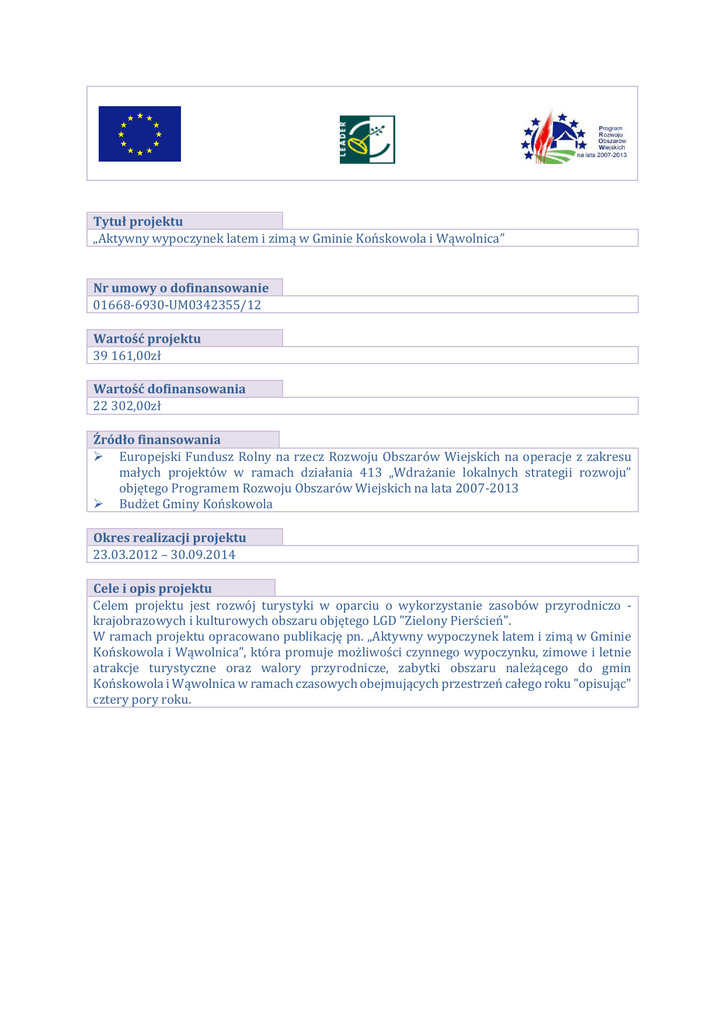 Tytuł projektu „Aktywny wypoczynek latem i zimą w Gminie Końskowola i Wąwolnica” Nr umowy o dofinansowanie 01668-6930-UM0342355/12 Wartość projektu 39 161,00zł Wartość dofinansowania 22 302,00zł Źródło finansowania Europejski Fundusz Rolny na rzecz Rozwoju Obszarów Wiejskich na operacje z zakresu małych projektów w ramach działania 413 „Wdrażanie lokalnych strategii rozwoju” objętego Programem Rozwoju Obszarów Wiejskich na lata 2007-2013 Budżet Gminy Końskowola Okres realizacji projektu 23.03.2012 – 30.09.2014 Cele i opis projektu Celem projektu jest rozwój turystyki w oparciu o wykorzystanie zasobów przyrodniczo krajobrazowych i kulturowych obszaru objętego LGD "Zielony Pierścień". W ramach projektu opracowano publikację pn. „Aktywny wypoczynek latem i zimą w Gminie Końskowola i Wąwolnica”, która promuje możliwości czynnego wypoczynku, zimowe i letnie atrakcje turystyczne oraz walory przyrodnicze, zabytki obszaru należącego do gmin Końskowola i Wąwolnica w ramach czasowych obejmujących przestrzeń całego roku "opisując" cztery pory roku.