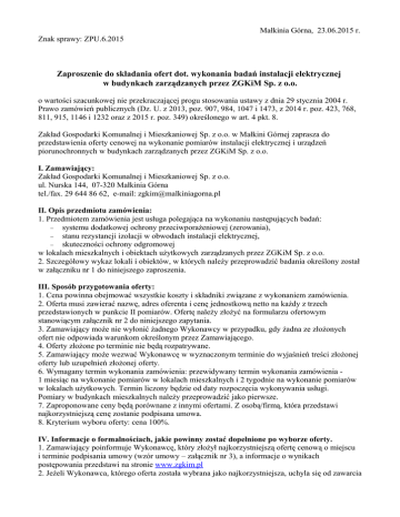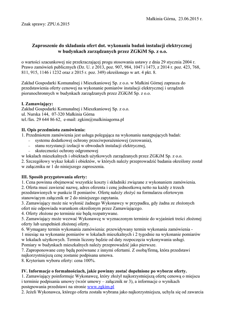 Małkinia Górna, 23.06.2015 r. Znak sprawy: ZPU.6.2015 Zaproszenie do składania ofert dot. wykonania badań instalacji elektrycznej w budynkach zarządzanych przez ZGKiM Sp. z o.o. o wartości szacunkowej nie przekraczającej progu stosowania ustawy z dnia 29 stycznia 2004 r. Prawo zamówień publicznych (Dz. U. z 2013, poz. 907, 984, 1047 i 1473, z 2014 r. poz. 423, 768, 811, 915, 1146 i 1232 oraz z 2015 r. poz. 349) określonego w art. 4 pkt. 8. Zakład Gospodarki Komunalnej i Mieszkaniowej Sp. z o.o. w Małkini Górnej zaprasza do przedstawienia oferty cenowej na wykonanie pomiarów instalacji elektrycznej i urządzeń piorunochronnych w budynkach zarządzanych przez ZGKiM Sp. z o.o. I. Zamawiający: Zakład Gospodarki Komunalnej i Mieszkaniowej Sp. z o.o. ul. Nurska 144, 07-320 Małkinia Górna tel./fax. 29 644 86 62, e-mail: [email protected] II. Opis przedmiotu zamówienia: 1. Przedmiotem zamówienia jest usługa polegająca na wykonaniu następujących badań: − systemu dodatkowej ochrony przeciwporażeniowej (zerowania), − stanu rezystancji izolacji w obwodach instalacji elektrycznej, − skuteczności ochrony odgromowej w lokalach mieszkalnych i obiektach użytkowych zarządzanych przez ZGKiM Sp. z o.o. 2. Szczegółowy wykaz lokali i obiektów, w których należy przeprowadzić badania określony został w załączniku nr 1 do niniejszego zaproszenia. III. Sposób przygotowania oferty: 1. Cena powinna obejmować wszystkie koszty i składniki związane z wykonaniem zamówienia. 2. Oferta musi zawierać nazwę, adres oferenta i cenę jednostkową netto na każdy z trzech przedstawionych w punkcie II pomiarów. Ofertę należy złożyć na formularzu ofertowym stanowiącym załącznik nr 2 do niniejszego zapytania. 3. Zamawiający może nie wyłonić żadnego Wykonawcy w przypadku, gdy żadna ze złożonych ofert nie odpowiada warunkom określonym przez Zamawiającego. 4. Oferty złożone po terminie nie będą rozpatrywane. 5. Zamawiający może wezwać Wykonawcę w wyznaczonym terminie do wyjaśnień treści złożonej oferty lub uzupełnień złożonej oferty. 6. Wymagany termin wykonania zamówienia: przewidywany termin wykonania zamówienia 1 miesiąc na wykonanie pomiarów w lokalach mieszkalnych i 2 tygodnie na wykonanie pomiarów w lokalach użytkowych. Termin liczony będzie od daty rozpoczęcia wykonywania usługi. Pomiary w budynkach mieszkalnych należy przeprowadzić jako pierwsze. 7. Zaproponowane ceny będą porównane z innymi ofertami. Z osobą/firmą, która przedstawi najkorzystniejszą cenę zostanie podpisana umowa. 8. Kryterium wyboru oferty: cena 100%. IV. Informacje o formalnościach, jakie powinny zostać dopełnione po wyborze oferty. 1. Zamawiający poinformuje Wykonawcę, który złożył najkorzystniejszą ofertę cenową o miejscu i terminie podpisania umowy (wzór umowy – załącznik nr 3), a informacje o wynikach postępowania przedstawi na stronie www.zgkim.pl 2. Jeżeli Wykonawca, którego oferta została wybrana jako najkorzystniejsza, uchyla się od zawarcia umowy w sprawie zamówienia, Zamawiający może wybrać ofertę najkorzystniejszą spośród pozostałych ofert, bez przeprowadzania ich ponownej oceny. 3. Przed podpisaniem umowy Wykonawca dostarczy kopię odpowiednich uprawnień, zaświadczeń wymaganych prawem do wykonania przedmiotowej umowy. 4. Przed rozpoczęciem realizacji zamówienia Zamawiający i Wykonawca ustalą terminy wykonania pomiarów w celu wcześniejszego powiadomienia lokatorów budynków mieszkalnych. V. Miejsce i termin składania ofert: Oferty należy składać do dnia: 02.07.2015 r. do godz. 15:00 w siedzibie zamawiającego – w sekretariacie. Oferty można również przesyłać do Zamawiającego na następujący nr faksu 29 644 86 62 lub pocztą elektroniczną na adres: [email protected] w terminie podanym wyżej. Zamawiający zastrzega sobie prawo do unieważnienia niniejszego postępowania, a także do pozostawienia postępowania bez wyboru oferty bez podania uzasadnienia. Załącznikami do niniejszego zapytania są: • załącznik nr 1 – wykaz lokali • załącznik nr 2 – formularz ofertowy • załącznik nr 3 – wzór umowy Załącznik nr 1 WYKAZ LOKALI MIESZKALNYCH I OBIEKTÓW UŻYTKOWYCH, W KTÓRYCH NALEŻY PRZEPROWADZIĆ BADANIA INSTALACJI ELEKTRYCZNEJ I ODGROMOWEJ L.p. Adres Ilość lokali 1 Małkinia Górna ul. Biegańskiego 3 9 w tym: 1 segment (Towarzystwo Przyjaciół Dzieci) + 6 lokali w narożnym segmencie + 4 segment (Klub Pracy, Klub Emerytów i Rencistów) + 6 segment (Straż Gminna, Straż Rybacka) + 5 użytkowych (Przychodnia Zdrowia MAK-MED, OPS, Biblioteka, Apteka, Ubezpieczenia) 2 Małkinia Górna ul. Biegańskiego 5 1 3 Małkinia Górna ul. Brokowska 124 5 + 1 użytkowy (Lecznica zwierząt) 4 Małkinia Górna ul. Cicha 1 3 5 Małkinia Górna ul. Cicha 4 29 6 Małkinia Górna ul. Nurska 1/2 1 7 Małkinia Górna ul. Nurska 25 2 8 Małkinia Górna ul. Nurska 35 17 (bez urządzenia piorunochronnego) 9 Orło 19/1 1 10 Prostyń 33 5 11 Prostyń 33 1 użytkowy - magazyn przeciwpowodziowy 12 Prostyń 86 2 + 1 użytkowy (parter-Ośrodek Zdrowia) 13 Prostyń 161 1 użytkowy (dawny budynek poczty) 14 Rostki Wielkie 68 6 15 Szkoła Podst. Małkinia Górna 5 lokali mieszklnych przy Szkole Podstawowej ul. Ostrowska 58 16 Szkoła Orło 17 2 lokale mieszkalne w budynku Szkoły 17 Małkinia Górna ul. Nurska 144 1 użytkowy - budynek biurowy 18 Małkinia Górna ul. Nurska 144 1 użytkowy - budynek warsztatowo-magazynowy 19 Małkinia Górna ul. Nurska 144 1 użytkowy - budynek gospodarczy 20 Małkinia Górna ul. Przedszkolna 1 użytkowy - SUW Małkinia 21 Małkinia Górna ul. Przedszkolna 1 użytkowy - budynek agregatów z garażami 22 Małkinia Górna Rostki Wielkie 1 użytkowy - SUW Rostki Wielkie 23 Kańkowo 1 użytkowy - SUW Kańkowo 24 Małkinia Górna ul. Nurska 144 1 użytkowy - budynek biobloków 25 Małkinia Górna ul. Nurska 144 1 użytkowy -budynek myjni 26 Małkinia Górna ul. Nurska