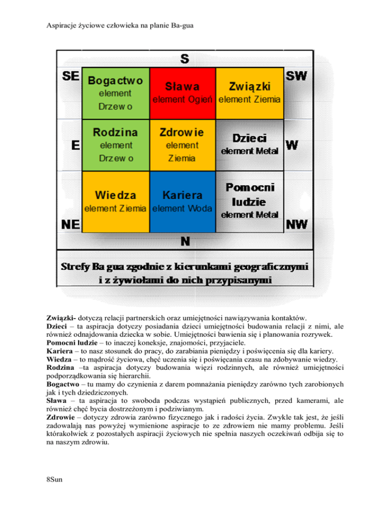 Aspiracje życiowe człowieka na planie Ba-gua Związki- dotyczą relacji partnerskich oraz umiejętności nawiązywania kontaktów. Dzieci – ta aspiracja dotyczy posiadania dzieci umiejętności budowania relacji z nimi, ale również odnajdowania dziecka w sobie. Umiejętności bawienia się i planowania rozrywek. Pomocni ludzie – to inaczej koneksje, znajomości, przyjaciele. Kariera – to nasz stosunek do pracy, do zarabiania pieniędzy i poświęcenia się dla kariery. Wiedza – to mądrość życiowa, chęć uczenia się i poświęcania czasu na zdobywanie wiedzy. Rodzina –ta aspiracja dotyczy budowania więzi rodzinnych, ale również umiejętności podporządkowania się hierarchii. Bogactwo – tu mamy do czynienia z darem pomnażania pieniędzy zarówno tych zarobionych jak i tych dziedziczonych. Sława – ta aspiracja to swoboda podczas wystąpień publicznych, przed kamerami, ale również chęć bycia dostrzeżonym i podziwianym. Zdrowie – dotyczy zdrowia zarówno fizycznego jak i radości życia. Zwykle tak jest, że jeśli zadowalają nas powyżej wymienione aspiracje to ze zdrowiem nie mamy problemu. Jeśli którakolwiek z pozostałych aspiracji życiowych nie spełnia naszych oczekiwań odbija się to na naszym zdrowiu. 8Sun