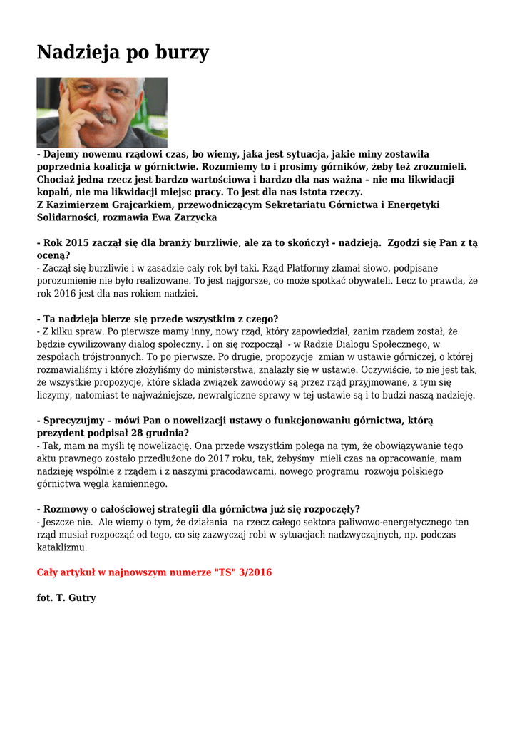 Nadzieja po burzy - Dajemy nowemu rządowi czas, bo wiemy, jaka jest sytuacja, jakie miny zostawiła poprzednia koalicja w górnictwie. Rozumiemy to i prosimy górników, żeby też zrozumieli. Chociaż jedna rzecz jest bardzo wartościowa i bardzo dla nas ważna – nie ma likwidacji kopalń, nie ma likwidacji miejsc pracy. To jest dla nas istota rzeczy. Z Kazimierzem Grajcarkiem, przewodniczącym Sekretariatu Górnictwa i Energetyki Solidarności, rozmawia Ewa Zarzycka - Rok 2015 zaczął się dla branży burzliwie, ale za to skończył - nadzieją. Zgodzi się Pan z tą oceną? - Zaczął się burzliwie i w zasadzie cały rok był taki. Rząd Platformy złamał słowo, podpisane porozumienie nie było realizowane. To jest najgorsze, co może spotkać obywateli. Lecz to prawda, że rok 2016 jest dla nas rokiem nadziei. - Ta nadzieja bierze się przede wszystkim z czego? - Z kilku spraw. Po pierwsze mamy inny, nowy rząd, który zapowiedział, zanim rządem został, że będzie cywilizowany dialog społeczny. I on się rozpoczął - w Radzie Dialogu Społecznego, w zespołach trójstronnych. To po pierwsze. Po drugie, propozycje zmian w ustawie górniczej, o której rozmawialiśmy i które złożyliśmy do ministerstwa, znalazły się w ustawie. Oczywiście, to nie jest tak, że wszystkie propozycje, które składa związek zawodowy są przez rząd przyjmowane, z tym się liczymy, natomiast te najważniejsze, newralgiczne sprawy w tej ustawie są i to budzi naszą nadzieję. - Sprecyzujmy – mówi Pan o nowelizacji ustawy o funkcjonowaniu górnictwa, którą prezydent podpisał 28 grudnia? - Tak, mam na myśli tę nowelizację. Ona przede wszystkim polega na tym, że obowiązywanie tego aktu prawnego zostało przedłużone do 2017 roku, tak, żebyśmy mieli czas na opracowanie, mam nadzieję wspólnie z rządem i z naszymi pracodawcami, nowego programu rozwoju polskiego górnictwa węgla kamiennego. - Rozmowy o całościowej strategii dla górnictwa już się rozpoczęły? - Jeszcze nie. Ale wiemy o tym, że działania na rzecz całego sektora paliwowo-energetycznego ten rząd musiał rozpocząć od tego, co się zazwyczaj robi w sytuacjach nadzwyczajnych, np. podczas kataklizmu. Cały artykuł w najnowszym numerze "TS" 3/2016 fot. T. Gutry