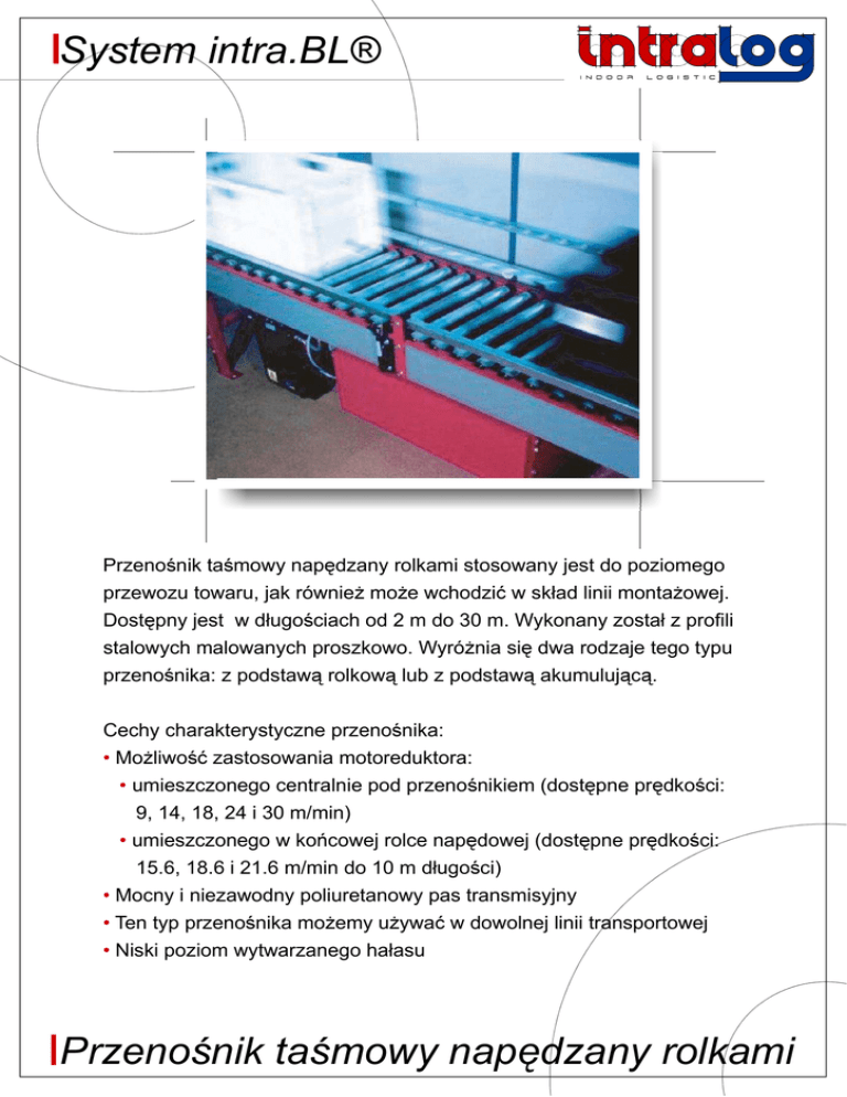 System intra.BL® Przenośnik taśmowy napędzany rolkami stosowany jest do poziomego przewozu towaru, jak również może wchodzić w skład linii montażowej. Dostępny jest w długościach od 2 m do 30 m. Wykonany został z profili stalowych malowanych proszkowo. Wyróżnia się dwa rodzaje tego typu przenośnika: z podstawą rolkową lub z podstawą akumulującą. Cechy charakterystyczne przenośnika: • Możliwość zastosowania motoreduktora: • umieszczonego centralnie pod przenośnikiem (dostępne prędkości: 9, 14, 18, 24 i 30 m/min) • umieszczonego w końcowej rolce napędowej (dostępne prędkości: 15.6, 18.6 i 21.6 m/min do 10 m długości) • Mocny i niezawodny poliuretanowy pas transmisyjny • Ten typ przenośnika możemy używać w dowolnej linii transportowej • Niski poziom wytwarzanego hałasu Przenośnik taśmowy napędzany rolkami System intra.BL® Podstawa rolkowa 250 mm 250 mm Kierunek 260 mm 140 35 Ten typ przenośnika składa się z podstawy rolkowej napędzanej przez pas działający na spód rolek. Należy pamiętać o tym, że kierunek przesuwania się pasa jest zawsze przeciwny do kierunku transportu ładunku. • Dostępne szerokości: 300, 400, 450, 500, 600, 800 mm • Długości od 2 m do 30 m • Prędkość przenośnika od 9, 14, 18, 24 i 30 m/min (za pomocą motoreduktora umieszczonego centralnie pod przenośnikiem) • Prędkość przenośnika od 15.6, 18.6 21.6 m/min (za pomocą motoreduktora umieszczonego na końcu przenośnika) Podstawa akumulująca 250 mm 250 mm Kierunek 260 mm 140 35 Różnica pomiędzy podstawą akumulującą a podstawą z napędem rolkowym polega na tym, że zastosowano inny typ pasa i dodatkowo dolne rolki regulujące umożliwiają odłączenie napędu pasa. To rozwiązanie umożliwia gromadzenie, akumulowanie paczek na przenośniku. • Dostępne szerokości 300, 400, 450, 500, 600, 800 mm • Długości od 2 m do 30 m • Prędkość przenośnika od 9, 14, 18, 24 i 30 m/min (za pomocą motoreduktora umieszczonego centralnie pod przenośnikiem) • Prędkość przenośnika od 15.6, 18.6 i 21.6 m/min (za pomocą motoreduktora umieszczonego na końcu przenośnika) • Szerokość przenośnika 250, 350, 400, 450, 550, 750 mm Przenośnik taśmowy napędzany rolkami Intralog Sp. z o.o. tel. 091 311 39 50 fax: 091 442 25 63 e-mail: [email protected] www.intralog.pl