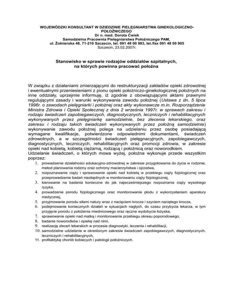 WOJEWÓDZKI KONSULTANT W DZIEDZINIE PIELĘGNIARSTWA GINEKOLOGICZNOPOŁOŻNICZEGO Dr n. med. Dorota Ćwiek Samodzielna Pracownia Pielęgniarstwa Położniczego PAM, ul. Żołnierska 48, 71-210 Szczecin, tel. 091 48 00 983, tel./fax 091 48 00 905 Szczecin, 23.02.2007r. Stanowisko w sprawie rodzajów oddziałów szpitalnych, na których powinna pracować położna W związku z działaniami zmierzającymi do restrukturyzacji zakładów opieki zdrowotnej i ewentualnymi przeniesieniami z pionu opieki położniczo-ginekologicznej położnych na inne oddziały, uprzejmie informuję, iż zgodnie z obowiązującymi aktami prawnymi regulującymi zasady i warunki wykonywania zawodu położnej (Ustawa z dn. 5 lipca 1996r. o zawodach pielęgniarki i położnej oraz akty wykonawcze m.in. Rozporządzenie Ministra Zdrowia i Opieki Społecznej z dnia 2 września 1997r. w sprawach zakresu i rodzaju świadczeń zapobiegawczych, diagnostycznych, leczniczych i rehabilitacyjnych wykonywanych przez pielęgniarkę samodzielnie, bez zlecenia lekarskiego, oraz zakresu i rodzaju takich świadczeń wykonywanych przez położną samodzielnie) wykonywanie zawodu położnej polega na udzielaniu przez osobę posiadającą wymagane kwalifikacje, potwierdzone odpowiednimi dokumentami, świadczeń zdrowotnych, a w szczególności świadczeń pielęgnacyjnych, zapobiegawczych, diagnostycznych, leczniczych, rehabilitacyjnych oraz promocji zdrowia, w zakresie opieki nad kobietą, kobietą ciężarną, rodzącą i położnicą oraz noworodkiem. Udzielanie świadczeń, o których mowa wyżej, położna wykonuje przede wszystkim poprzez: 1. prowadzenie działalności edukacyjno-zdrowotnej w zakresie przygotowania do życia w rodzinie, metod planowania rodziny oraz ochrony macierzyństwa i ojcostwa, 2. rozpoznawanie ciąży i sprawowanie opieki nad kobietą w przebiegu ciąży fizjologicznej oraz przeprowadzenie badań niezbędnych w monitorowaniu ciąży fizjologicznej, 3. kierowanie na badania konieczne do jak najwcześniejszego rozpoznania ciąży wysokiego ryzyka, 4. prowadzenie porodu fizjologicznego oraz monitorowanie płodu z wykorzystaniem aparatury medycznej, 5. przyjmowanie porodu siłami natury wraz z nacięciem krocza i szyciem naciętego krocza, 6. podejmowanie koniecznych działań w sytuacjach nagłych, do czasu przybycia lekarza, w tym przyjęcie porodu z położenia miednicowego oraz ręczne wydobycie łożyska, 7. sprawowanie opieki nad matką i monitorowanie przebiegu okresu poporodowego, 8. badanie noworodków i opiekę nad nimi, 9. realizację zleceń lekarskich w procesie diagnostyki, leczenia i rehabilitacji, 10. samodzielne udzielanie w określonym zakresie świadczeń zapobiegawczych, diagnostycznych, leczniczych i rehabilitacyjnych, 11. profilaktykę chorób kobiecych i patologii położniczych. Każde z wyżej opisanych rodzajów świadczeń zdrowotnych udzielanych przez położną zdeterminowane jest przez zasadę główną wynikającą z art. 5 ust. 1 ustawy, tj. udzielanie świadczeń zdrowotnych na rzecz kobiet, kobiet ciężarnych, rodzących, położnic i noworodków/niemowląt do 42. dnia życia. Niepokój budzą działania podejmowane przez kadrę zarządzającą zmierzające w ramach restrukturyzacji do przesuwania położnych na stanowiska pielęgniarskie wymagające określonych specjalistycznych kwalifikacji, których położna nie posiada. Taka rotacja niezgodna z posiadanymi kwalifikacjami i kompetencjami nie zapewnia bezpieczeństwa podopiecznym. Powołując się na stanowisko Konsultanta Krajowego w dziedzinie pielęgniarstwa ginekologiczno-położniczego w sprawie rodzajów oddziałów szpitalnych, na których powinna pracować położna z dn. 13.08.2003r., Konsultant Krajowy stwierdził, że „nie ma przeszkód prawnych, aby położna wykonywała swój zawód w innych rodzajach oddziałów szpitalnych w takim zakresie, o jakim mowa w powyżej cytowanym przepisie art. 5 ust. 1-3 o zawodzie pielęgniarki i położnej oraz § 4-6 rozporządzenia Ministra Zdrowia i Opieki Społecznej z dnia 2 września 1997r. w sprawie zakresu i rodzaju świadczeń zapobiegawczych, diagnostycznych, leczniczych i rehabilitacyjnych jeśli przełożenia uznają, że jej kwalifikacje są wystarczające”. Dlatego celowym wydaje się dokładne przeanalizowanie struktury zatrudnienia położnych przez kadrę zarządzającą w pielęgniarstwie i zapewnienie obsady stanowisk zgodnie z posiadanymi kwalifikacjami. Konsultant wojewódzki w dziedzinie pielęgniarstwa ginekologiczno-położniczego dr n. med. Dorota Ćwiek