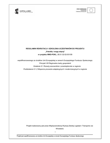 REGULAMIN REKRUTACJI i SZKOLENIA UCZESTNIKÓW DO PROJEKTU „Potrafię i mogę więcej” nr projektu WND-POKL..08.01.02-02-001/09 współfinansowanego ze środków Unii Europejskiej w ramach Europejskiego Funduszu Społecznego. Priorytet VIII Regionalne kadry gospodarki Działanie 8.1 Rozwój pracowników i przedsiębiorstw w regionie Poddziałanie 8.1.2 Wsparcie procesów adaptacyjnych i modernizacyjnych w regionie Projekt realizowany jest przez Międzynarodową Wyższą Szkołę Logistyki i Transportu we Wrocławiu 1 Projekt jest współfinansowany ze środków Unii Europejskiej w ramach Europejskiego Funduszu Społecznego Definicje Ilekroć mowa w regulaminie o: Projektodawcy – należy przez to rozumieć Międzynarodową Wyższą Szkołę Logistyki i Transportu we Wrocławiu ul. Sołtysowicka 19 B, 51-168 Wrocław. Projekcie – należy przez to rozumieć projekt „ Potrafię i mogę więcej” o numerze WNDPOKL..08.01.02-02-001/09 realizowany przez Międzynarodową Wyższą Szkołę Logistyki i Transportu we Wrocławiu w partnerstwie z Agencją Rozwoju Aglomeracji Wrocławskiej S.A w ramach umowy UDA –POKL 08.01.02-02-001/09-00 współfinansowany z Europejskiego Funduszu Społecznego, Program Operacyjny Kapitał Ludzki, Priorytet VIII Regionalne kadry gospodarki Działanie 8.1 Rozwój pracowników i przedsiębiorstw w regionie, Poddziałanie 8.1.2 Wsparcie procesów adaptacyjnych i modernizacyjnych w regionie Uczestniku projektu – należy przez to rozumieć osobę spełniająca kryteria formalne, która w wyznaczonym terminie złoży wszystkie wymagane dokumenty rekrutacyjne oraz pozytywnie przejdzie weryfikację. Karcie zgłoszenia – należy przez to rozumieć dokument rekrutacyjny, którego wzór udostępnia biuro projektu w swojej siedzibie oraz na stronie internetowej projektu. Deklaracji uczestnictwa – należy przez to rozumieć dokument, którego wzór udostępnia biuro projektu w swojej siedzibie oraz na stronie internetowej projektu, składany przez uczestnika projektu po jego zakwalifikowaniu do udziału w jednej z form wsparcia ( szkolenie/doradztwo). Stronie internetowej projektu- należy przez to rozumieć stronę o adresie http://www.mogewiecej.msl.com.pl. I. Informacje o projekcie Projekt „ Potrafię i mogę więcej” realizowany jest przez Międzynarodową Wyższą Szkołę Logistyki i Transportu we Wrocławiu w partnerstwie z Agencją Rozwoju Aglomeracji Wrocławskiej S.A w ramach Programu Operacyjnego Kapitał Ludzki. Priorytet VIII Regionalne kadry gospodarki, Działanie 8.1 Rozwój pracowników i przedsiębiorstw w regionie, Poddziałanie 8.1.2 Wsparcie procesów adaptacyjnych i modernizacyjnych w regionie 1. Projekt jest współfinansowany ze środków Europejskiego Funduszu Społecznego. Celem projektu jest zmiana kwalifikacji zawodowych, poprzez szkolenia zawodowe, osób zatrudnionych w przedsiębiorstwach przechodzących procesy adaptacyjne i modernizacyjne, będących w okresie wypowiedzenia stosunku pracy z przyczyn niedotyczących pracowników 2 Projekt jest współfinansowany ze środków Unii Europejskiej w ramach Europejskiego Funduszu Społecznego oraz zatrudnionych u pracodawcy znajdującego się w stanie upadłości lub likwidacji. Celem projektu jest również dostosowywanie tych osób do funkcjonowania w zmieniających się warunkach społeczno-ekonomicznych oraz przygotowywanie ich do wykorzystania szans związanych z powstawaniem nowych miejsc pracy poprzez zmianę kwalifikacji i wsparcie doradcze w zakresie wyboru nowego zawodu i określenie ścieżek kariery. Projekt realizowany jest od 1.10.2009 do 31.01.2011. 2. W ramach projektu zostaną przeprowadzone 4 szkolenia zawodowe dla 40 osób z zakresu; · Magazynier · Spawacz w technologii TIG · Operator wózka widłowego · Spedytor z obsługą programu użytkowego Celina. oraz indywidualne wsparcie doradcze dla 50 osób (w tym 25 kobiet) z zakresu wyboru nowej ścieżki zawodowej poprzez przygotowanie Indywidualnych Planów Działań ( IPD) w okresie od 1.08 do 31.12.2010. 3. Ogólny nadzór nad realizacją Projektu, a także rozstrzyganie spraw, które nie są uregulowane niniejszym regulaminem, należą do Koordynatora Projektu 4. Niniejszy regulamin określa: - kryteria uczestnictwa w projekcie, - zasady rekrutacji, - zasady przyjmowania zgłoszeń, - zasady ukończenia szkolenia i rezygnacji z udziału w projekcie, II. Kryteria uczestnictwa w projekcie 1. W Projekcie uczestniczyć mogą osoby, spełniające łącznie w dniu złożenia deklaracji uczestnictwa w projekcie następujące warunki: - są w wieku powyżej 18 roku życia, - są pracownikami małego, średniego lub dużego przedsiębiorstwa na terenie Dolnego Śląska, zatrudnione na podstawie umowy o pracę, - przedsiębiorstwo przechodzi procesy adaptacyjne i modernizacyjne - spełniają dodatkowo przynajmniej jedno z poniższych kryteriów znajdują się w okresie wypowiedzenia umowy o pracę zostały wskazane przez Pracodawcę, jako osoby objęte zwolnieniami na etapie rekrutacji do projektu zadeklarują chęć zmiany miejsca pracy bądź zawodu. III. 1. Rekrutacja do projektu Rekrutacja do projektu trwa od 01.04.2010 do 31.06.2010. 3 Projekt jest współfinansowany ze środków Unii Europejskiej w ramach Europejskiego Funduszu Społecznego 2. Procedura rekrutacji obejmuje następujące etapy: a) złożenie kompletu dokumentów określonych w niniejszym regulaminie w Biurze Projektu we Wrocławiu z siedzibą przy ul Sołtysowickiej 19 B 51-168 Wrocław · Dokumenty można składać osobiście lub za pośrednictwem poczty ( list polecony)/ kurier – decyduje data wpływu do biura projektu. · Wzory dokumentów udostępnia Projektodawca w Biurze Projektu oraz na stronach internetowych projektu. b) weryfikacja poprawności oraz kompletności złożonych dokumentów, c) decyzja o zakwalifikowaniu, d) podpisanie deklaracji uczestnictwa w projekcie. 3. Osoby zainteresowane uczestnictwem w projekcie powinny złożyć nas