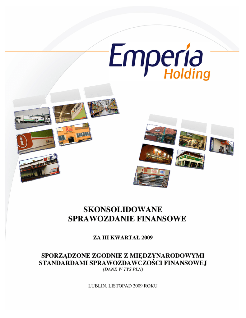 SKONSOLIDOWANE SPRAWOZDANIE FINANSOWE ZA III KWARTAŁ 2009 SPORZĄDZONE ZGODNIE Z MIĘDZYNARODOWYMI STANDARDAMI SPRAWOZDAWCZOŚCI FINANSOWEJ (DANE W TYS PLN) LUBLIN, LISTOPAD 2009 ROKU Skonsolidowane sprawozdanie finansowe na dzień 30.09.2009 (kwoty wyrażone są w tys. PLN, o ile nie podano inaczej) Spis treści 1. 2. 3. Wybrane dane finansowe .....................................................................................................3 Skrócone skonsolidowane sprawozdanie z sytuacji finansowej .......................................4 Skrócony skonsolidowany rachunek zysków i strat oraz skrócone skonsolidowane sprawozdanie z dochodów całkowitych ..............................................................................5 Skrócone sprawozdanie ze zmian w skonsolidowanym kapitale własnym......................7 Skrócony skonsolidowane sprawozdanie z przepływów pieniężnych ..............................9 Informacja dodatkowa .......................................................................................................11 4. 5. 6. 6.1 6.2 7. Opis organizacji grupy kapitałowej. ......................................................................................................... 11 Opis ważniejszych zastosowanych zasad rachunkowości......................................................................... 16 Noty dodatkowe...................................................................................................................33 7.1 7.2 7.3 7.4 7.5 7.6 7.7 7.8 7.9 7.10 7.11 7.12 7.13 7.14 8. Jednostkowe skrócone sprawozdanie finansowe Emitenta.............................................53 8.1 8.2 8.3 8.4 8.5 9. Zwięzły opis istotnych dokonań lub niepowodzeń Grupy Kapitałowej Emperia. .................................... 33 Przychody i wyniki przypadające na poszczególne segmenty działalności .............................................. 34 Wskazanie skutków zmian w strukturze jednostki gospodarczej.............................................................. 36 Stanowisko Zarządu odnośnie realizacji wcześniej publikowanych prognoz wyników na dany rok. ...... 36 Akcjonariusze posiadający co najmniej 5% ogólnej liczby głosów na Walnym Zgromadzeniu na dzień przekazania raportu. ................................................................................................................................. 36 Zmiany w stanie posiadania akcji będących w posiadaniu członków Zarządu oraz Rady Nadzorczej..... 37 Informacje o toczących się postępowaniach. ............................................................................................ 37 Znaczące transakcje emitenta z podmiotami powiązanymi. ..................................................................... 37 Kredyty, pożyczki oraz poręczenia i gwarancje........................................................................................ 37 Inne informacje istotne dla oceny sytuacji kadrowej, majątkowej, finansowej, wyniku finansowego i ich zmian oraz informacje, które są istotne dla oceny możliwości realizacji zobowiązań przez emitenta..... 37 Opis czynników i zdarzeń w szczególności o nietypowym charakterze, mające wpływ na wynik osiągnięty w roku obrotowym. ................................................................................................................. 38 Opis czynników, które będą miały wpływ na osiągnięte wyniki w perspektywie co najmniej kolejnego kwartału.................................................................................................................................................... 38 Zmiany w składzie osób zarządzających i nadzorujących emitenta.......................................................... 39 Pozostałe istotne informacje i zdarzenia. .................................................................................................. 39 Wybrane jednostkowe dane finansowe ..................................................................................................... 53 Skrócone jednostkowe sprawozdanie z sytuacji finansowej. .................................................................... 54 Skrócony jednostkowy rachunek zysków i strat oraz skrócone jednostkowe sprawozdanie z dochodów całkowitych. ............................................................................................................................................. 55 Skrócone sprawozdanie ze zmian w jednostkowy kapitale własnym ....................................................... 56 Skrócone jednostkowe sprawozdanie z przepływów pieniężnych ............................................................ 58 Zmiana prezentacji bonusów i wpływ na rachunek zysków i strat................................59 Strona 2 z 60 Skonsolidowane sprawozdanie finansowe na dzień 30.09.2009 (kwoty wyrażone są w tys. PLN, o ile nie podano inaczej) 1. Wybrane dane finansowe PLN Lp. I. II. III. IV. V. VI. VII. VIII. IX. X. XI. XII. XIII. XIV. XV. XVI. WYBRANE DANE FINANSOWE (rok bieżący) Przychody netto ze sprzedaży produktów, towarów i materiałów Zysk (strata) z działalności operacyjnej Zysk (strata) przed opodatkowaniem Zysk (strata) okresu Przepływy pieniężne netto z działalności operacyjnej Przepływy pieniężne netto z działalności inwestycyjnej Przepływy pieniężne netto z działalności finansowej Przepływy pieniężne netto, razem Aktywa razem Zobowiązania i rezerwy na zobowiązania Zobowiązania długoterminowe Zobowiązania krótkoterminowe Kapitał własny Kapitał zakładowy Liczba akcji Średnioważona liczba akcji Za okres od 01.01.2009 do 30.09.2009 EURO Za okres od 01.01.2008 do 30.09.2008* Za okres od 01.01.2009 do 30.09.2009 Za okres od 01.01.2008 do 30.09.2008* 4 099 853 3 900 401 931 933 1 138 903 86 417 69 546 52 205 72 975 62 086 41 084 19 643 15 808 11 867 21 308 18 129 11 996 68 103 30 260 15 480 8 836 (92 912) (123 166) (21 120) (35 964) 15 386 43