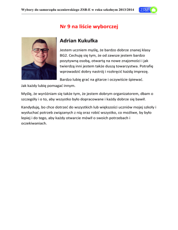 Wybory do samorządu uczniowskiego ZSB-E w roku szkolnym 2013/2014 Nr 9 na liście wyborczej Adrian Kukułka Jestem uczniem myślę, że bardzo dobrze znanej klasy BG2. Cechuję się tym, że od zawsze jestem bardzo pozytywną osobą, otwartą na nowe znajomości i jak twierdzą inni jestem także duszą towarzystwa. Potrafię wprowadzić dobry nastrój i rozkręcić każdą imprezę. Bardzo lubię grać na gitarze i oczywiście śpiewać. Jak każdy lubię pomagać innym. Myślę, że wyróżniam się także tym, że jestem dobrym organizatorem, dbam o szczegóły i o to, aby wszystko było dopracowane i każdy dobrze się bawił. Kandyduję, bo chce dotrzeć do wszystkich lub większości uczniów mojej szkoły i wysłuchać potrzeb związanych z nią oraz robić wszystko, co możliwe, by było lepiej i do tego, aby każdy otwarcie mówił o swoich potrzebach i oczekiwaniach.