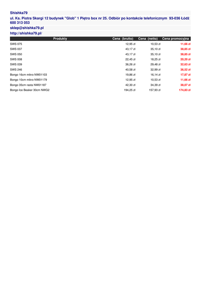 Shishka79 ul. Ks. Piotra Skargi 12 budynek "Glob" 1 Piętro box nr 25. Odbiór po kontakcie telefonicznym 93-036 Łódź 600 313 053 [email protected] http://shishka79.pl/ Produkty Cena (brutto) Cena (netto) Cena promocyjna SWS 075 12,95 zł 10,53 zł 11,66 zł SWS 037 43,17 zł 35,10 zł 38,85 zł SWS 050 43,17 zł 35,10 zł 38,85 zł SWS 008 22,45 zł 18,25 zł 20,20 zł SWS 039 36,26 zł 29,48 zł 32,63 zł SWS 246 40,58 zł 32,99 zł 36,52 zł Bongo 16cm mikro NW01103 19,86 zł 16,14 zł 17,87 zł Bongo 10cm mikro NW01179 12,95 zł 10,53 zł 11,66 zł Bongo 35cm rasta NW01187 Bongo Ice Beaker 30cm NWG2 42,30 zł 34,39 zł 38,07 zł 194,25 zł 157,93 zł 174,83 zł