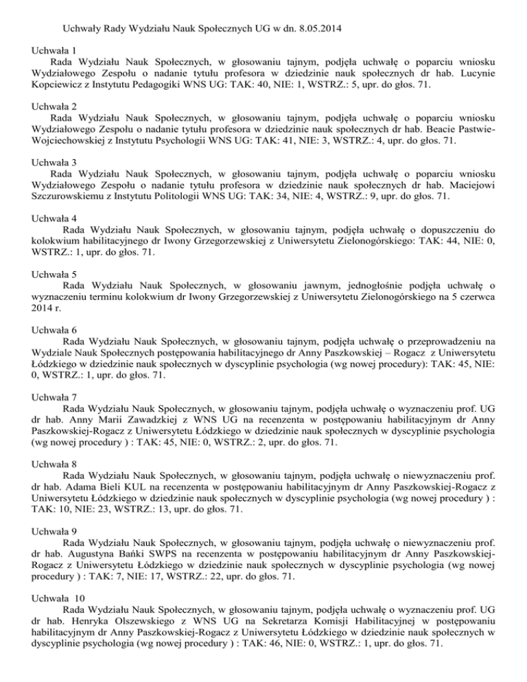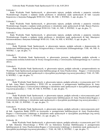 Uchwały Rady Wydziału Nauk Społecznych UG w dn. 8.05.2014