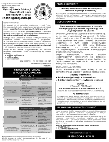 PROFIL PRAKTYCZNY Kolegium Pracowników Służb Społecznych w Biłgoraju Oficjalny Partner Kształcimy umiejętności istotne dla rynku pracy, istotne dla przyszłego pracodawcy. Wyższej Szkoły Edukacji Zdrowotnej i Nauk Społecznych w Łodzi W odróżnieniu od studiów ogólnoakademickich (oferowanych przez większość uczelni państwowych i prywatnych) przygotowujących wyłącznie do dalszego studiowania i uzyskiwania dalszych stopni naukowych. kpssbilgoraj.edu.pl STUDIA EFEKTYWNE Szanowni Państwo ! Od ponad 10 lat kształcimy studentów z całej Polski. Doświadczenia tych lat nauczyły nas jednej, najważniejszej rzeczy – uczelnia nie może być jedynie kolejną szkołą ! Student, który do nas trafia, jest osobą dorosłą. Często jest aktywny zawodowo, ma rodzinę i określony światopogląd. Nie można go traktować jak ucznia liceum. Dlatego nasza uczelnia to miejsce, w którym dzielimy się wzajemnie wiedzą, doświadczeniem i poglądami. W procesie edukacji uwzględniamy potrzeby, możliwości oraz wysokie wymagania studentów, którzy przyszli do nas aby zdobyć konkretną wiedzę, uprawnienia i umiejętności – tak niezbędne na współczesnym rynku pracy. Mając to na uwadze przygotowaliśmy dla Państwa programy studiowania, które charakteryzują się przede wszystkim: profilem praktycznym efektywnością uprawnieniami Zapraszamy – nie zawiedziecie się! Władze i wykładowcy WSEZiNS PROGRAMY STUDIÓW W ROKU AKADEMICKIM 2013 / 2014 Specjalność główna STUDIA I STOPNIA PRACA SOCJALNA PEDAGOGIKA NAUCZYCIELSKA Resocjalizacja z socjoterapią Ogólna praca socjalna Edukacja przedszkolna i wczesnoszkolna Resocjalizacja z socjoterapią Edukacja zdrowotna i profilaktyka społeczna WSPOMAGANIE ROZWOJU OSOBISTEGO I PRZEDIĘBIORCZOŚCI Przedsiębiorczość w usługach społecznych i edukacyjnych Trening rozwoju jednostki i grupy STUDIA II STOPNIA Specjalność główna PEDAGOGIKA NAUCZYCIELSKA Edukacja przedszkolna i wczesnoszkolna Edukacja do przedsiębiorczości Resocjalizacja z socjoterapią Edukacja zdrowotna i profilaktyka społeczna WSPOMAGANIE ROZWOJU OSOBISTEGO I PRZEDIĘBIORCZOŚCI Przedsiębiorczość w usługach społecznych i edukacyjnych Trening rozwoju jednostki i grupy Specjalność uzupełniająca Nie dotyczy Nauczanie drugiego przedmiotu (do wyboru) Coaching i mentoring Technologie informacyjne i nowoczesne media Coaching i mentoring Technologie informacyjne i nowoczesne media Zarządzanie relacjami z klientem Specjalność uzupełniająca Nauczanie drugiego przedmiotu (do wyboru) Coaching i mentoring Technologie informacyjne i nowoczesne media Wspomaganie rozwoju i poradnictwo pedagogiczne Coaching i mentoring Technologie informacyjne i nowoczesne media Zarządzanie relacjami z klientem Kolegium Pracowników Służb Społecznych w Biłgoraju 23-400 Biłgoraj, ul. „Wira” Bartoszewskiego 10, (84) 686 07 67, [email protected] Oferowane przez nas programy, w ramach obowiązujących przepisów, ograniczają czas „wysiadywania” na uczelni. Dyplom wydajemy za uzyskane efekty uczenia się, a nie czas „wysiedziany” na uczelni – to także efekt naszej troski o jakość kwalifikacji absolwenta i nasz szacunek dla czasu studenta. Studentów wspomoże w tym nasza funkcjonująca i rozbudowywana od 2007 roku Platforma E-learningowa oraz kadra doświadczona we wspomaganiu kształcenia nowoczesnymi środkami komunikacyjnymi. Dzięki zastosowaniu formuły studiów wspomaganych kształceniem na odległość możemy znacznie ograniczyć czas tracony na "wysiadywaniu" na wykładach i zaproponować efektywne nauczanie. STUDIA NIESTACJONARNE Studia kierowane do osób, którzy 6 dni w semestrze mogą spędzić w Łodzi na naszej Uczelni. 2 zjazdy w semestrze: 4-dniowy (zajęciowy) - w tym weekend 2-dniowy (zaliczeniowy) - wyłącznie weekend UWAGA W RAMACH PROGRAMU WSPOMAGANIE ROZWOJU OSOBISTEGO I PRZEDIĘBIORCZOŚCI MOŻLIWE JEST UKOŃCZENIE STUDIÓW II STOPNIA (MAGISTERSKICH) PO 3 SEMESTRACH Warunkiem jest wybór specjalności głównej Przedsiębiorczość w usługach społecznych i edukacyjnych, rezygnacja ze studiowania specjalności uzupełniającej, zaliczenie wymaganych przedmiotów i złożenie pracy magisterskiej w terminie przewidzianym dla tej specjalności (do końca 3 semestru). UPRAWNIENIA JAKIE MOŻESZ ZDOBYĆ Nasze programy studiów przygotowaliśmy w sposób, który pozwala na osiągnięcie pełnych uprawnień wymaganych w danych dziedzinach przez pracodawców i obowiązujące prawo. To wyraźnie różni naszą ofertę od ofert innych uczelni, które starają się nadawać uprawnienia zawodowe dopiero na studiach podyplomowych – tym samym podnoszą koszty ponoszone przez studenta w celu uzyskania uprawnień zawodowych. Porównaj naszą ofertę z innymi. Kończąc nasze studia możecie Państwo nabyć uprawnienia: NAUCZYCIELSKIE PRACOWNIKA SOCJALNEGO WIĘCEJ INFORMACJI NA KPSSBILGORAJ.EDU.PL