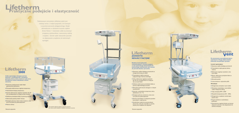 Lifetherm Praktyczne podejście i elastyczność Podstawowym priorytetem delikatnej opieki jest redukcja stresu u małych pacjentów, ich krewnych i oczywiście personelu pielęgniarskiego. Dzięki doświadczeniu w dziedzinie leczenia ciepłem firmie Heinen + Löwenstein udało się stworzyć przyjazną użytkownikowi, nowoczesną rodzinę urządzeń.. Szeroki wybór akcesoriów pozwala na dopasowanie urządzenia do konkretnych wymagań. JEDNOSTKI RESUSCYTACYJNE Rodzina trzech jednostek resuscytacyjnych z licznymi opcjami w celu optymalnego dostosowania do konkretnego zastosowania, jak również do potrzeb dziecka i personelu. Łóżko ogrzewające dostępne jest bez pokrywy, z zamkniętą lub z zamykaną pokrywą, którą można otwierać z obu stron. Urządzenie można rozbudować o liczne akcesoria. Precyzyjna elektroniczna regulacja temperatury Wyświetlanie bieżącej temperatury Szeroka elektroniczna regulacja wysokości (do 30 cm) z przełącznikami na stopy po obu stronach* Odwracalne panele przedni i boczny Płynne, elektryczne pochylanie łóżka za pomocą przycisku Cicha, elektryczna regulacja wysokości (do 30 cm) z przełącznikami na stopę po obu stronach łóżka* Obracalne panele Na wszystkich zdjęciach znajdują się opcjonalne akcesoria, które można zamówić dodatkowo. (Dodatkowe informacje na życzenie). Akcesoria opcjonalne * Wentylacja: Zintegrowany wentylator Leoni mobile Wentylacja wcześniaków, noworodków i dzieci ważących do 30 kg Kontrola i wyświetlanie temperatury skóry (dokładność ± 0,1 °C) Tryby wentylacji IPPV i CPAP * * Liczne akcesoria i opcjonalne półki Obracalne panele boczne dostępne w różnych wysokościach Standardowe stojaki do przytwierdzania akcesoriów, takie jak trzymadła na cewniki, zestawy lub urządzenia do odsysania* Materac żelowy Przewodzenie ciepła poprzez żelowy materac Przewodzenie ciepła za pomocą podgrzewanego materaca żelowego Zestawy pozwalające na dołączenie panelów kontrolnych i respiratorów Dostępne pokrywy, które można otwierać z obu stron oraz pokrywy jednoczęściowe* Skuteczny, szybko działający promiennik Elektryczna regulacja wysokości z obu stron łóżka Dostępne pokrywy otwierane z obu stron oraz pokrywy jednoczęściowe* Delikatne przechylanie łóżka za pomocą przycisku Leczenie ogrzewające: Obrotowy, szybko działający promiennik ze zintegrowaną lampą do badań Delikatne elektryczne przechylanie łóżka za pomocą odpowiedniego przycisku Skuteczne przekazywanie ciepła dzięki ogrzewaczowi płytowemu Do stosowania w początkowej opiece nad dziećmi. W jego skład wchodzi jednostka wentylacyjna i grzejna. Akcesoria opcjonalne Mieszalnik tlen/powietrze (21% - 100%) Zintegrowane urządzenie monitorujące poziom tlenu Krzywe ciśnienia na wyświetlaczu graficznym Automatyczna regulacja limitów, po których włączane są alarmy w celu dopasowania do ciśnienia wentylacji Lifetherm W skrócie: zalety linii Lifetherm s n u · P u l m o n o l o g i a Generuje ciepło kontaktowe za pomocą materaca żelowego Duży obszar promieniowania ciepła dzięki lampie ceramicznej* Ergonomia urządzenia i konstrukcja zapewniająca łatwe czyszczenie Ręczna kontrola temperatury skóry * Kółka z możliwością zablokowania Elektryczne ustawianie wysokości z kontrolą z obu stron łóżka* z a b u r z e ń Precyzyjna elektryczna regulacja łóżka do pozycji z uniesioną lub obniżoną głową Odwracalny przedni i boczny panel Szeroka oferta akcesoriów Opcjonalne akcesoria DIAGNOS Sp. z o.o. ul. Łączyny 4, 02-820 Warszawa, tel.: +48 022 331 05 03... 04, fax: +48 022 331 05 00 e-mail: [email protected], http://www.diagnos.pl Łóżka ogrzewające dla wcześniaków, noworodków i dzieci N e o n a t o l o g i a·A n e s t e z j a·We n t y l a c j a· O p i e k a Zmiany techniczne zastrzeżone MM&M, 06/2011 P – Lifetherm – E d o m ow a· D i a g n o s t y k a *