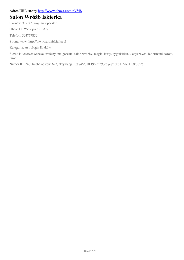 Adres URL strony http://www.ebaza.com.pl/748 Salon Wróżb Iskierka Kraków, 31-072, woj. małopolskie Ulica: Ul. Wielopole 18 A 5 Telefon: 504777850 Strona www: http://www.saloniskierka.pl Kategorie: Astrologia Kraków Słowa kluczowe: wróżka, wróżby, małgorzata, salon wróżby, magia, karty, cygańskich, klasycznych, lenormand, tarota, tarot Numer ID: 748, liczba odsłon: 627, aktywacja: 10/04/2010 19:25:29, edycja: 09/11/2011 18:06:25 Strona 1 / 1