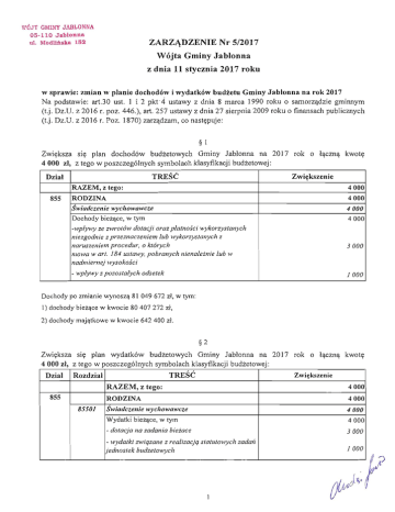 \\'ÓJT GMINY JABLONNA 05- 110 Jabłonna ul. Modl!ńska 152 ZARZĄDZENIE Nr 512017 Wójta Gminy Jabłonna z dnia 11 stycznia 2017 roku w sprawie: zmian w planie dochodów i wydatków budżetu Gminy Jablonna na rok 2017 Na podstawie: art.30 ust. I i 2 pkt '4 ustawy z dnia 8 marca 1990 roku o samorządzie gminnym (t.j. Dz.U. z 2016 r. poz. 446.), art. 257 ustawy z dnia 27 sierpnia 2009 roku o finansach publicznych (t.j. Dz.U. z 2016 r. Poz. 1870) zarządzam, co następuje: §l Zwiększa się plan dochodów budżetowych Gminy Jabłonna na 2017 rok o z tego w poszczególnych symbolach klasyfikacji budżetowej: zł, 4 000 TREŚĆ Dział 855 łączną kwotę Zwiększenie RAZEM, z tego: 4000 RODZINA 4 000 Świru/czenie wychowawcze 4000 4000 Dochody bieżące, w tym -wpływy ze zwrotów dotacji oraz platności wykorzystanych niezgodnie z przeznaczeniem lub wykorzystanych z naruszeniem procedur, o któlych mowa wart. J84 ustawy, pobranych nienależnie lub w nadmiernej wysokości 3000 - wplywy z pozostałych odsetek J 000 Dochody po zmian ie wynoszą 81 049 672 zł, w tym: I) dochody bieżące w kwocie 80407 272 zl, 2) dochody majątkowe w kwocie 642 400 zł. §2 Zwiększa 4000 zł, Dzial się plan wydatków budżetowych Gminy Jabłonna na 20 17 rok o z tego w poszczególnych symbolach klasyfikacji budżetowej : TREŚĆ Rozdział 855 85501 łączną kwotę Zwiększenie RAZEM, z tego: 4000 RODZINA 4000 Świadczenie wychowawcze 4000 bieżące, 4000 Wydatki w tym - dotacja na zadania bieżace 3000 - wydatki związane z realizacją statutowych zadań liednostek budżetowych J 000 Wydatki po zmianie wynoszą 99 793919 l) wydatki bieżące 2) wydatki majątkowe w kwocie 75 434 267 zł, w tym: zł, w kwocie 24 359 652 zł. §3 l. Zarząd zenie wchodzi w życie 2. Zarządzenie podlega opublikowaniu w Dzienniku z dniem wydania. Urzędowym Województwa Mazowieckiego. &Ó~ ~- «~ aroslc...w Ch Jorski 2 UZASADNIENIE do Zarządzenia Nr 5/2017 Wójta Gminy Jablonna z dnia II stycznia 2017 roku Zwiększa się Dział planu dochodów i wydatków budżetowych o kwotę 4 000 zl, z tego: 855 rozdział 85501 planu dochodów i wydatków bieżących w związku ze zwrotami otrzymywanymi z dotacji wykorzystanych niezgodnie z przeznaczeniem dotyczących wypłacanych przez Gminny Ośrodek Pomocy Społecznej w Jabłonnie w latach ubiegłych świadczeń wychowawczych. Środki te przekazywane są do budżetu państwa. 4 000 zł - zwiększenie budżetu państwa