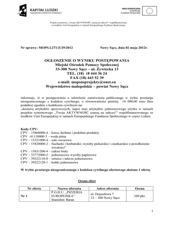 Projekt systemowy „Twoja AKTYWNOŚĆ szansą na sukces!” współfinansowany ze środków Unii Europejskiej w ramach Europejskiego Funduszu Społecznego Nowy Sącz, dnia 02 maja 2012r. Nr sprawy: MOPS.I.271/Z/29/2012 OGŁOSZENIE O WYNIKU POSTĘPOWANIA Miejski Ośrodek Pomocy Społecznej 33-300 Nowy Sącz – ul. Żywiecka 13 TEL. (18) 18 444 36 24 FAX (18) 443 52 39 e-mail: [email protected] Województwo małopolskie – powiat Nowy Sącz informuje, iż w postępowaniu o udzielenie zamówienia publicznego w trybie przetargu nieograniczonego z kodeksu cywilnego, o równowartości poniżej 14 000,00 euro (bez podatku) zgodnie z kodeksem cywilnym na: „dostawę artykułów spożywczych, napoi oraz artykułów jednorazowego użytku w ramach projektu systemowego „Twoja AKTYWNOŚĆ szansą na sukces!” współfinansowanego ze środków Unii Europejskiej w ramach Europejskiego Funduszu Społecznego w części Lidera Kody CPV: CPV – 15860000-4 – kawa, herbata i podobne produkty CPV –41110000-3 – woda pitna CPV – 15321000-4 – soki owocowe CPV – 15820000-2 – Sucharki i herbatniki; wyroby piekarskie i ciastkarskie o przedłużenie trwałości” CPV – 15831200-4 – cukier biały CPV – 33772000-2 – jednorazowe wyroby papierowe CPV – 39222110-8 – sztućce i talerze jednorazowe CPV – 39222120-1 – kubki jednorazowe W trybie przetargu nieograniczonego z kodeksu cywilnego ofertowego złożono 1 ofertę. Ocena ofert Nr oferty Nr 1 Nazwa oferenta P.G.H.U. „PIZZERIA EUROPEJSKA” Stanisław Baran Adres oferenta Ocena ul. Dojazdowa 7 33 – 300 Nowy Sącz 100 pkt. 1 Projekt systemowy „Twoja AKTYWNOŚĆ szansą na sukces!” współfinansowany ze środków Unii Europejskiej w ramach Europejskiego Funduszu Społecznego Wybrano Wykonawcę Nazwa wykonawcy: P.G.H.U. „PIZZERI EUROPEJSKA” Stanisław Baran Adres wykonawcy: ul. Dojazdowa 7, 33-300 Nowy Sącz Uzasadnienie wyboru: Wybrano Wykonawcę: P.G.H.U. „PIZZERI EUROPEJSKA” Stanisław Baran, ponieważ spełnia warunki udziału w postępowaniu, oraz jest jedyną ofertą, która wpłynęła do Zamawiającego. Wywieszono na tablicy ogłoszeń Miejskiego Ośrodka Pomocy Społecznej w Nowym Sączu, stronie internetowej Miejskiego Ośrodka Pomocy Społecznej i Urzędu Miasta Nowego Sącza: 02.05.2012 r. ZATWIERDZAM Dyrektor /-/ Józef Markiewicz 2