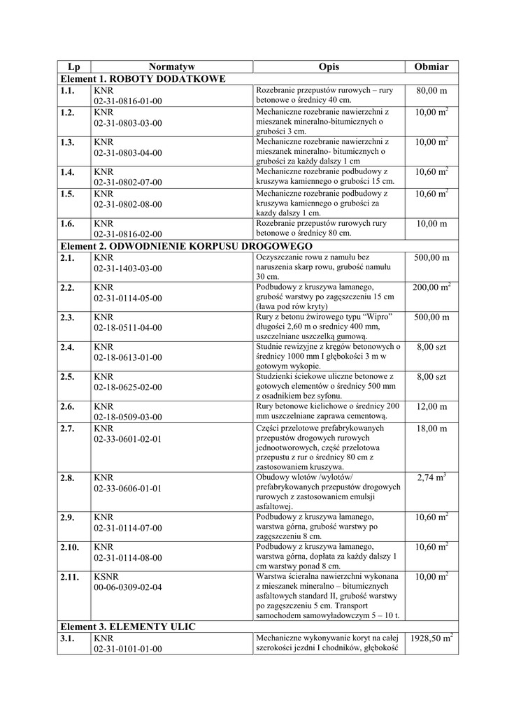Lp Normatyw Element 1. ROBOTY DODATKOWE 1.1. 1.2. KNR 02-31-0816-01-00 KNR 02-31-0803-03-00 1.3. KNR 02-31-0803-04-00 1.4. KNR 02-31-0802-07-00 KNR 02-31-0802-08-00 1.5. 1.6. KNR 02-31-0816-02-00 Opis Rozebranie przepustów rurowych – rury betonowe o średnicy 40 cm. Mechaniczne rozebranie nawierzchni z mieszanek mineralno-bitumicznych o grubości 3 cm. Mechaniczne rozebranie nawierzchni z mieszanek mineralno- bitumicznych o grubości za kaŜdy dalszy 1 cm Mechaniczne rozebranie podbudowy z kruszywa kamiennego o grubości 15 cm. Mechaniczne rozebranie podbudowy z kruszywa kamiennego o grubości za kazdy dalszy 1 cm. Rozebranie przepustów rurowych rury betonowe o średnicy 80 cm. Obmiar 80,00 m 10,00 m2 10,00 m2 10,60 m2 10,60 m2 10,00 m Element 2. ODWODNIENIE KORPUSU DROGOWEGO 2.1. KNR 02-31-1403-03-00 2.2. KNR 02-31-0114-05-00 2.3. KNR 02-18-0511-04-00 2.4. KNR 02-18-0613-01-00 2.5. KNR 02-18-0625-02-00 2.6. KNR 02-18-0509-03-00 KNR 02-33-0601-02-01 2.7. 2.8. KNR 02-33-0606-01-01 2.9. KNR 02-31-0114-07-00 2.10. KNR 02-31-0114-08-00 2.11. KSNR 00-06-0309-02-04 Oczyszczanie rowu z namułu bez naruszenia skarp rowu, grubość namułu 30 cm. Podbudowy z kruszywa łamanego, grubość warstwy po zagęszczeniu 15 cm (ława pod rów kryty) Rury z betonu Ŝwirowego typu “Wipro” długości 2,60 m o srednicy 400 mm, uszczelniane uszczelką gumową. Studnie rewizyjne z kręgów betonowych o średnicy 1000 mm I głębokości 3 m w gotowym wykopie. Studzienki ściekowe uliczne betonowe z gotowych elementów o średnicy 500 mm z osadnikiem bez syfonu. Rury betonowe kielichowe o średnicy 200 mm uszczelniane zaprawa cementową. Części przelotowe prefabrykowanych przepustów drogowych rurowych jednootworowych, część przelotowa przepustu z rur o średnicy 80 cm z zastosowaniem kruszywa. Obudowy wlotów /wylotów/ prefabrykowanych przepustów drogowych rurowych z zastosowaniem emulsji asfaltowej. Podbudowy z kruszywa łamanego, warstwa górna, grubość warstwy po zagęszczeniu 8 cm. Podbudowy z kruszywa łamanego, warstwa górna, dopłata za kaŜdy dalszy 1 cm warstwy ponad 8 cm. Warstwa ścieralna nawierzchni wykonana z mieszanek mineralno – bitumicznych asfaltowych standard II, grubość warstwy po zagęszczeniu 5 cm. Transport samochodem samowyładowczym 5 – 10 t. 500,00 m 200,00 m2 500,00 m 8,00 szt 8,00 szt 12,00 m 18,00 m 2,74 m3 10,60 m2 10,60 m2 10,00 m2 Element 3. ELEMENTY ULIC 3.1. KNR 02-31-0101-01-00 Mechaniczne wykonywanie koryt na całej szerokości jezdni I chodników, głębokość 20 cm, kategoria gruntu I-IV. 1928,50 m2 3.2. KNR 04-01-0108-06-00 3.3. KNR 02-31-0402-04-00 KNR 02-31-0403-03-00 3.4. 3.5. KNR 02-31-0407-05-00 3.6. KNR 02-31-0104-05-00 3.7. KNR 02-31-0114-07-00 3.8. KNR 02-31-0114-08-00 3.9. KNR 02-31-0511-03-00 20 cm, kategoria gruntu I-IV. Wywóz ziemi samochodami samowyładowczymi na odległość do 1 km, kategoria gruntu III. Ławy betonowe z oporem pod krawęŜniki. KrawęŜniki betonowe wystajace o wymiarach 15x30 cm na podsypce cementowo-piaskowej. ObrzeŜa betonowe o wymiarach 30x8 cm na podsypce cementowo-piaskowej z wypełnieniem spoin zaprawą cementowa. Warstwa odsączająca w korycie lub na całej szerokości drogi, zagęszczanie mechaniczne, grubość warstwy po zagęszczeniu 10 cm. Podbudowy z kruszywa łamanego, warstwa górna, grubość warstwy po zagęszczeniu 8 cm. Podbudowy z kruszywa łamanego, warstwa górna, dopłata za kaŜdy dalszy 1 cm warstwy ponad 8 cm. Nawierzchnia z kostki brukowej betonowej o grubości 8 cm, szarej, układanej na podsypce cementowopiaskowej. 385,70 m3 30,00 m3 500,00 m 1162,00 m 1928,50 m2 1928,50 m2 1928,50 m2 1928,50 m2 Element 4. ZJAZDY PRZEZ CHODNIK 4.1. KNR 02-31-0101-01-00 4.2. KNR 02-31-0101-02-00 4.3. KNR 04-01-0108-06-00 4.4. KNR 02-31-0402-03-00 KNR 02-31-0403-03-00 4.5. 4.6. KNR 02-31-0104-05-00 4.7. KNR 02-31-0114-07-00 4.8. KNR 02-31-0114-08-00 4.9. KNR 02-31-0511-03-01 Mechaniczne wykonywanie koryt na całej szerokości jezdni I chodników, głębokość 20 cm, kategoria gruntu I-IV. Mechaniczne wykonywanie koryt na całej szerokości jezdni I chodników, dodatek za kaŜde dalsze 5 cm, kategoria gruntu I-IV. Wywóz ziemi samochodami samowyładowczymi na odległość do 1 km, kategoria gruntu III. Ławy betonowe zwykłe pod krawęŜniki. 525,00 m2 KrawęŜniki betonowe wtopione o wymiarach 15x30 cm na podsypce cementowo-piaskowej. Warstwa odsączająca w korycie lub na całej szerokości drogi, zagęszczanie mechaniczne, grubość warstwy po zagęszczeniu 10 cm. Podbudowy z kruszywa łamanego, warstwa górna, grubość warstwy po zagęszczeniu 8 cm. Podbudowy z kruszywa łamanego, warstwa górna, dopłata za kaŜdy dalszy 1 cm warstwy ponad 8 cm. Nawierzchnia z kostki brukowej betonowej o grubości 8 cm, kolorowej, układanej na podsypce cementowopiaskowej. 216,00 m 525,00 m2 157,50 m3 4,32 m3 525,00 m2 525,00 m2 525,00 m2 525,00 m2 Element 5. OZNAKOWANIE 5.1. KNR 02-31-0706-06-00 Oznakowanie poziome jezdni farbą chlorokauczukową – linie na skrzyŜowaniach i przejściach dla pieszych 10,00 m2 5.2. 5.3. KSNR 00-06-0702-01-00 KSNR 00-06-0702-05-00 malowane mechanicznie. Słupki z rur stalowych o średnicy 50 mm. Znaki zakazu, nakazu, ostrzegawcze i informacyjne o powierzchni ponad 0,3 m2. 2,00 szt 2,00 szt