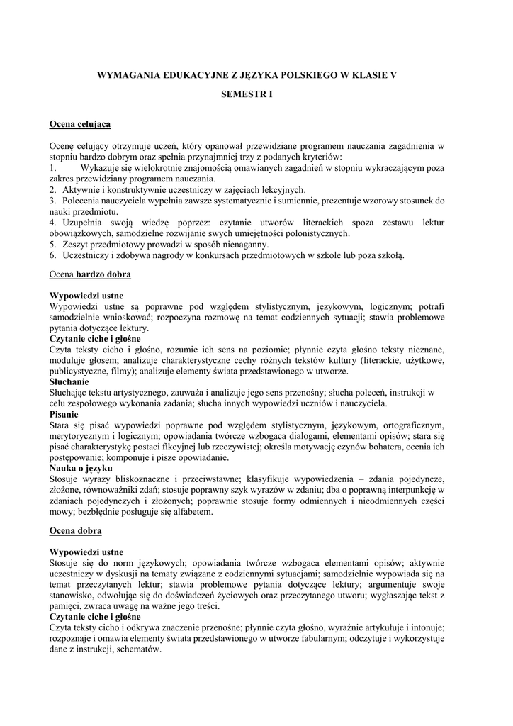 WYMAGANIA EDUKACYJNE Z JĘZYKA POLSKIEGO W KLASIE V SEMESTR I Ocena celująca Ocenę celujący otrzymuje uczeń, który opanował przewidziane programem nauczania zagadnienia w stopniu bardzo dobrym oraz spełnia przynajmniej trzy z podanych kryteriów: 1. Wykazuje się wielokrotnie znajomością omawianych zagadnień w stopniu wykraczającym poza zakres przewidziany programem nauczania. 2. Aktywnie i konstruktywnie uczestniczy w zajęciach lekcyjnych. 3. Polecenia nauczyciela wypełnia zawsze systematycznie i sumiennie, prezentuje wzorowy stosunek do nauki przedmiotu. 4. Uzupełnia swoją wiedzę poprzez: czytanie utworów literackich spoza zestawu lektur obowiązkowych, samodzielne rozwijanie swych umiejętności polonistycznych. 5. Zeszyt przedmiotowy prowadzi w sposób nienaganny. 6. Uczestniczy i zdobywa nagrody w konkursach przedmiotowych w szkole lub poza szkołą. Ocena bardzo dobra Wypowiedzi ustne Wypowiedzi ustne są poprawne pod względem stylistycznym, językowym, logicznym; potrafi samodzielnie wnioskować; rozpoczyna rozmowę na temat codziennych sytuacji; stawia problemowe pytania dotyczące lektury. Czytanie ciche i głośne Czyta teksty cicho i głośno, rozumie ich sens na poziomie; płynnie czyta głośno teksty nieznane, moduluje głosem; analizuje charakterystyczne cechy różnych tekstów kultury (literackie, użytkowe, publicystyczne, filmy); analizuje elementy świata przedstawionego w utworze. Słuchanie Słuchając tekstu artystycznego, zauważa i analizuje jego sens przenośny; słucha poleceń, instrukcji w celu zespołowego wykonania zadania; słucha innych wypowiedzi uczniów i nauczyciela. Pisanie Stara się pisać wypowiedzi poprawne pod względem stylistycznym, językowym, ortograficznym, merytorycznym i logicznym; opowiadania twórcze wzbogaca dialogami, elementami opisów; stara się pisać charakterystykę postaci fikcyjnej lub rzeczywistej; określa motywację czynów bohatera, ocenia ich postępowanie; komponuje i pisze opowiadanie. Nauka o języku Stosuje wyrazy bliskoznaczne i przeciwstawne; klasyfikuje wypowiedzenia – zdania pojedyncze, złożone, równoważniki zdań; stosuje poprawny szyk wyrazów w zdaniu; dba o poprawną interpunkcję w zdaniach pojedynczych i złożonych; poprawnie stosuje formy odmiennych i nieodmiennych części mowy; bezbłędnie posługuje się alfabetem. Ocena dobra Wypowiedzi ustne Stosuje się do norm językowych; opowiadania twórcze wzbogaca elementami opisów; aktywnie uczestniczy w dyskusji na tematy związane z codziennymi sytuacjami; samodzielnie wypowiada się na temat przeczytanych lektur; stawia problemowe pytania dotyczące lektury; argumentuje swoje stanowisko, odwołując się do doświadczeń życiowych oraz przeczytanego utworu; wygłaszając tekst z pamięci, zwraca uwagę na ważne jego treści. Czytanie ciche i głośne Czyta teksty cicho i odkrywa znaczenie przenośne; płynnie czyta głośno, wyraźnie artykułuje i intonuje; rozpoznaje i omawia elementy świata przedstawionego w utworze fabularnym; odczytuje i wykorzystuje dane z instrukcji, schematów. Słuchanie Słucha poleceń, instrukcji, innych wypowiedzi uczniów i nauczyciela w celu sporządzania samodzielnych notatek; wybiera i wykorzystuje informacje ze słyszanego tekstu dla stworzenia własnej wypowiedzi. Pisanie Korzystając pomocy nauczyciela, buduje spójne wypowiedzi; stosuje właściwe słownictwo i struktury składniowe; redaguje teksty użytkowe, takie, jak przepis; pisze jak najpełniejszą charakterystykę postaci literackiej; podaje cechy wyglądu, osobowości i charakteru; notuje informacje w wybranej formie; tworzy plan ramowy; stosuje charakterystyczne elementy świata przedstawionego w opowiadaniu, baśni, legendzie; dba o poprawność językową, ortograficzną i interpunkcyjną. Nauka o języku Stosuje w zdaniu wyrazy bliskoznaczne; wykorzystuje wybrane związki frazeologiczne pochodzenia biblijnego i mitologicznego, przysłowia; rozpoznaje i nazywa rodzaje wypowiedzeń – pojedyncze; stosuje zasady interpunkcji zdania pojedynczego; poprawnie stosuje odmienne i nieodmienne części mowy, trafnie nazywa ich funkcję w zdaniu; rozpoznaje i nazywa różne typy liczebników; posługuje się alfabetem; stosuje wiadomości dotyczące różnicy między wymową a zapisem samogłosek nosowych, głosek dźwięcznych i bezdźwięcznych, poprawnie zapisuje zmiękczenia; rozpoznaje wyrazy bezakcentowe. Ocena dostateczna Wypowiedzi ustne Uczestniczy w sytuacji komunikacyjnej; angażuje się w rozmowę na określony temat; buduje kilkuzdaniowe wypowiedzi ustne; opowiada, używając odpowiednio dobranego słownictwa; buduje wypowiedzi o charakterze prośby; używa odpowiedniego słownictwa, formułując zaproszenie, prośbę; wygłasza z pamięci teksty poetyckie, zmienia tempo posługuje się pauzą; pracuje nad poprawnością językową wypowiedzi; doskonali umiejętności komunikacji werbalnej, stosując się do zaleceń nauczyciela. Czytanie ciche i głośne Rozumie ogólny sens tekstów czytanych cicho i głośno, zauważa ich sens metaforyczny; płynnie czyta głośno; rozróżnia teksty poetyckie; rozumie podstawowe pojęcia związane ze światem przedstawionym w utworze fabularnym; wyszukuje, rozpoznaje i rozumie informacje zawarte w instrukcji, notatce . Słuchanie Rozumie sens słyszanych wcześniej poleceń, instrukcji, innych wypowiedzi; selekcjonuje i wykorzystuje usłyszane informacje w samodzielnie tworzonym tekście. Pisanie Pisze opowiadanie z dialogiem, opis, zaproszenie; opisuje cechy zewnętrzne i wewnętrzne postaci fikcyjnej lub rzeczywistej; zapisuje najważniejsze informacje w formie kilku zdań, wpisu danych w tabelę; pisze streszczenie utworu; tworzy plan ramowy; stosuje zasady ortografii i interpunkcji; stosuje zasady estetycznego zapisu oraz organizacji i kompozycji wypowiedzi pisemnej. Nauka o języku Dopisuje wyrazy bliskoznaczne, wyjaśnia znaczenie i pochodzenie wybranych frazeologizmów biblijnych i 