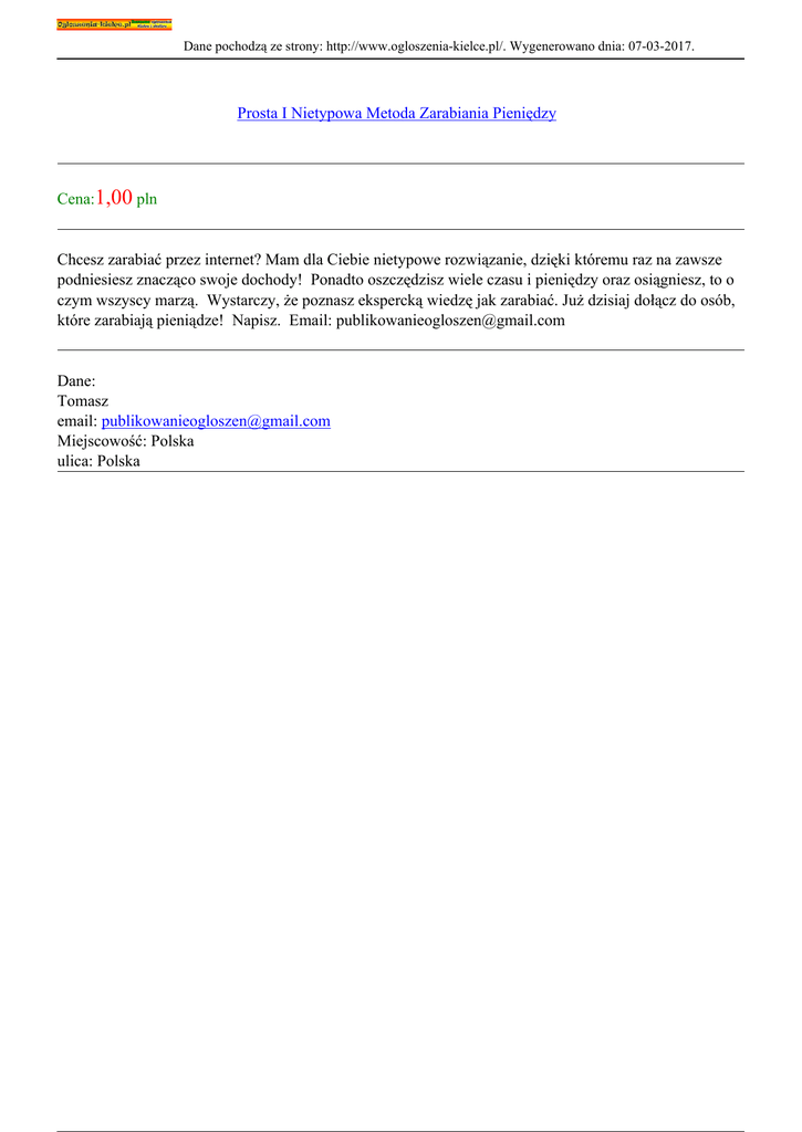 Dane pochodzą ze strony: http://www.ogloszenia-kielce.pl/. Wygenerowano dnia: 07-03-2017. Prosta I Nietypowa Metoda Zarabiania Pieniędzy Cena:1,00 pln Chcesz zarabiać przez internet? Mam dla Ciebie nietypowe rozwiązanie, dzięki któremu raz na zawsze podniesiesz znacząco swoje dochody! Ponadto oszczędzisz wiele czasu i pieniędzy oraz osiągniesz, to o czym wszyscy marzą. Wystarczy, że poznasz ekspercką wiedzę jak zarabiać. Już dzisiaj dołącz do osób, które zarabiają pieniądze! Napisz. Email: [email protected] Dane: Tomasz email: [email protected] Miejscowość: Polska ulica: Polska
