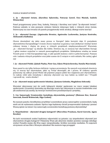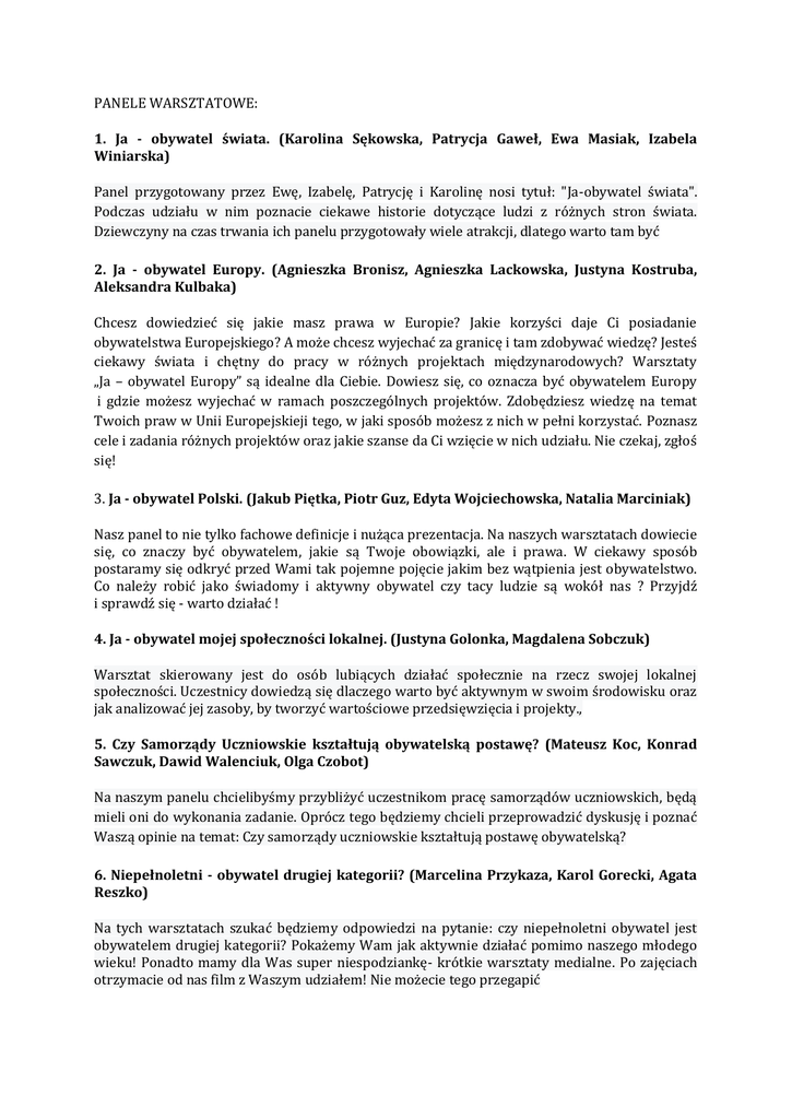 PANELE WARSZTATOWE: 1. Ja - obywatel świata. (Karolina Sękowska, Patrycja Gaweł, Ewa Masiak, Izabela Winiarska) Panel przygotowany przez Ewę, Izabelę, Patrycję i Karolinę nosi tytuł: "Ja-obywatel świata". Podczas udziału w nim poznacie ciekawe historie dotyczące ludzi z różnych stron świata. Dziewczyny na czas trwania ich panelu przygotowały wiele atrakcji, dlatego warto tam być 2. Ja - obywatel Europy. (Agnieszka Bronisz, Agnieszka Lackowska, Justyna Kostruba, Aleksandra Kulbaka) Chcesz dowiedzieć się jakie masz prawa w Europie? Jakie korzyści daje Ci posiadanie obywatelstwa Europejskiego? A może chcesz wyjechać za granicę i tam zdobywać wiedzę? Jesteś ciekawy świata i chętny do pracy w różnych projektach międzynarodowych? Warsztaty „Ja – obywatel Europy” są idealne dla Ciebie. Dowiesz się, co oznacza być obywatelem Europy i gdzie możesz wyjechać w ramach poszczególnych projektów. Zdobędziesz wiedzę na temat Twoich praw w Unii Europejskieji tego, w jaki sposób możesz z nich w pełni korzystać. Poznasz cele i zadania różnych projektów oraz jakie szanse da Ci wzięcie w nich udziału. Nie czekaj, zgłoś się! 3. Ja - obywatel Polski. (Jakub Piętka, Piotr Guz, Edyta Wojciechowska, Natalia Marciniak) Nasz panel to nie tylko fachowe definicje i nużąca prezentacja. Na naszych warsztatach dowiecie się, co znaczy być obywatelem, jakie są Twoje obowiązki, ale i prawa. W ciekawy sposób postaramy się odkryć przed Wami tak pojemne pojęcie jakim bez wątpienia jest obywatelstwo. Co należy robić jako świadomy i aktywny obywatel czy tacy ludzie są wokół nas ? Przyjdź i sprawdź się - warto działać ! 4. Ja - obywatel mojej społeczności lokalnej. (Justyna Golonka, Magdalena Sobczuk) Warsztat skierowany jest do osób lubiących działać społecznie na rzecz swojej lokalnej społeczności. Uczestnicy dowiedzą się dlaczego warto być aktywnym w swoim środowisku oraz jak analizować jej zasoby, by tworzyć wartościowe przedsięwzięcia i projekty., 5. Czy Samorządy Uczniowskie kształtują obywatelską postawę? (Mateusz Koc, Konrad Sawczuk, Dawid Walenciuk, Olga Czobot) Na naszym panelu chcielibyśmy przybliżyć uczestnikom pracę samorządów uczniowskich, będą mieli oni do wykonania zadanie. Oprócz tego będziemy chcieli przeprowadzić dyskusję i poznać Waszą opinie na temat: Czy samorządy uczniowskie kształtują postawę obywatelską? 6. Niepełnoletni - obywatel drugiej kategorii? (Marcelina Przykaza, Karol Gorecki, Agata Reszko) Na tych warsztatach szukać będziemy odpowiedzi na pytanie: czy niepełnoletni obywatel jest obywatelem drugiej kategorii? Pokażemy Wam jak aktywnie działać pomimo naszego młodego wieku! Ponadto mamy dla Was super niespodziankę- krótkie warsztaty medialne. Po zajęciach otrzymacie od nas film z Waszym udziałem! Nie możecie tego przegapić 7. Polityka młodzieżowa - jak być rzecznikiem idei? (Patryk Gąsior, Oktawia Wartacz, Agata Dębska, Julia Barczuk) 8. Pierwsza pomoc jako obowiązek każdego obywatela. (Adam Mazur, Adam Łuka) Chcesz umieć udzielać pierwszej pomocy, opanować emocje podczas sytuacji kryzysowej albo po prostu interesujesz się ratownictwem? Warsztaty z pierwszej pomocy są idealne dla Ciebie. Jako uczestnik nauczysz się wielu sposobów postępowania przy ratowaniu innych, poznasz niezbędny sprzęt oraz na własnej skórze przekonasz się czy umiesz udzielić pomocy rannym osobom. Zajęcia zostaną przeprowadzone przez strażaka z uprawnieniami ratownika.