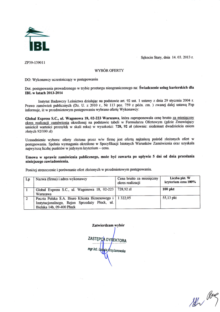 tu trL zP39-13901 Sękocin Stary, dnia 14. 03' 2013 r' 1 WYBOR OFERTY Do: Wykonawcy lczestntcący w postępowaniu DoL postępowania prowadzonego w trybie przetalgu nieograniczonego na: Świadczenie usług kurierskich dla IBL w latach 2013-2014 Ins$tut Badawczy Leśnictwa działając na podstawie arL 92 ust. 1 ustawy z dnia 29 stycznia Żo04 r. Prawo zamówięń publiczrrych (Dz. IJ. z 2oI0 r., Nr 113 poz. 159 Z wźn. zm. ) zwanej dalej ustawą Pzp informuje, tŻ w prze,dmiototł/ym postępowaniu wybrano ofertę Wykonawry: Global Express S.C., ul. Wagonowa !8} tŻ-Ż23 }Yarszawa, która zaproponowała cenę brutto za miesięczny okres realizacji zamówienia ókreśtonei na podstawie tabeli w Formularzu ofertow}m (gdzie Zmawiający wartóści przeslek w skali roku) w wysokości: 728,92 zł (słownie: siedemset dwadzieścia osiem "-iescił ńoĘch92/100 ń) Uzasadnienie wyboru: oferty złoŻorra przez w/w firmę jest ofertą najtańszą pośród ńoŻatych ofert w postępowaniu. Spełnia wymagania określone w Specyfikacji Istotnych Warunków Zamówienia oraz uryskała najwyŻszą liczĘ punktów w jedyn1m kryterium - cena' Umowa w sprawie zamówienia publicznego, może być zawarta po upływie 5 dni od dnia pzesłania niniejszego zawiadomienia Poniżej streszczenie i porównanie ofertńoŻonych w przedmiotorłYm postępowaniu. Cena brutto za miesięczny Lp Nazwa (firma) i adres wykonawry I Global Express S.C., ul. Wagonowa 18, 02'223 Warszawa Ż okres realizacji Poczta Polska S.A. Biuro Klienta Biznesowego i Ins$tucjonalnego, Rejon SprznduĘ Płock, ul. Bielska 14b. 09-400 Płock Liczba pkt. W kryterium cena 1fi)7o '728.9ŻZł 100 pkt L 3Ż2,05 55.13 pkt Zttwierdztm wybór /Wry