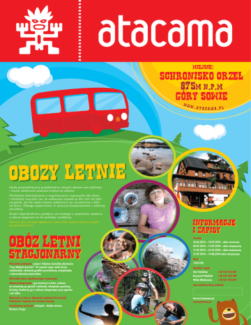 Miejsce: schronisko ORZEL 875m n.p.m Gory Sowie www .atacama.pl Obozy letnie Myślą przewodnią przy projektowaniu naszych obozów jest edukacja i rozwój zdobywane podczas kreatywnej zabawy. Wieloletnie doświadczenie w organizowaniu wypoczynku dla dzieci i młodzieży nauczyło nas, że wakacyjne wyjazdy są dla nich nie tylko przygodą, ale też często czasem spędzanym po raz pierwszy z dala od domu. Dlatego zapewniamy im poczucie bezpieczeństwa i rodzinną atmosferę. Dzięki indywidualnemu podejściu do każdego z uczestników jesteśmy w stanie reagować na ich potrzeby i problemy. Dbamy, aby wakacje spędzone z nami były wspomnieniem samych szczęśliwych chwil. INFORMACJE I ZAPISY Terminy: 26.06.2010 – 10.07.2010 - obóz rowerowy 03.07.2010 – 17.07.2010 - obóz stacjonarny 17.07.2010 – 31.07.2010 - obóz stacjonarny 31.07.2010 – 14.08.2010 obóz stacjonarny Warsztaty plastyczne: znane i lubiane warsztaty plastyczne ”Czas Małych Arystów”. W ramach zajęć: małe formy rzeźbiarskie, elementy grafiki warsztatowej, arteplastyka z różnorodnością materiałów. Warsztaty tańca współczesnego i jazzowego Zabawy integracyjne: gry terenowe w lesie, zabawy na orientację po górach i dolinach, olimpiada sportowa, turnieje, konkursy, gry i zabawy integracyjne przy ognisku i nie tylko. Wycieczki na basen, Wędrówki szlakami Gór Sowich, Podziemia i legendy Gór Sowich, Drezyny Całodzienne wycieczki: Ardspah - skalne miasto, Brumov, Praga Koszt: 1350 PLN Kontakt i zapisy: Ola Pakólska Krzysztof Pakólski Witek Minkiewicz +48 510 130 694 +48 507 032 289 +48 501 185 694 oraz wybrane biura podróży [email protected] www.atacama.pl