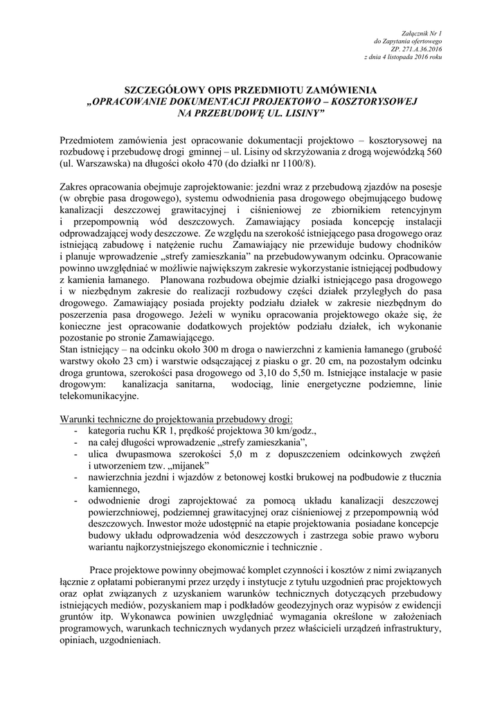 Załącznik Nr 1 do Zapytania ofertowego ZP. 271.A.36.2016 z dnia 4 listopada 2016 roku SZCZEGÓŁOWY OPIS PRZEDMIOTU ZAMÓWIENIA „OPRACOWANIE DOKUMENTACJI PROJEKTOWO – KOSZTORYSOWEJ NA PRZEBUDOWĘ UL. LISINY” Przedmiotem zamówienia jest opracowanie dokumentacji projektowo – kosztorysowej na rozbudowę i przebudowę drogi gminnej – ul. Lisiny od skrzyżowania z drogą wojewódzką 560 (ul. Warszawska) na długości około 470 (do działki nr 1100/8). Zakres opracowania obejmuje zaprojektowanie: jezdni wraz z przebudową zjazdów na posesje (w obrębie pasa drogowego), systemu odwodnienia pasa drogowego obejmującego budowę kanalizacji deszczowej grawitacyjnej i ciśnieniowej ze zbiornikiem retencyjnym i przepompownią wód deszczowych. Zamawiający posiada koncepcję instalacji odprowadzającej wody deszczowe. Ze względu na szerokość istniejącego pasa drogowego oraz istniejącą zabudowę i natężenie ruchu Zamawiający nie przewiduje budowy chodników i planuje wprowadzenie „strefy zamieszkania” na przebudowywanym odcinku. Opracowanie powinno uwzględniać w możliwie największym zakresie wykorzystanie istniejącej podbudowy z kamienia łamanego. Planowana rozbudowa obejmie działki istniejącego pasa drogowego i w niezbędnym zakresie do realizacji rozbudowy części działek przyległych do pasa drogowego. Zamawiający posiada projekty podziału działek w zakresie niezbędnym do poszerzenia pasa drogowego. Jeżeli w wyniku opracowania projektowego okaże się, że konieczne jest opracowanie dodatkowych projektów podziału działek, ich wykonanie pozostanie po stronie Zamawiającego. Stan istniejący – na odcinku około 300 m droga o nawierzchni z kamienia łamanego (grubość warstwy około 23 cm) i warstwie odsączającej z piasku o gr. 20 cm, na pozostałym odcinku droga gruntowa, szerokości pasa drogowego od 3,10 do 5,50 m. Istniejące instalacje w pasie drogowym: kanalizacja sanitarna, wodociąg, linie energetyczne podziemne, linie telekomunikacyjne. Warunki techniczne do projektowania przebudowy drogi: - kategoria ruchu KR 1, prędkość projektowa 30 km/godz., - na całej długości wprowadzenie „strefy zamieszkania”, - ulica dwupasmowa szerokości 5,0 m z dopuszczeniem odcinkowych zwężeń i utworzeniem tzw. „mijanek” - nawierzchnia jezdni i wjazdów z betonowej kostki brukowej na podbudowie z tłucznia kamiennego, - odwodnienie drogi zaprojektować za pomocą układu kanalizacji deszczowej powierzchniowej, podziemnej grawitacyjnej oraz ciśnieniowej z przepompownią wód deszczowych. Inwestor może udostępnić na etapie projektowania posiadane koncepcje budowy układu odprowadzenia wód deszczowych i zastrzega sobie prawo wyboru wariantu najkorzystniejszego ekonomicznie i technicznie . Prace projektowe powinny obejmować komplet czynności i kosztów z nimi związanych łącznie z opłatami pobieranymi przez urzędy i instytucje z tytułu uzgodnień prac projektowych oraz opłat związanych z uzyskaniem warunków technicznych dotyczących przebudowy istniejących mediów, pozyskaniem map i podkładów geodezyjnych oraz wypisów z ewidencji gruntów itp. Wykonawca powinien uwzględniać wymagania określone w założeniach programowych, warunkach technicznych wydanych przez właścicieli urządzeń infrastruktury, opiniach, uzgodnieniach. Załącznik Nr 1 do Zapytania ofertowego ZP. 271.A.36.2016 z dnia 4 listopada 2016 roku Wykonawca zobowiązany jest do sygnalizowania problemów wynikających z realizacji zamówienia na każdym etapie oraz czynnie uczestniczyć w spotkaniach z nimi związanych i rozwiązywaniu trudności. Projekt w fazie wstępnej i ostatecznej należy przedstawić w Wydziale Infrastruktury i Inwestycji Urzędu Miasta Rypin celem uzyskania jego akceptacji. Obszar planowanej inwestycji nie jest objęty aktualnie obowiązującym miejscowym planem zagospodarowania przestrzennego. Obszar planowanej inwestycji nie wkracza na obszary bezpośredniego zagrożenia powodzią. Obszar inwestycji nie podlega ochronie na podstawie przepisów o ochronie środowiska czy o ochronie przyrody, w bezpośrednim sąsiedztwie brak jest też obiektów czy terenów objętych ochroną na podstawie tych przepisów. Teren planowanej inwestycji nie jest wpisany do rejestru zabytków. Ponieważ w terminie ustalonym w art. 39 ust. 6 pkt. 2 ustawy z dnia 21 marca 1985 r. o drogach publicznych nie zgłoszono zainteresowania udostępnieniem kanału technologicznego nie planuje się budowy kanał technologicznego. Zakres prac Wykonawcy obejmuje: 1. Pozyskanie map do celów projektowych w skali 1:500. Mapa do celów projektowych powinna zawierać aktualne granice działek, wjazdy i ogrodzenia w obrębie opracowania. 2. Wykonanie dokumentacji geotechnicznej podłoża gruntowego – 2 egz. w wersji papierowej + 1 egz. wersja elektroniczna w formacie PDF na płycie CD. 3. Uzyskanie wszelkich opinii, decyzji, uzgodnień i oświadczeń niezbędnych do realizacji przedmiotu 4. Opracowanie projektów budowlanych – 6 egz. w wersji papierowej + wersja elektroniczna w formacie PDF na płycie CD wraz z wszystkimi niezbędnymi branżami: drogową, sanitarną, elektryczną i innymi opracowaniami niezbędnymi do wykonania kompletnego przedmiotu zamówienia, w tym projektami branżowymi wynikłymi z ewentualnych kolizji bądź też wymaganiami określonymi w warunkach technicznych, uzgodnieniach czy opiniach właścicieli infrastruktury technicznej (dla zakresu przebudowy obowiązującego zarządcę drogi) . 5. Opracowanie projektów wykonawczych – 6 egz. w wersji papierowej + wersja elektroniczna w formacie PDF na płycie CD – 1 egz. wraz z wszystkimi niezbędnymi branżami: drogową, sanitarną, elektryczną i innymi opracowaniami niezbędnymi do wykonania kompletnego przedmiotu zamówienia, w tym projektami branżowymi wynikłymi z ewentualnych kolizji bądź też wymagań określonych w warunkach technicznych, uzgodnieniach czy opiniach właścicieli infrastruktu