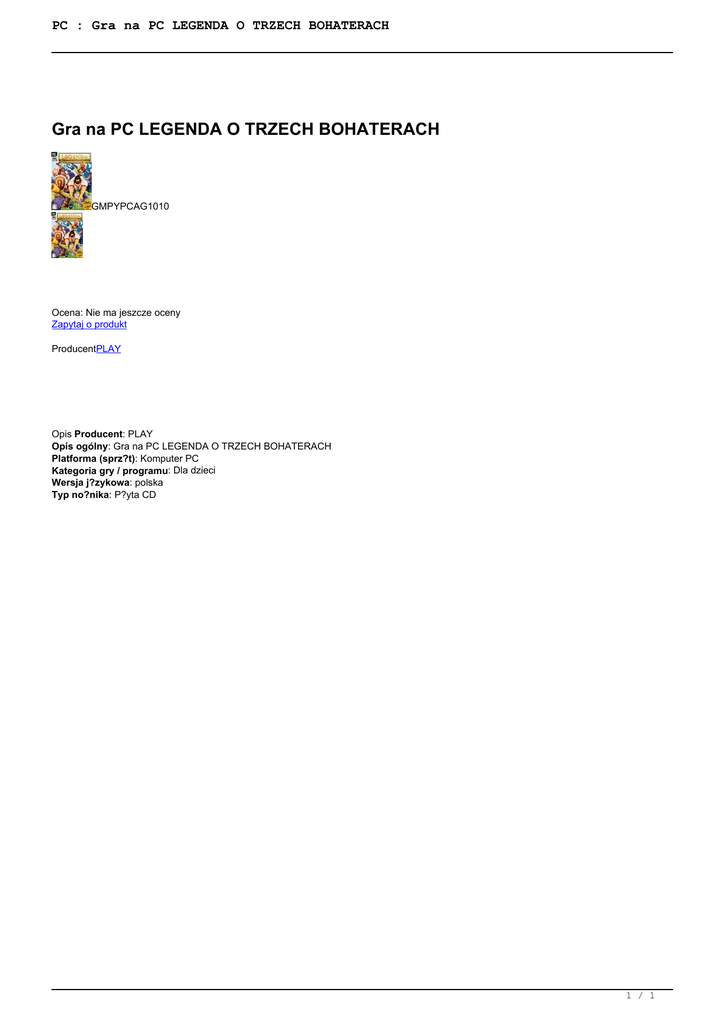 PC : Gra na PC LEGENDA O TRZECH BOHATERACH Gra na PC LEGENDA O TRZECH BOHATERACH GMPYPCAG1010 Ocena: Nie ma jeszcze oceny Zapytaj o produkt ProducentPLAY Opis Producent: PLAY Opis ogólny: Gra na PC LEGENDA O TRZECH BOHATERACH Platforma (sprz?t): Komputer PC Kategoria gry / programu: Dla dzieci Wersja j?zykowa: polska Typ no?nika: P?yta CD 1 / 1 Powered by TCPDF (www.tcpdf.org)