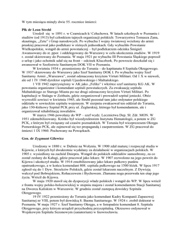 W tym miesiącu minęły dwie 55. rocznice śmierci: Płk dr Leon Strehl Urodził się w 1891 r. w Czarnicach k/ Człuchowa. W latach szkolnych w Poznaniu i studiów (od 1913) był członkiem tajnych organizacji polskich: Towarzystwa Tomasza Zana, skautingu, „Zetu” i Grup narodowych. Po wybuchu I wojny światowej wcielony do armii pruskiej pracował jako podlekarz w różnych jednostkach. Gdy wybuchło Powstanie Wielkopolskie, wstąpił do armii powstańczej – był podlekarzem odcinka Śmigieł. Awansowany do st. ppor. i oddelegowany do Warszawy w celu ukończenia studiów. W 1919 r. został skierowany do Poznania. W maju 1921 po wybuchu III Powstania Śląskiego poprosił o urlop i jako ochotnik udał się na front – odcinek Kluczbork. Po powrocie doszkalał się i awansował w Szefostwie Sanitarnym DOK VII w Poznaniu. W kwietniu 1934 r. przeniesiony do Torunia – do kapitanatu 8 Szpitala Okręgowego. W 1937 skierowany do Warszawy jako Szef Sanitarny DOK I. Po wybuchu wojny Szef Sanitarny Armii „Warszawa”, został odznaczony krzyżem Virtuti Militari. Od 1 X w niewoli, ale od 1 IV 1940 dyrektor szpitali Ujazdowskiego i Maltańskiego. 1 VII 1942 zaprzysiężony w AK jako „Feliks” i wkrótce szef sanitarny KG AK. W powstaniu organizator i komendant szpitali powstańczych. Za ewakuację szpitala Maltańskiego ze Starego Miasta po raz drugi odznaczony krzyżem Virtuti Militari. Po kapitulacji w Stalagu w Zeithain, gdzie zorganizował i prowadził szpital jeniecki. Obóz wyzwolili sowieci w kwietniu 1945, ale Strehl pozostał tam jako ordynator polskiego oddziału w sowieckim szpitalu wojennym. W sierpniu ewakuował ten oddział do Torunia, jako 150-łóżkowy Szpital PCK przy ul. Żeglarskiej, którego był komendantem, ale i organizował rehabilitację inwalidów. W marcu 1946 powołany do WP – szef wydz. Lecznictwa Dep. Sł. Zdr. MON. W 1951 zdemobilizowany. Krótko był wicedyrektorem Instytutu Hematologii, a potem w ZG PCK, z którym był związany od czasów poznańskich. W Toruniu był wiceprezesem Okręgu Pomorskiego PCK, ale zajmował się tez propagandą i zaopatrzeniem. W ZG pracował do śmierci 1 IX 1960. Pochowany na Powązkach. Gen. dr Zygmunt Gilewicz Urodzony w 1880 r. w Dubnie na Wołyniu. W 1900 zdał maturę i rozpoczął studia w Kijowie, z których był dwukrotnie wydalany za działalność w organizacjach polskich. W 1905 r. wysiedlony na zachód Dniepru. Wstąpił do polskich oddziałów samoobrony, za co został zesłany do Kaługi, gdzie pracował jako lekarz. W 1907 zezwolono na jego powrót do Kijowa i ukończył studia. W 1914 zmobilizowany jako lekarz pułkowy punktu opatrunkowego, a w końcu komendant 808. szpitala pułkowego na 1500 łóżek. W lipcu 1917 zgłosił się do 1 Dyw. Strzelców Polskich, gdzie został lekarzem naczelnym. Z Dywizją walczył pod Bobrujskiem, Rohaczewem i Bychowem. Złamana noga przerwała ten etap jego życia. Wrócił do Kijowa. W maju 1920 stawił się do dyspozycji władz polskich i wstąpił do WP. W lipcu wrócił z frontu wojny polsko-bolszewickiej w stopniu majora i został komendantem Stacji Sanitarnej na Dworcu Kaliskim w Warszawie. W grudniu został zastepcą dowódcy Szpitala Okręgowego. 19 IV 1922 przeniesiony do Torunia jako komendant Kadry Kompanii Zapasowej Sanitarnej nr VIII, potem był dowódcą 8. Baonu Sanitarnego. W 1924 r. zrobił doktorat w Poznaniu. W maju 1927 r. Szef Sanitarny Okręgu, a w listopadzie komendant 8. Szpitala Okręgowego, przy którym urządził przychodnię przyszpitalną. Okresowo ordynował w Wojskowym Szpitalu Sezonowym (sanatorium) w Inowrocławiu. W 1929 r. wrócił do Warszawy jako komendant Szkoły Pchorążych Sanitarnych. W 1931 r. przeniesiony na stanowisko dyrektora CIWF (od 1938 AWF). Po wybuchu wojny, będąc w stanie spoczynku, został szefem sanitarnym ZG PCK, z którym związał się w czasie służby w Toruniu. Po kapitulacji został dyr. szpitala PCK przy ul. Smolnej. Zaprzysiężony w AK jako „Narkotyk”, był dyrektorem Wydziału Zdrowia Delegatury Rządu. Mieszkał w Opypach, a jego dom był schronieniem dla „spalonych”. W Powstaniu Warszawskim komendant szpitali zakaźnych. Po kapitulacji uciekł z kolumny ewakuowanych i znowu kierował Szpitalem PCK, który teraz był w Milanówku. W marcu 1946 wrócił na AWF – przez kilka kadencji był dziekanem, w 1947 generałem, rok później profesorem, a od 1959 rektorem – do śmierci 15 IX 1960. Współzałożyciel Sekcji Sanitarnej Towarzystwa Wiedzy Wojskowej. W Toruniu prezes WKS „Gryf” i w Komitecie WFiPW. Wiele publikował. Oprac. Lesław J. Welker