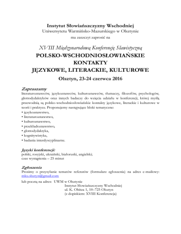Instytut Słowiańszczyzny Wschodniej Uniwersytetu Warmińsko-Mazurskiego w Olsztynie ma zaszczyt zaprosić na XVIII Międzynarodową Konferencję Slawistyczną POLSKO-WSCHODNIOSŁOWIAŃSKIE KONTAKTY JĘZYKOWE, LITERACKIE, KULTUROWE Olsztyn, 23-24 czerwca 2016 Zapraszamy literaturoznawców, językoznawców, kulturoznawców, tłumaczy, filozofów, psychologów, glottodydaktyków oraz innych badaczy do wzięcia udziału w konferencji, której myślą przewodnią są polsko-wschodniosłowiańskie kontakty językowe, literackie i kulturowe w teorii i praktyce. Proponujemy następujące bloki tematyczne: • językoznawstwo, • literaturoznawstwo, • kulturoznawstwo, • przekładoznawstwo, • glottodydaktyka, • kognitywistyka, • badania interdyscyplinarne. Języki konferencji: polski, rosyjski, ukraiński, białoruski, angielski; czas wystąpienia – 25 minut Zgłoszenia Prosimy o przysyłanie tematów referatów (formularz zgłoszenia) na adres e-mailowy: [email protected] lub pocztą na adres: UWM w Olsztynie Instytut Słowiańszczyzny Wschodniej ul. K. Obitza 1, 10–725 Olsztyn (z dopiskiem: XVIII Konferencja) Terminy: Ostateczny termin nadsyłania zgłoszeń – 10 maja 2016 r. Termin wniesienia opłaty konferencyjnej – 31 maja 2016 r. Opłata konferencyjna Opłata za udział w konferencji w wysokości 350 zł obejmuje: publikację referatu po otrzymaniu pozytywnych recenzji w półroczniku Acta Neophilologica (8 punktów) oraz w roczniku Acta Polono-Ruthenica (13 punktów), materiały konferencyjne, a także napoje i przekąski w trakcie obrad, obiad oraz uroczystą kolację w dniu 23 czerwca 2016 r. Wpisowe 350 zł prosimy wpłacać do 31 maja 2015 r. na konto: Uniwersytet Warmińsko-Mazurski w Olsztynie 10-957 Olsztyn, ul. Oczapowskiego 2 NIP 739-30-33-097 Bank Handlowy w Warszawie SA 92 1030 1218 0000 0000 9113 2567 w treści z dopiskiem: Konferencja ISW subkonto 14.880.063-500 Organizatorzy dokonują rezerwacji noclegów w Domu Studenta (nocleg w pokoju 1osobowym — około 100 zł, w pokoju 2-osobowym — około 60 zł). Koszty dojazdu i noclegów ponoszą jednostki delegujące lub sami uczestnicy. Otwarcie konferencji i początek obrad: 23 czerwca 2016 r. godzina 9.30 w sali 37. Bieżące informacje na temat konferencji znajdą Państwo na stronie internetowej http://www.uwm.edu.pl/slowianie/index.php/konferencja a także na: https://www.facebook.com/InstytutSlowianszczyznyWschodniej?fref=ts Rada Naukowa: Prof. dr hab. Walenty Piłat Prof. dr hab. Alla Kamalova Prof. dr hab. Iryna Betko Dr hab. Iwona Anna NDiaye, prof. UWM Dr hab. Irena Rudziewicz, prof. UWM Dr hab. Helena Pociechina, prof. UWM Komitet Organizacyjny: Dr hab. Joanna Orzechowska (Przewodnicząca) Dr Barbara Kozak Dr Joanna Nawacka Dr Izabella Siemianowska Dr Mirosława Czetyrba-Piszczako ZGŁOSZENIE UDZIAŁU w XVIII Międzynarodowej Konferencji Slawistycznej Olsztyn, 23-24 czerwca 2016 Imię i nazwisko (tytuł / stopień naukowy): ………………………………………………………………………………………………………………………… Instytucja / miejsce pracy: ………………………………………………………………………………………………………………………… Temat wystąpienia: ………………………………………………………………………………………………………………………… Adres do korespondencji (instytucji lub prywatny): ………………………………………………………………………………………………………………………… Numer telefonu: Adres e-mail: ………………………………………………………………………………………………………………………… Dane do faktury: ………………………………………………………………………………………………………………………… Rezerwacja noclegu: 22./23.06: TAK/NIE 23./24.06: TAK/NIE pokój jednoosobowy/pokój dwuosobowy 24./25.06: TAK/NIE Streszczenie wystąpienia (do 800 znaków): …………………………………………. PODPIS